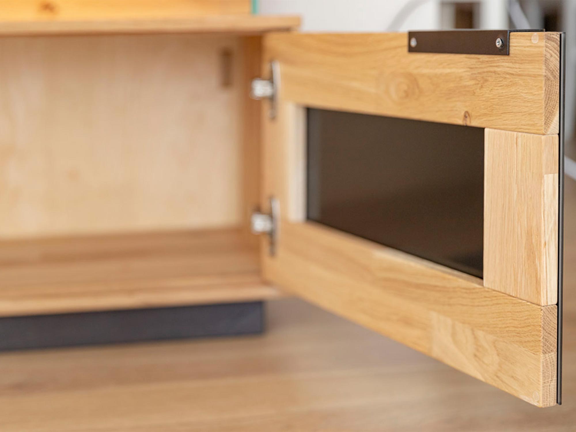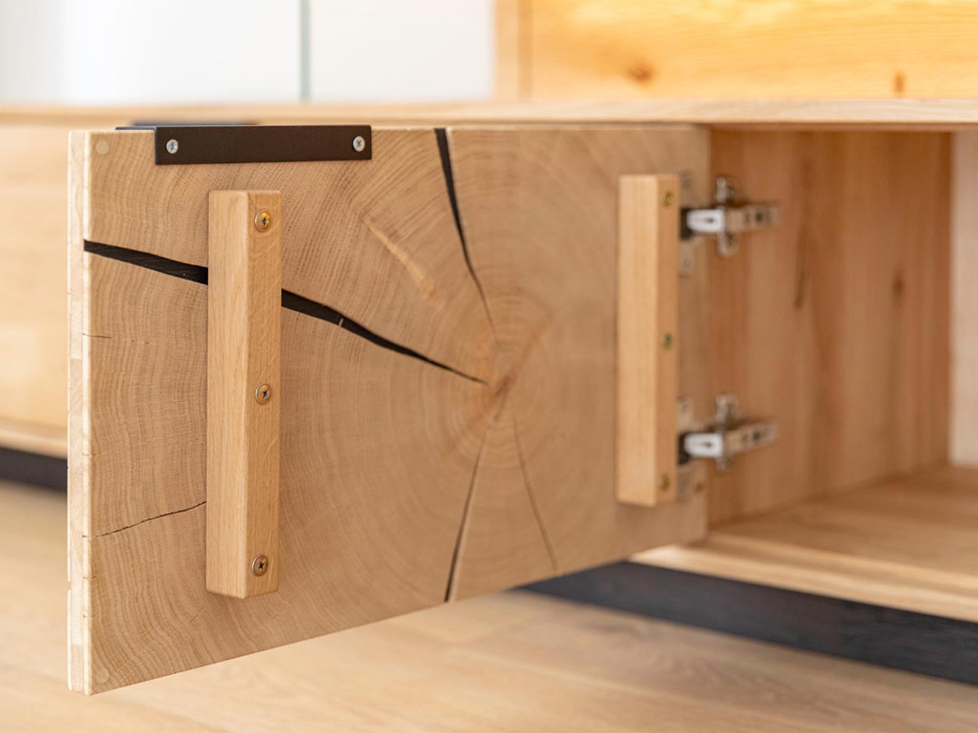 Detal łączenia drewna w nowoczesnej komodzie z metalowym czarnym uchwytem