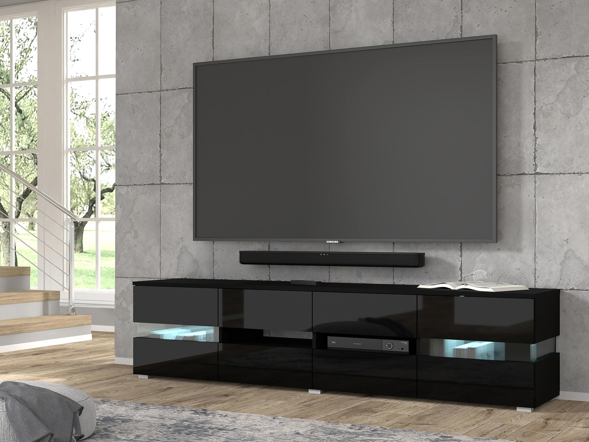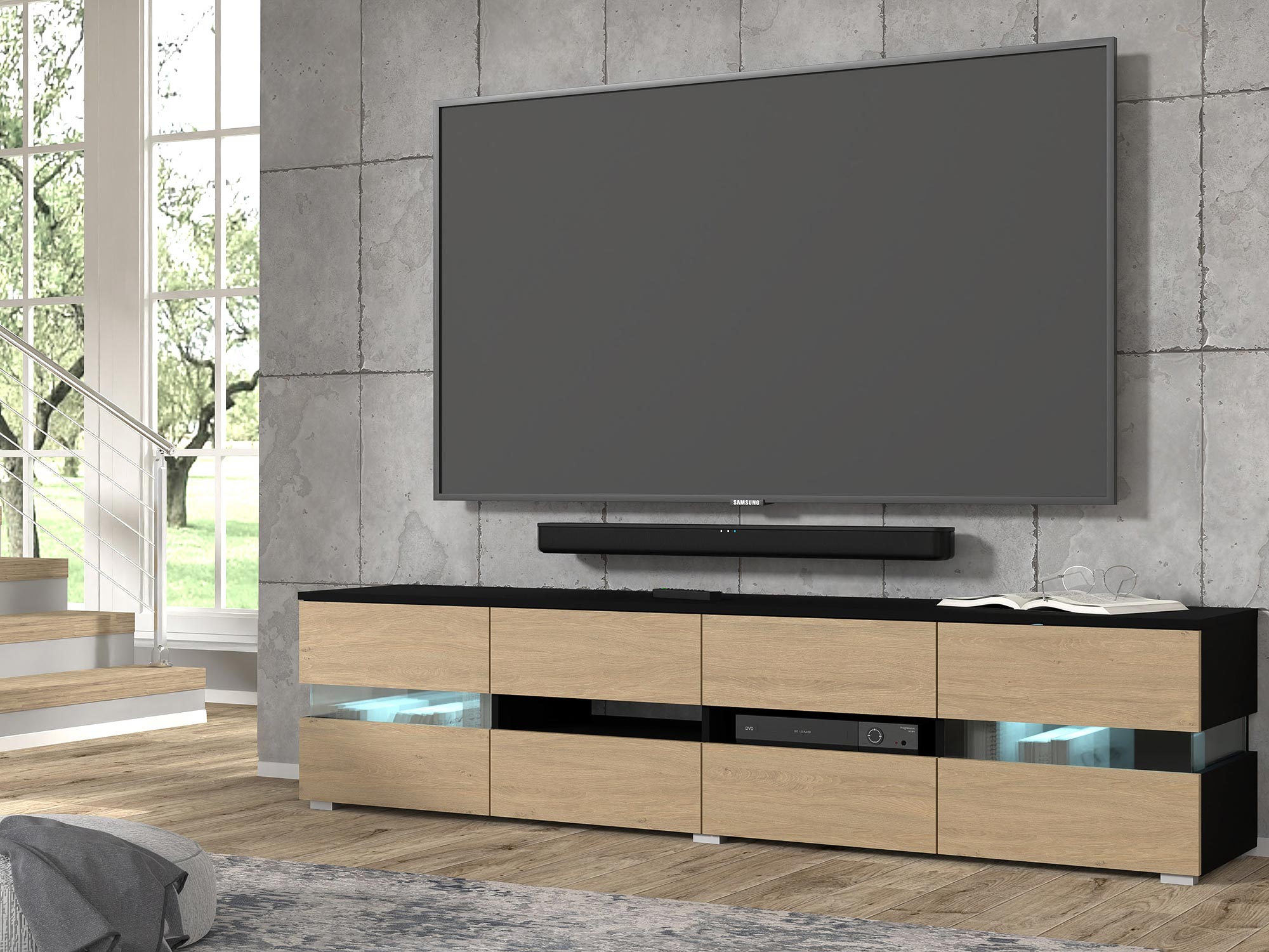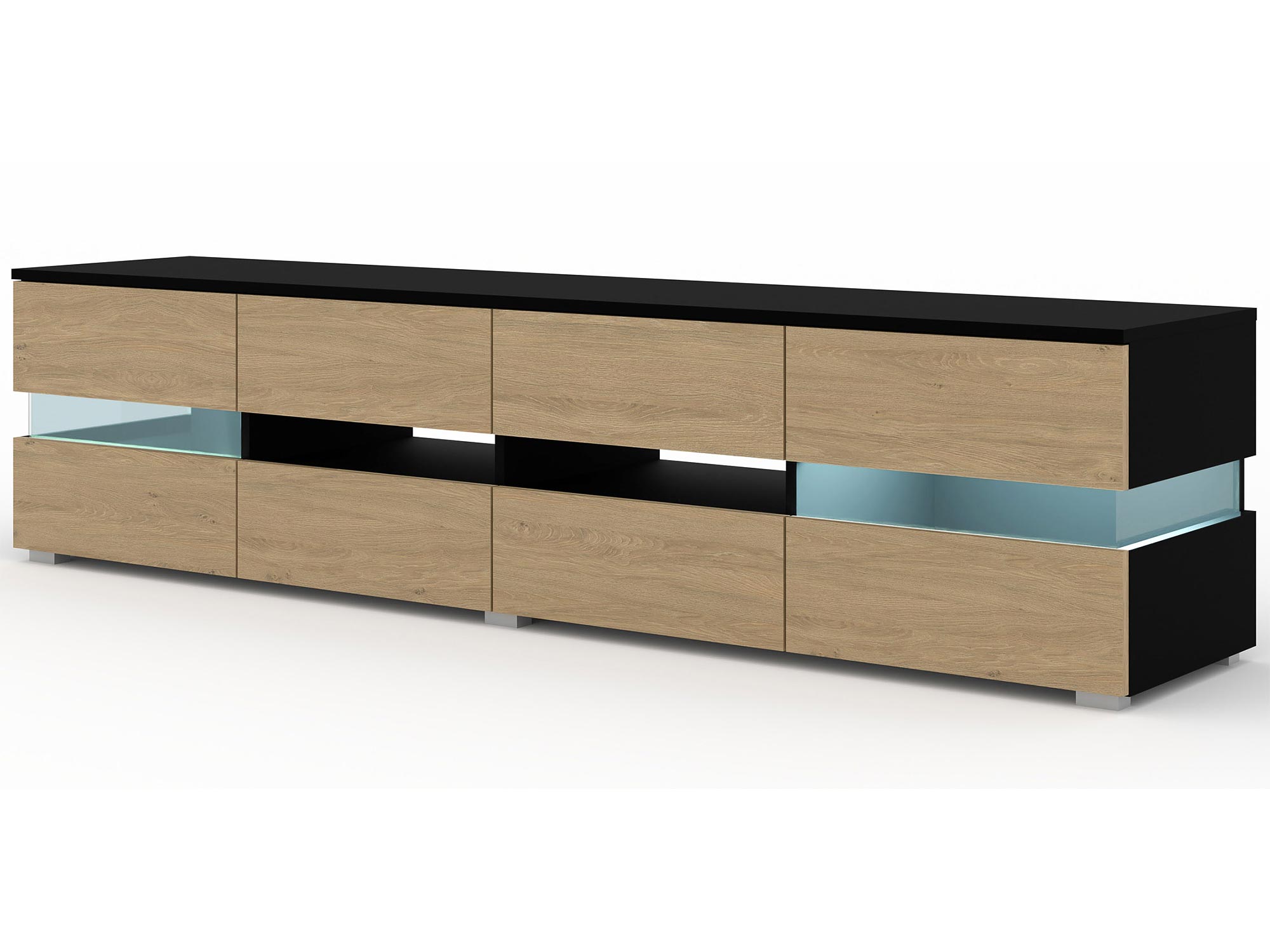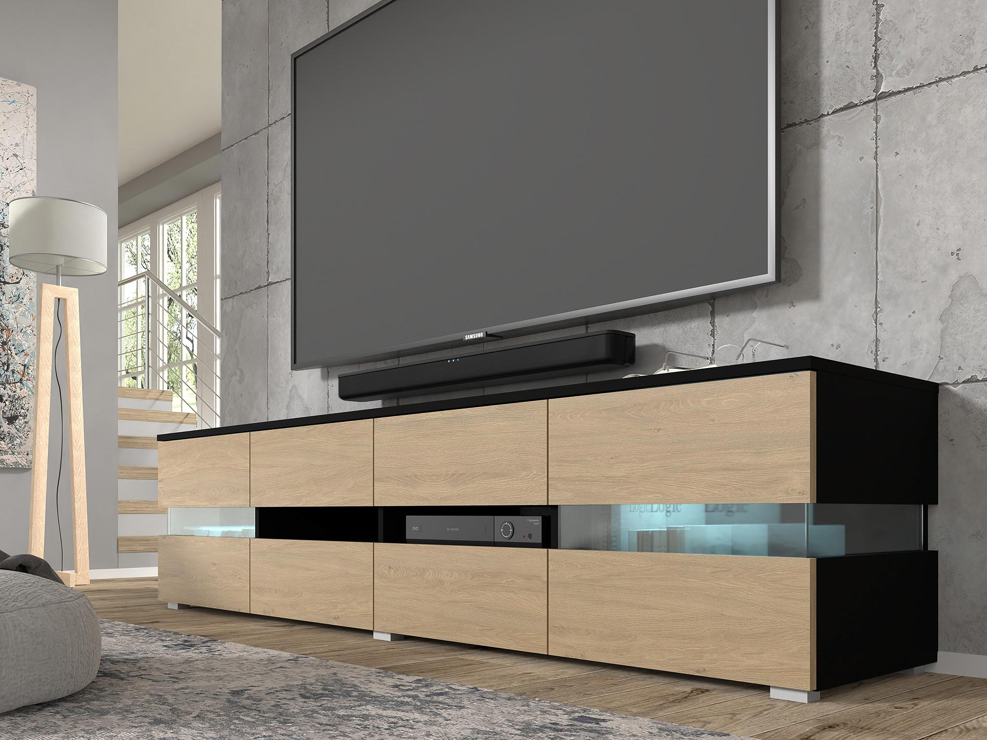 Nowoczesna półka RTV z podświetleniem LED, czarnym korpusem i dębowym blatem w nowoczesnym stylu