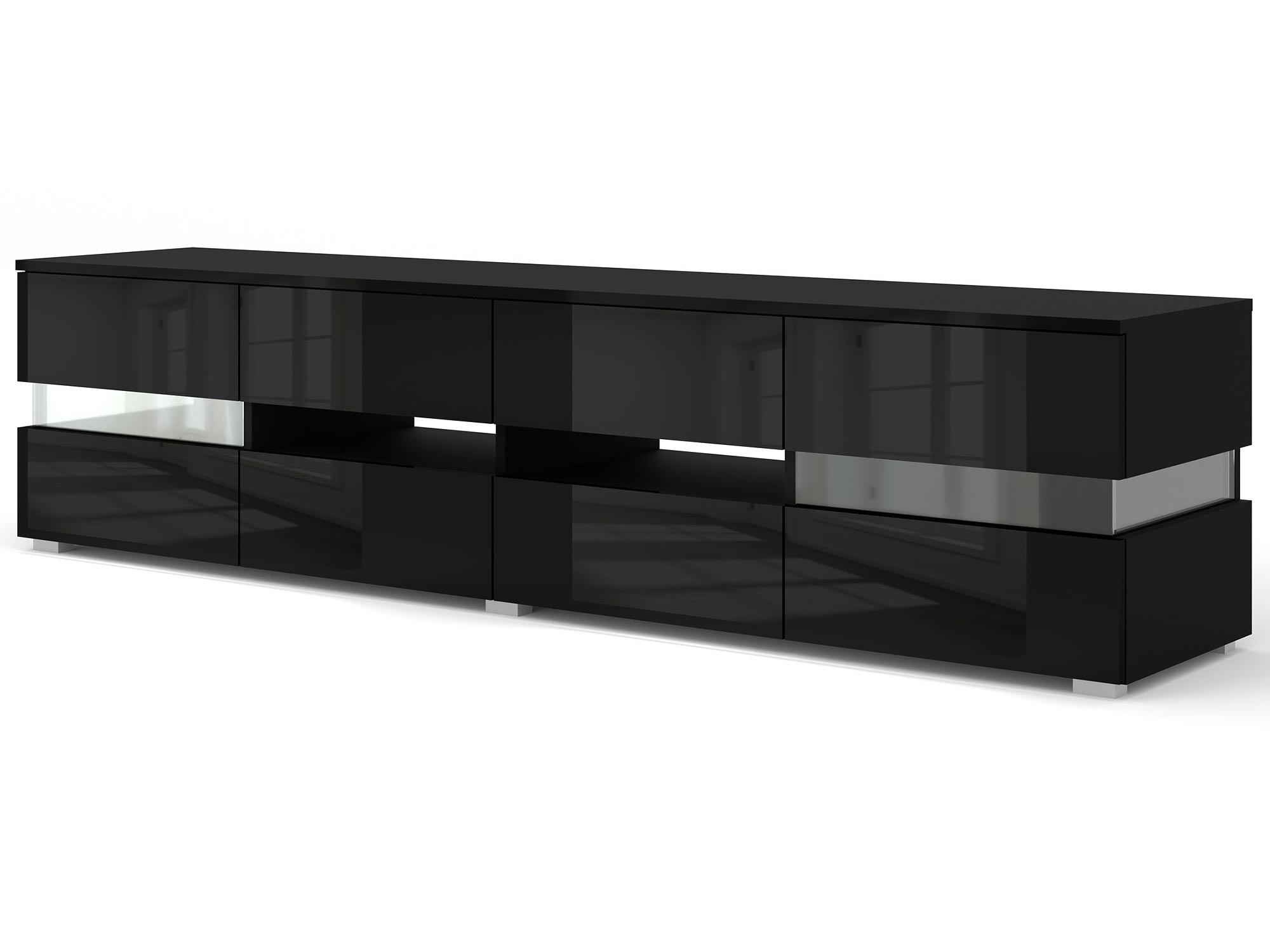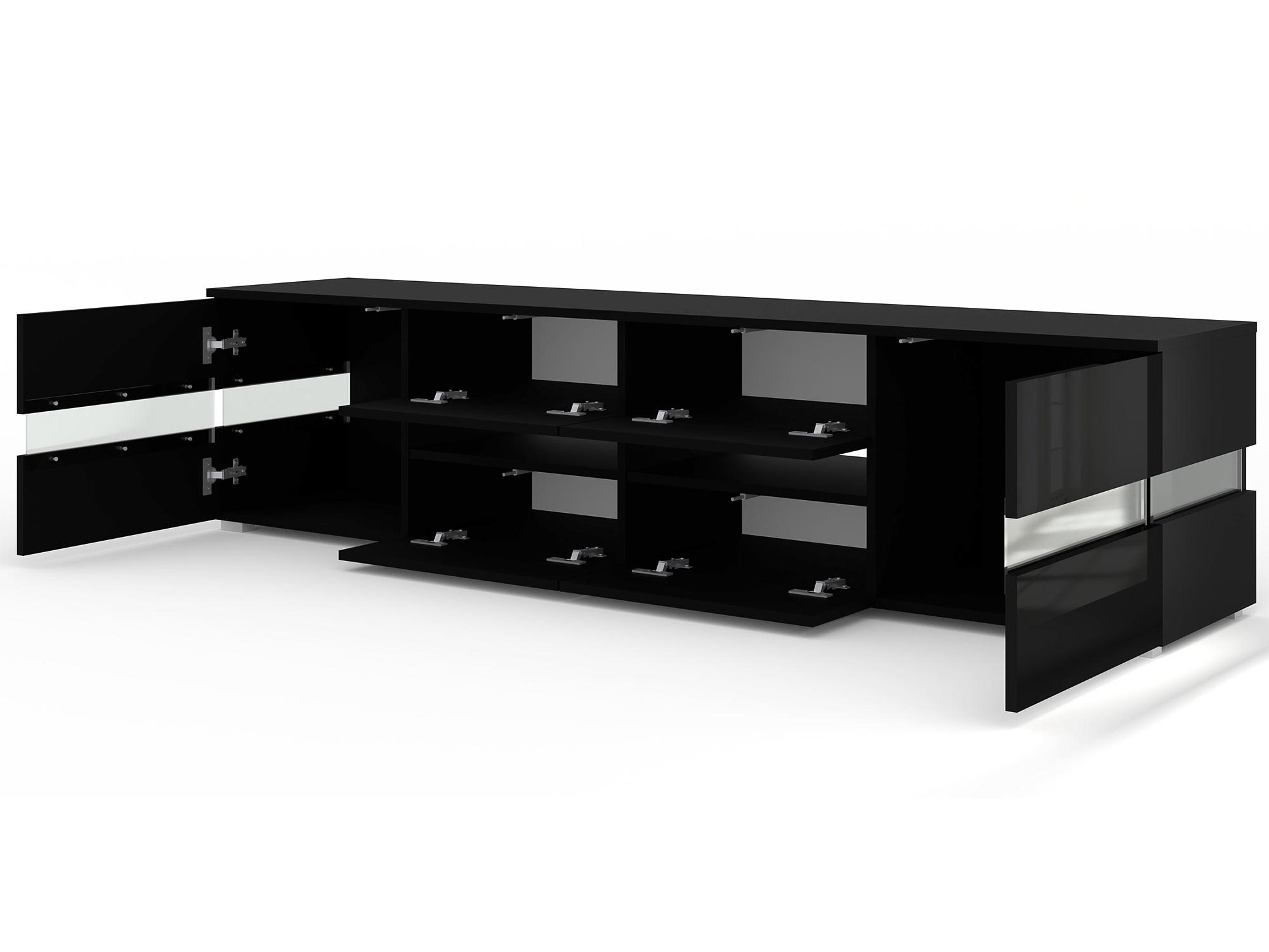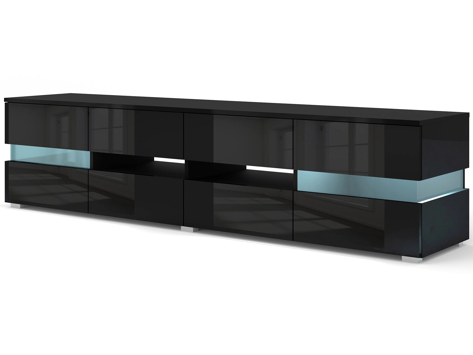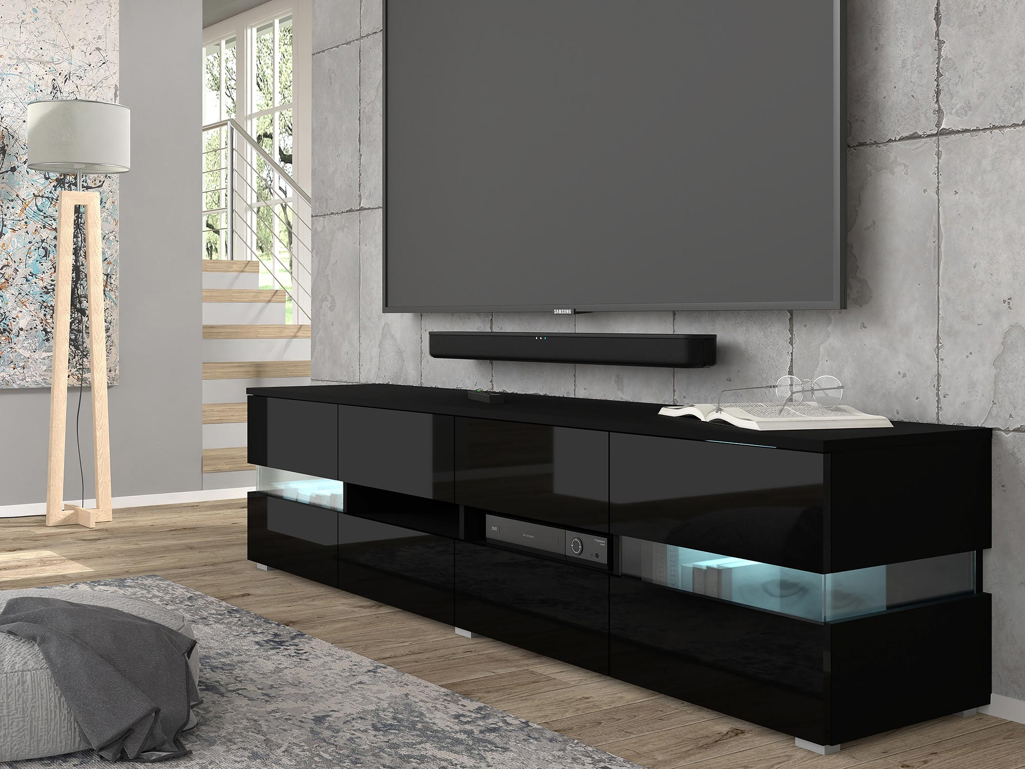 Nowoczesna półka RTV z podświetleniem LED, czarnym korpusem i dębowym blatem w nowoczesnym stylu