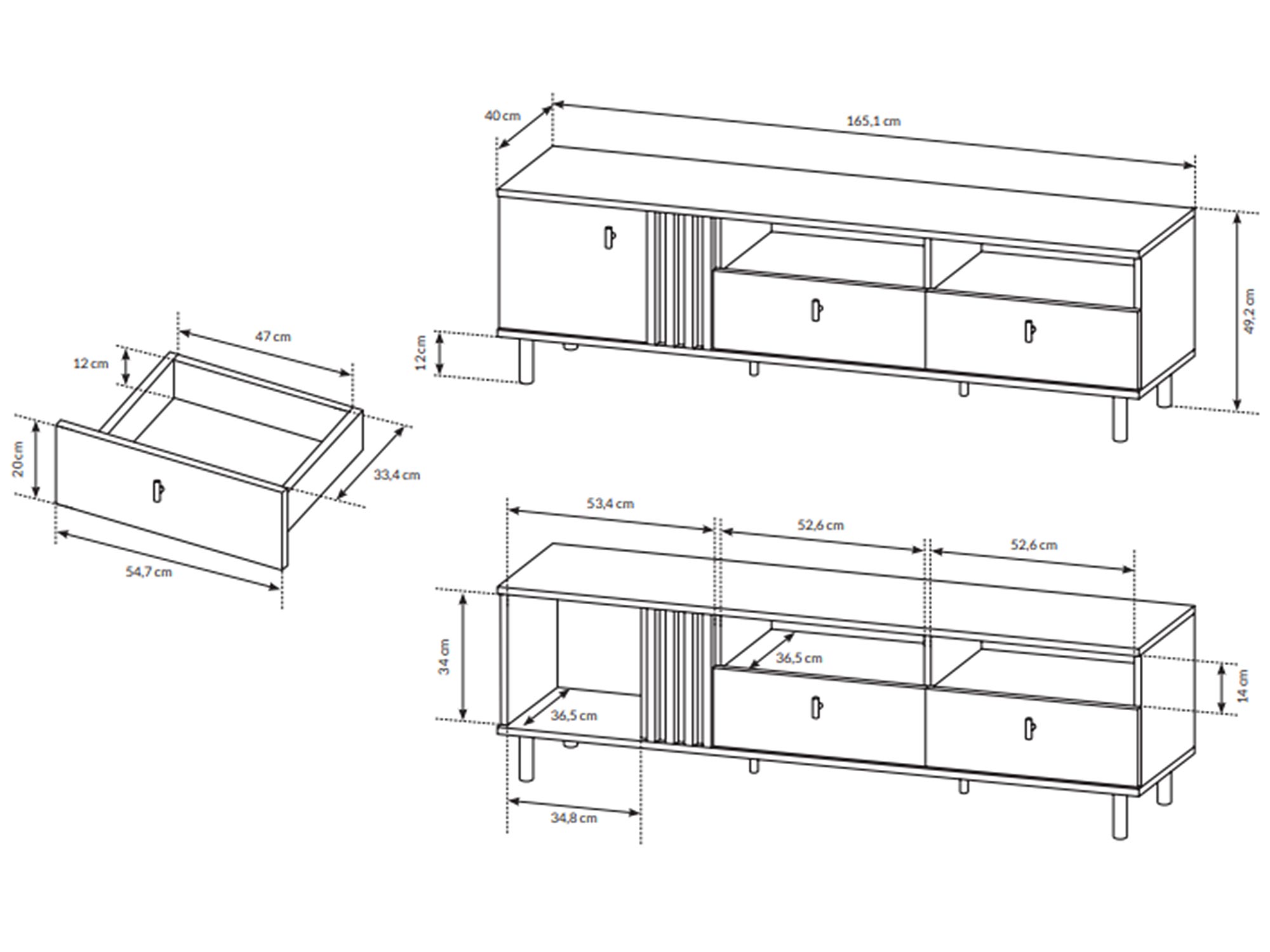 • Wysoka funkcjonalność: Wymiary 165,1 cm szerokości, 49,2 cm wysokości oraz 40 cm głębokości oferują optymalne wykorzystanie przestrzeni, zapewniając doskonałe miejsce na urządzenia RTV i dodatkowe akcesoria.