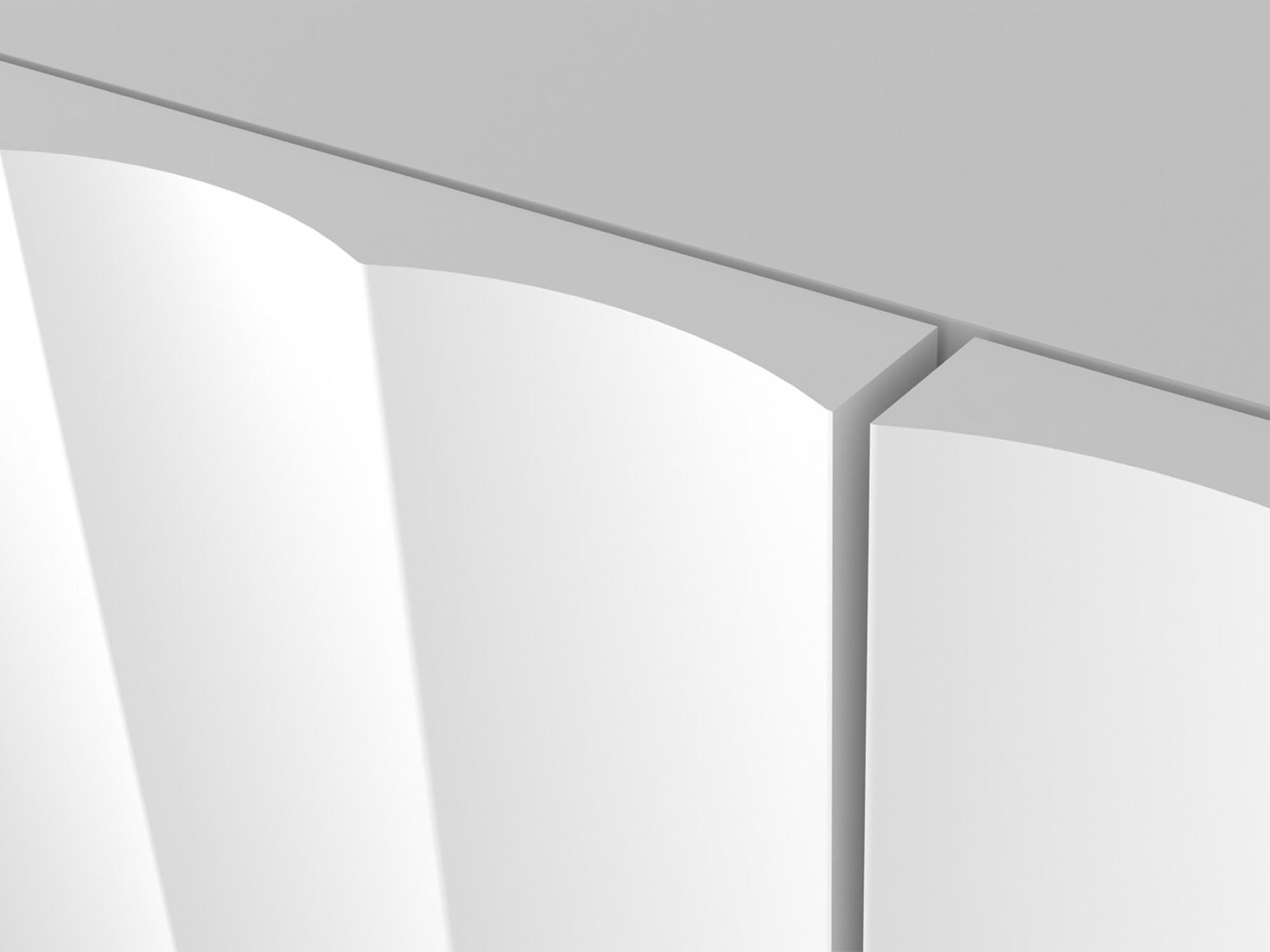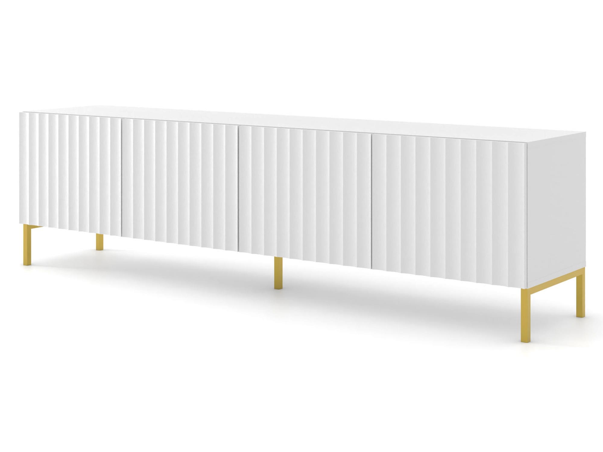 Szafka RTV Mare charakteryzuje się nowoczesnym i eleganckim designem. Korpus wykonany z płyty laminowanej zapewnia trwałość i odporność na codzienne użytkowanie. Frezowane fronty z płyty MDF, pomalowane na biały mat, nadają meblowi nowoczesny wygląd, a złote metalowe nogi dodają mu lekkości i elegancji. Każdy detal szafki został starannie zaprojektowany, aby stworzyć harmonijną i estetyczną całość.