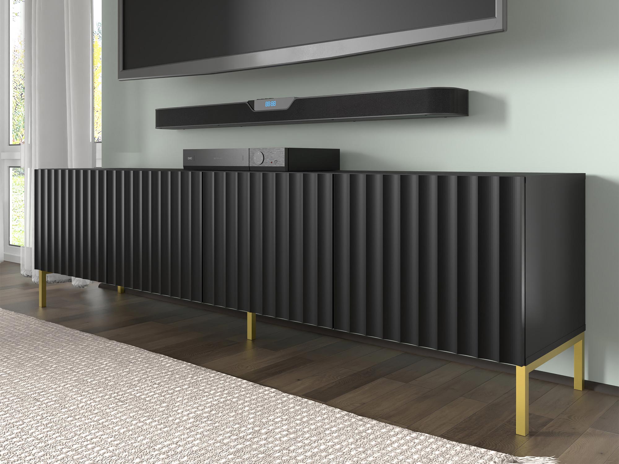 Szafka RTV Mare wyróżnia się dbałością o detale i precyzją wykonania. Frezowane fronty i subtelnie malowane powierzchnie nadają jej nowoczesnego wyglądu, który doskonale komponuje się z różnymi stylami wnętrz. Złote metalowe nogi dodają elegancji, czyniąc szafkę centralnym punktem każdego salonu.