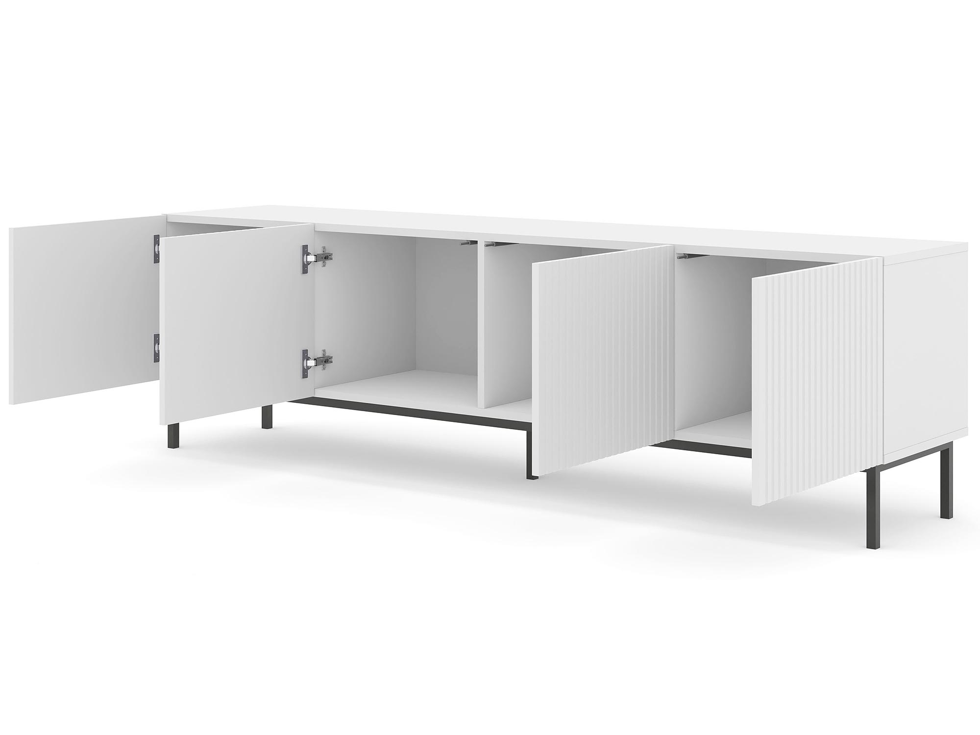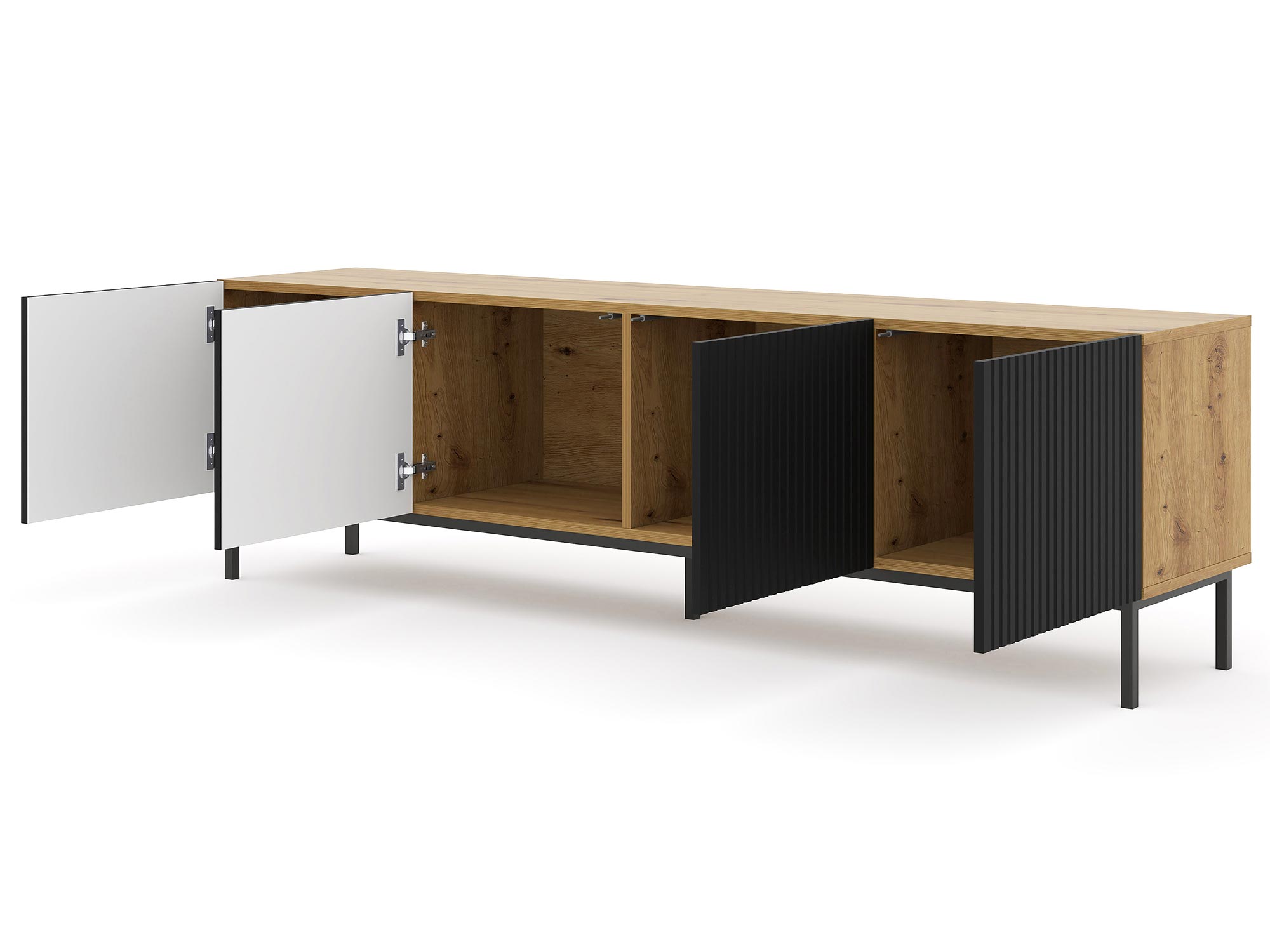 Każdy element Stylowej Szafki Pod TV Navia 200 cm został zaprojektowany z myślą o funkcjonalności. Półki i szuflady zapewniają dużo miejsca do przechowywania, co pozwala na utrzymanie porządku i organizacji w Twoim salonie. Solidne prowadnice gwarantują płynne i ciche otwieranie oraz zamykanie szuflad, co zwiększa komfort użytkowania.
