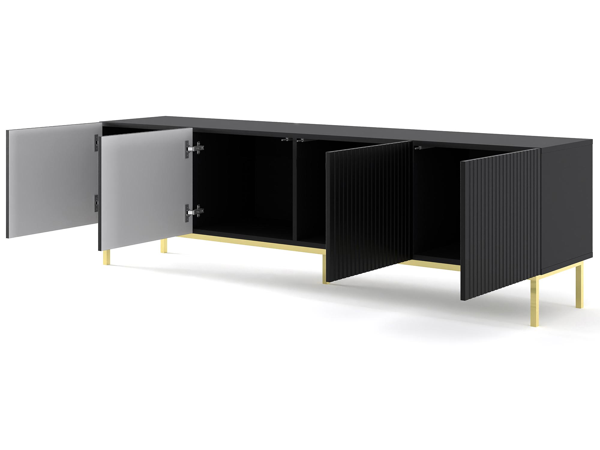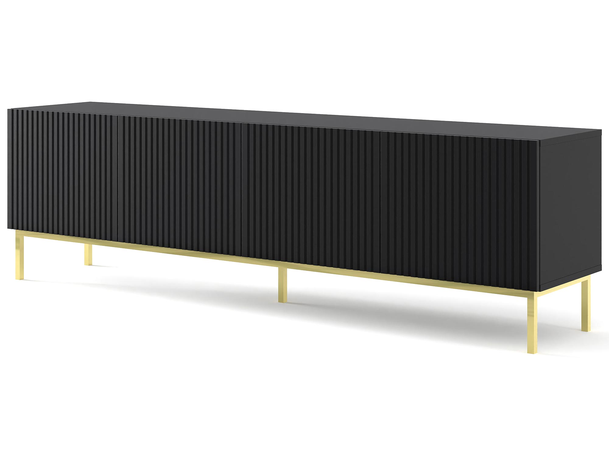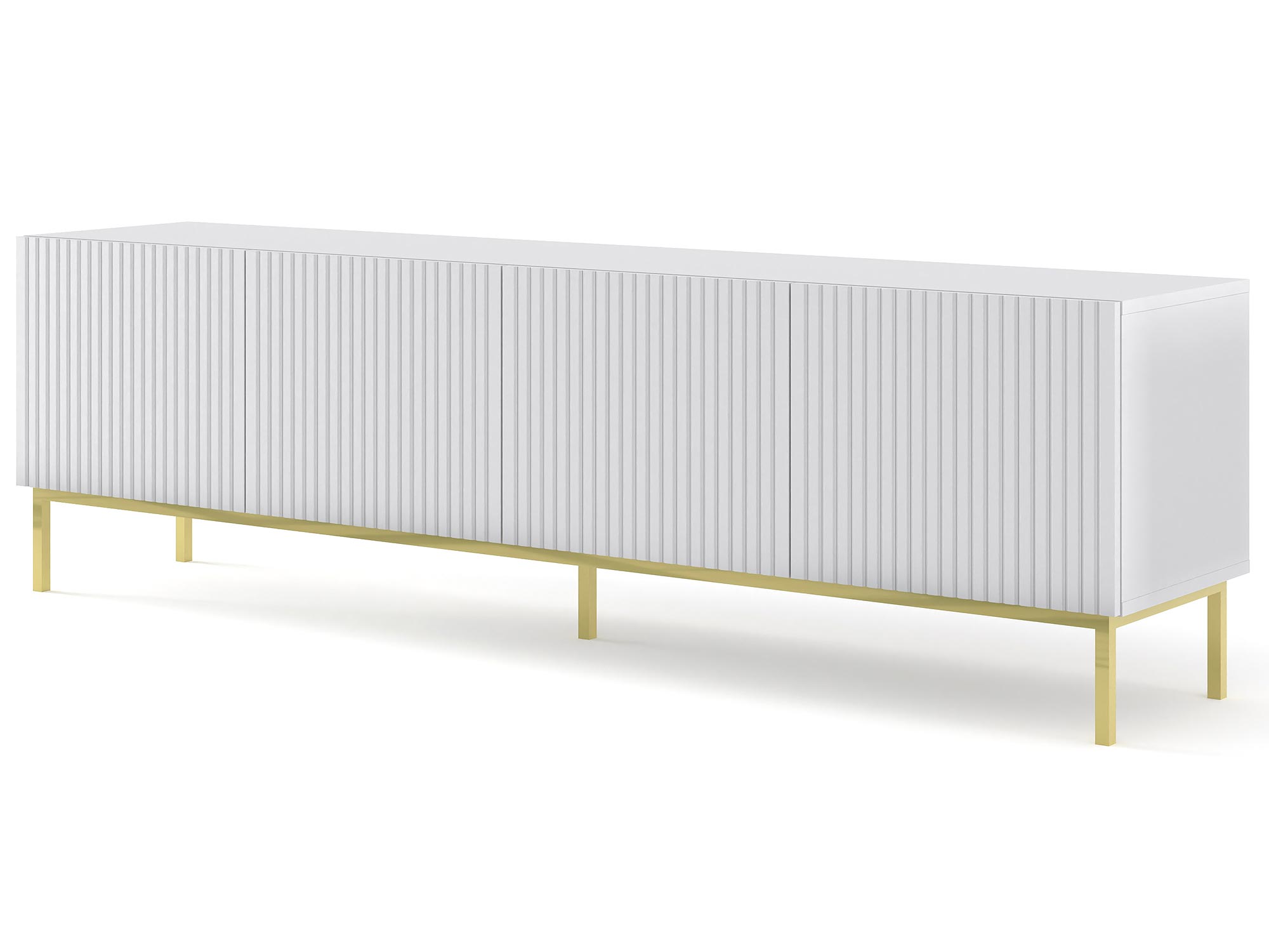 Stylowa Szafka Pod TV Navia 200 cm to mebel, który wprowadzi do Twojego wnętrza nowoczesność i elegancję. Biały matowy korpus i fronty nadają wnętrzu świeżości i lekkości, a złote nóżki dodają mu luksusowego charakteru. Dzięki temu szafka RTV Navia będzie doskonałym uzupełnieniem zarówno minimalistycznych, jak i bardziej klasycznych aranżacji, wnosząc do nich odrobinę nowoczesnego stylu. Wybierz Stylową Szafkę Pod TV Navia 200 cm i ciesz się pięknym oraz praktycznym meblem, który doda Twojemu wnętrzu nowoczesnego charakteru.
