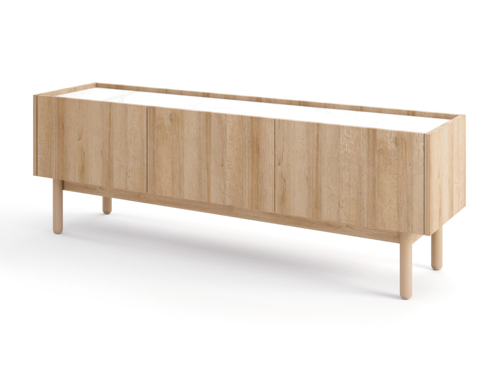 Szafka na Nóżkach RTV 144cm Baro została zaprojektowana z myślą o tych, którzy cenią sobie połączenie nowoczesności z elementami klasyki. Eleganckie usłojenie drewna w połączeniu z subtelnym blaskiem marmuru Bianco nadaje wnętrzom poczucie przestrzeni i otwartości, jednocześnie wprowadzając element luksusu.