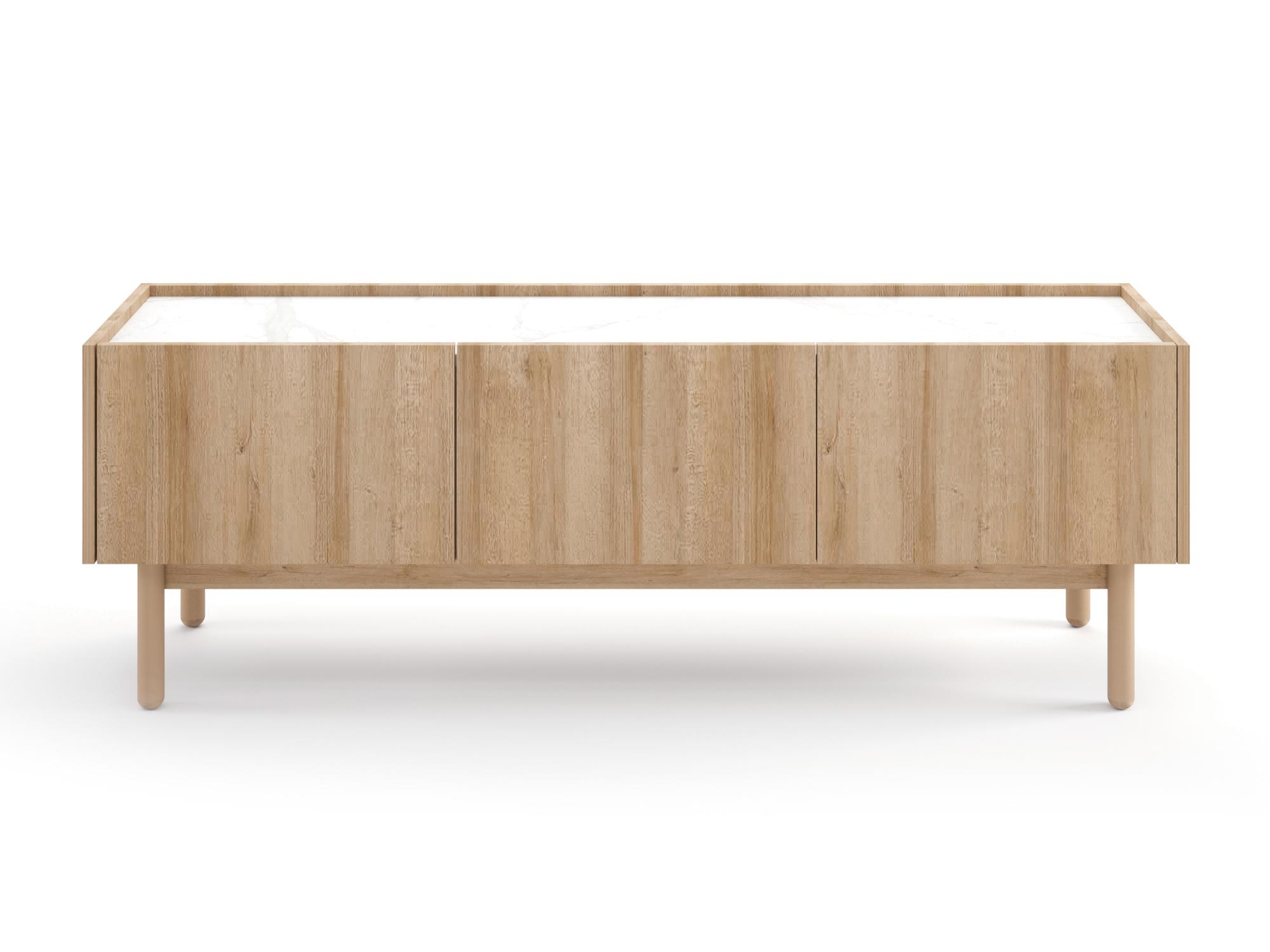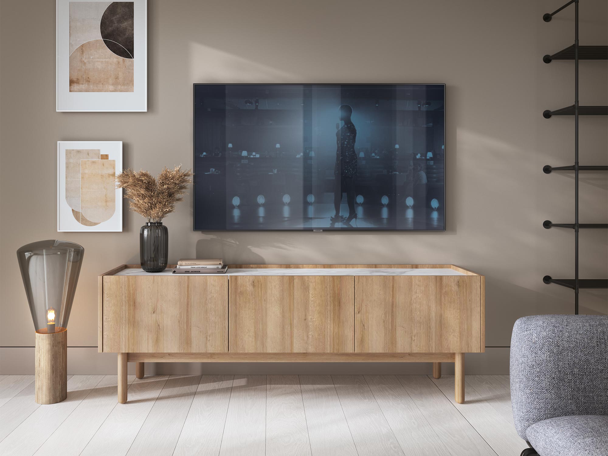 Salon z szeroką dębową komodą pod telewizorem, styl nowoczesny
