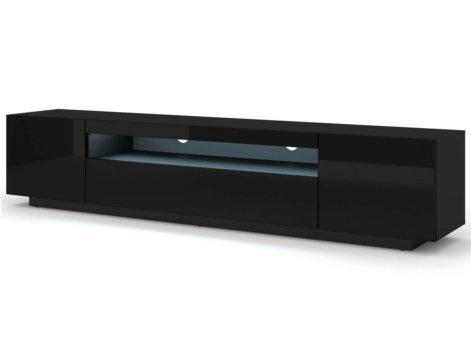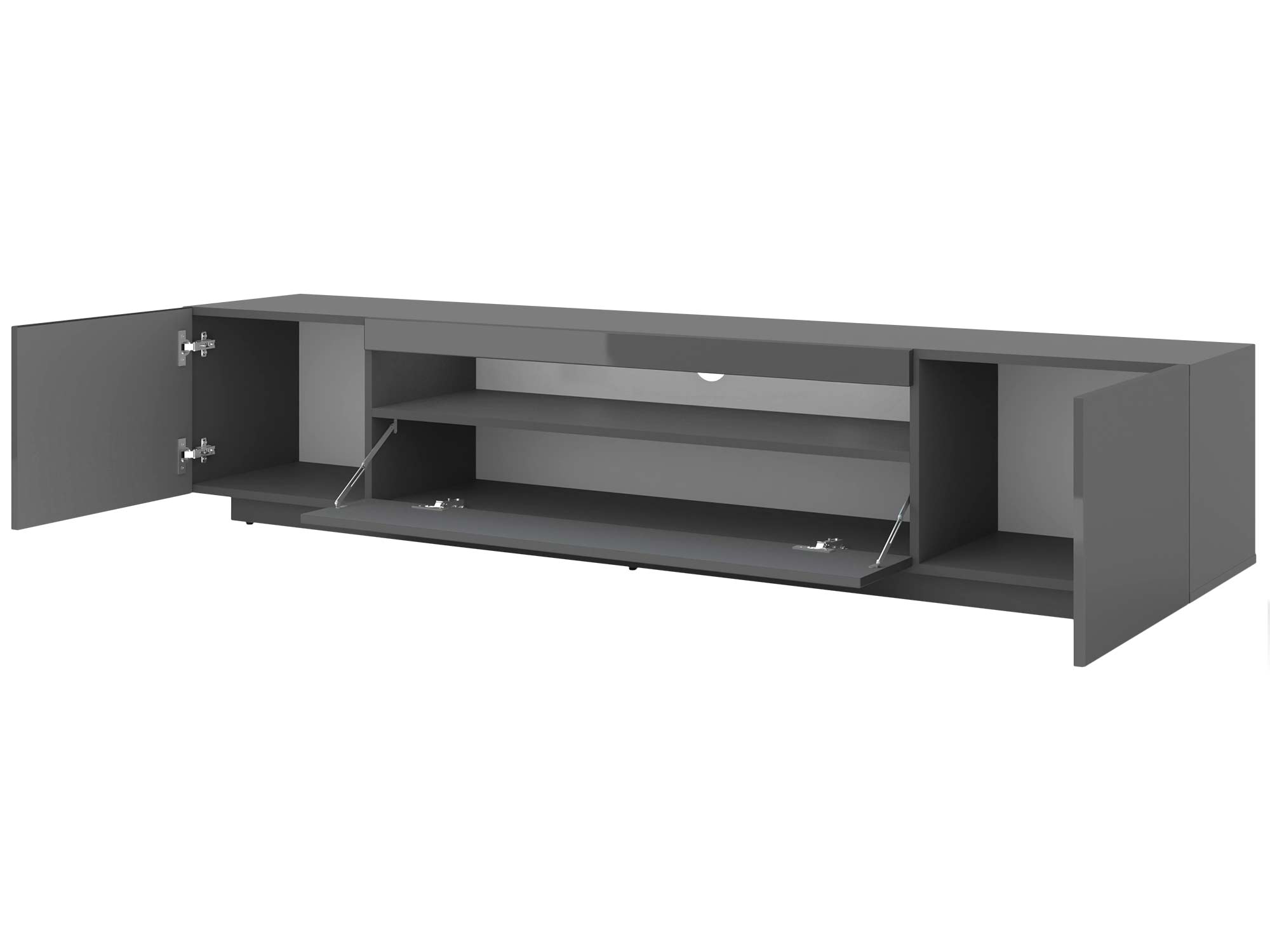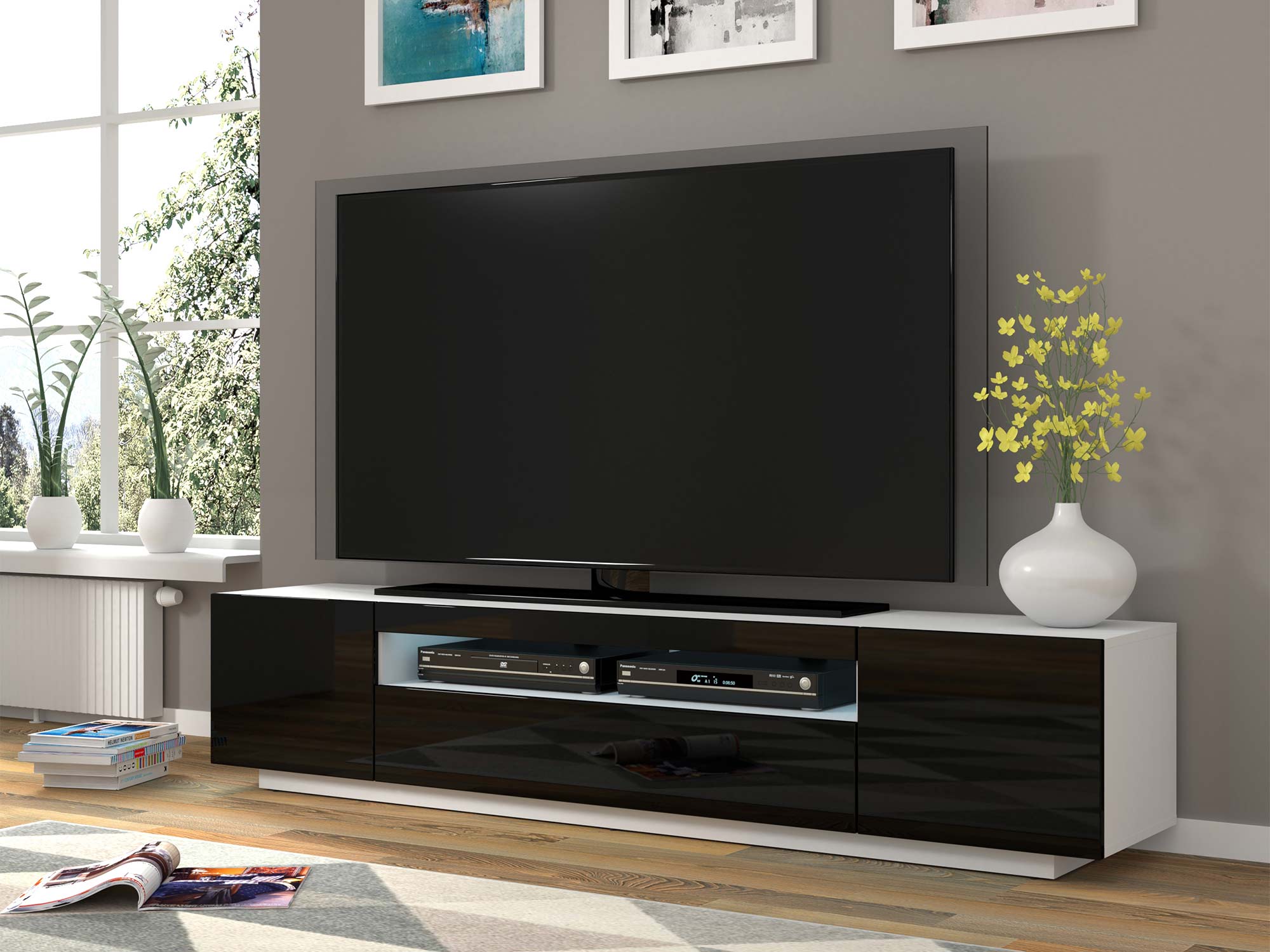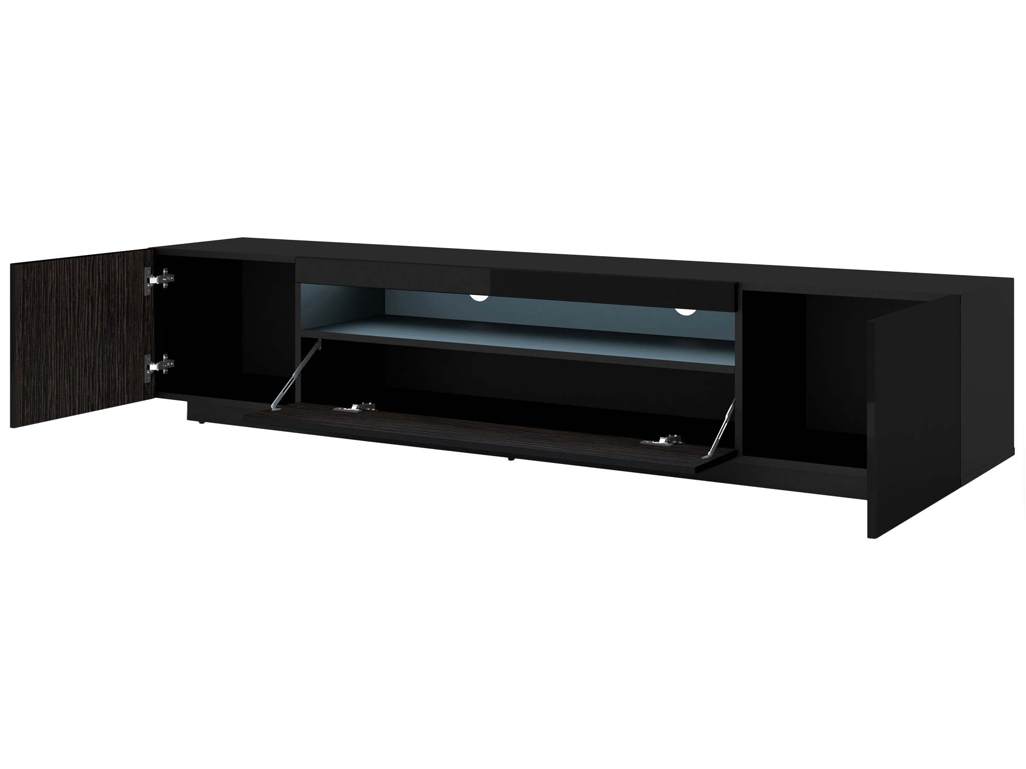 Przede wszystkim oferowana szafka charakteryzuje się nie tylko walorami estetycznymi, ale jest to również mebel bardzo praktyczny. Poza oczywistym miejscem na dekodery czy konsole, szafka posiada kilka zamkniętych półek, co tworzy dodatkową przestrzeń na przechowywanie. Ponadto brak uchwytów to nowoczesne rozwiązanie, które nie przytłacza mebla oraz pozwala na uzyskanie schludnego oraz niezwykle gustownego wnętrza. Dodatkowo klimatu dodaje oświetlenie LED o zimnej barwie, które nadaje wnętrzu uroku i nutę elegancji. Co więcej, szafka posiada na tyle okrągły otwór, który znacznie ułatwia organizację kabli, co zdecydowanie poprawia estetykę całej aranżacji.