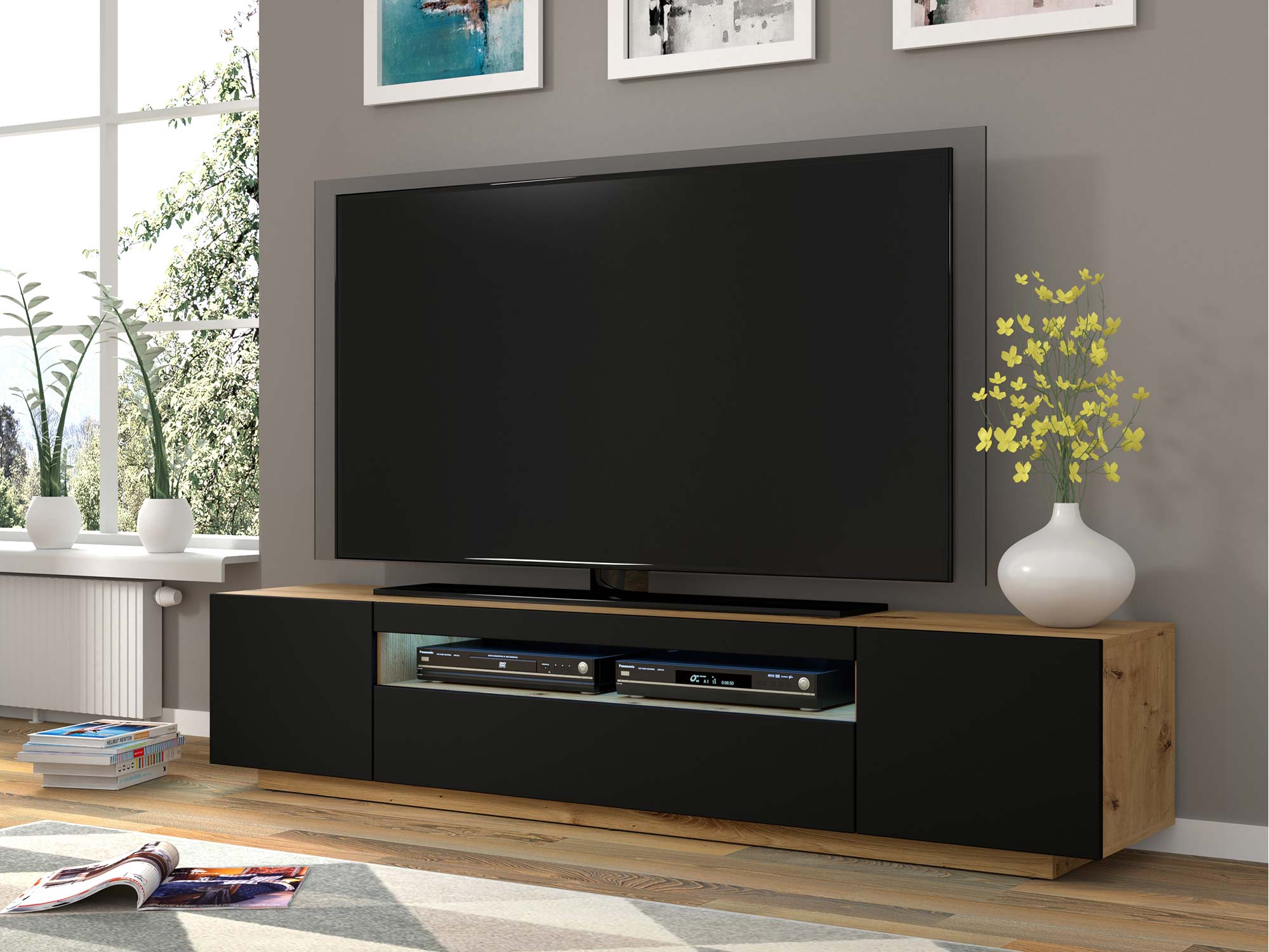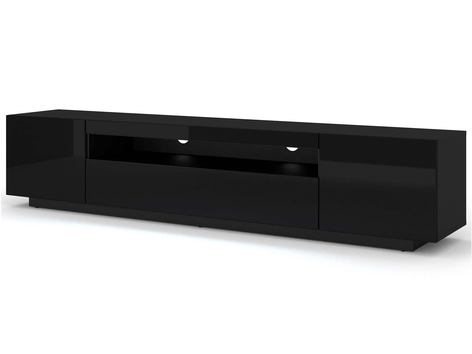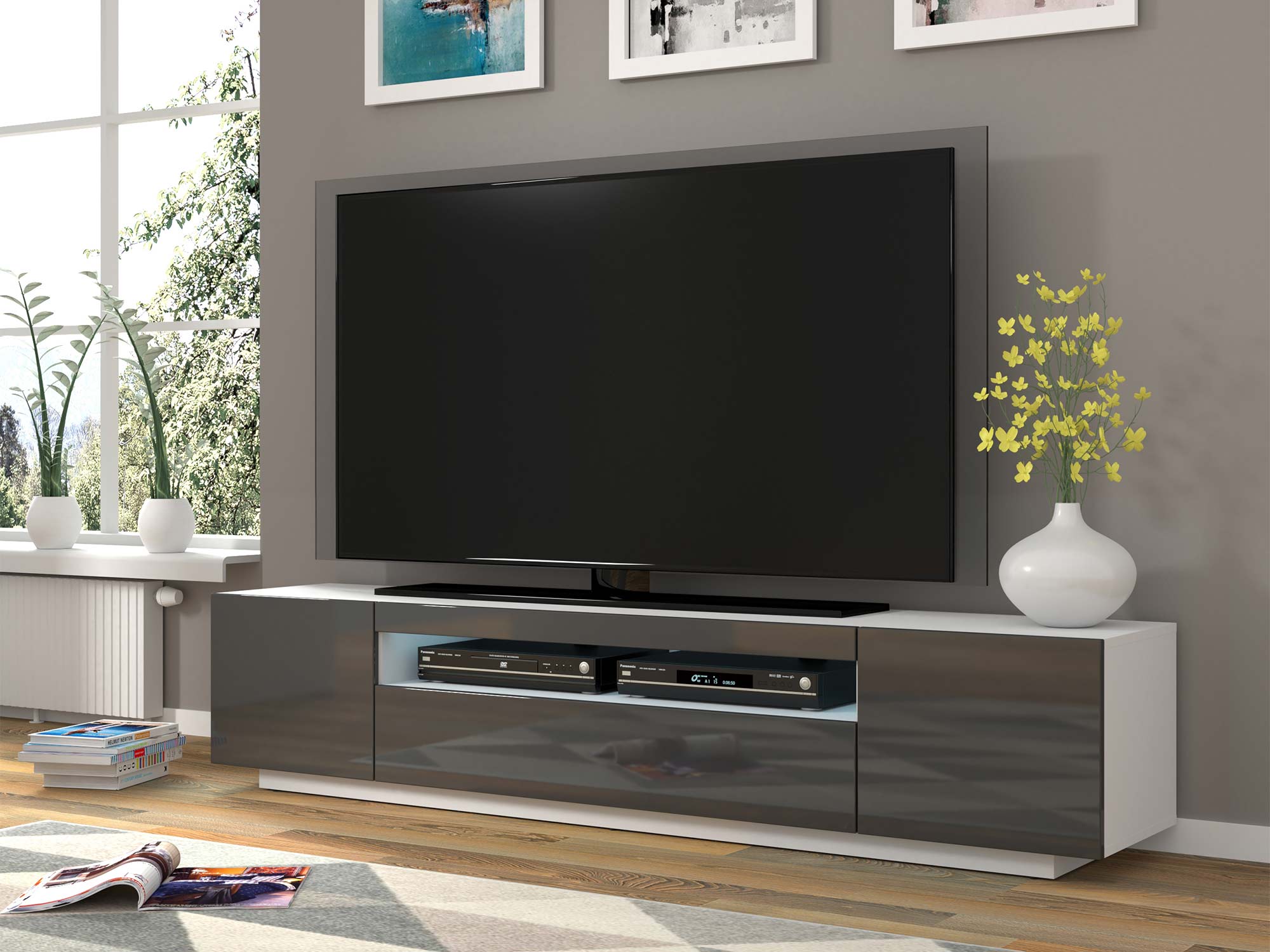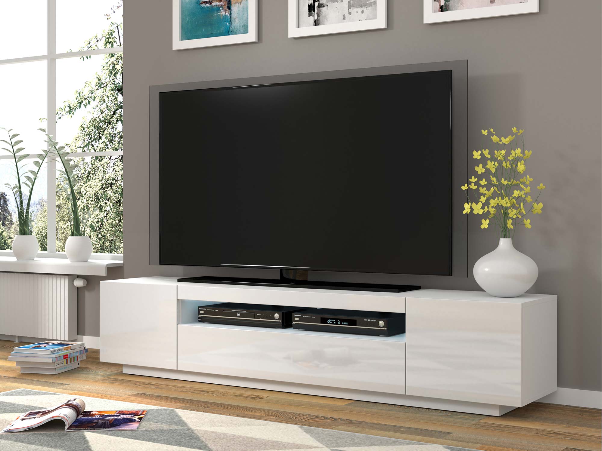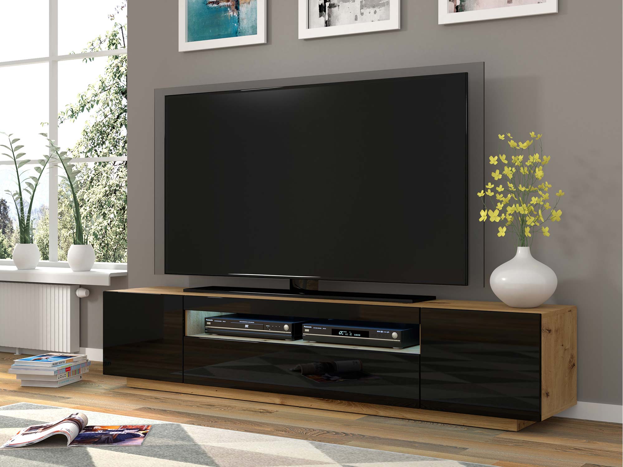 Przede wszystkim oferowana szafka charakteryzuje się nie tylko walorami estetycznymi, ale jest to również mebel bardzo praktyczny. Poza oczywistym miejscem na dekodery czy konsole, szafka posiada kilka zamkniętych półek, co tworzy dodatkową przestrzeń na przechowywanie. Ponadto brak uchwytów to nowoczesne rozwiązanie, które nie przytłacza mebla oraz pozwala na uzyskanie schludnego oraz niezwykle gustownego wnętrza. Dodatkowo klimatu dodaje oświetlenie LED o zimnej barwie, które nadaje wnętrzu uroku i nutę elegancji. Co więcej, szafka posiada na tyle okrągły otwór, który znacznie ułatwia organizację kabli, co zdecydowanie poprawia estetykę całej aranżacji.