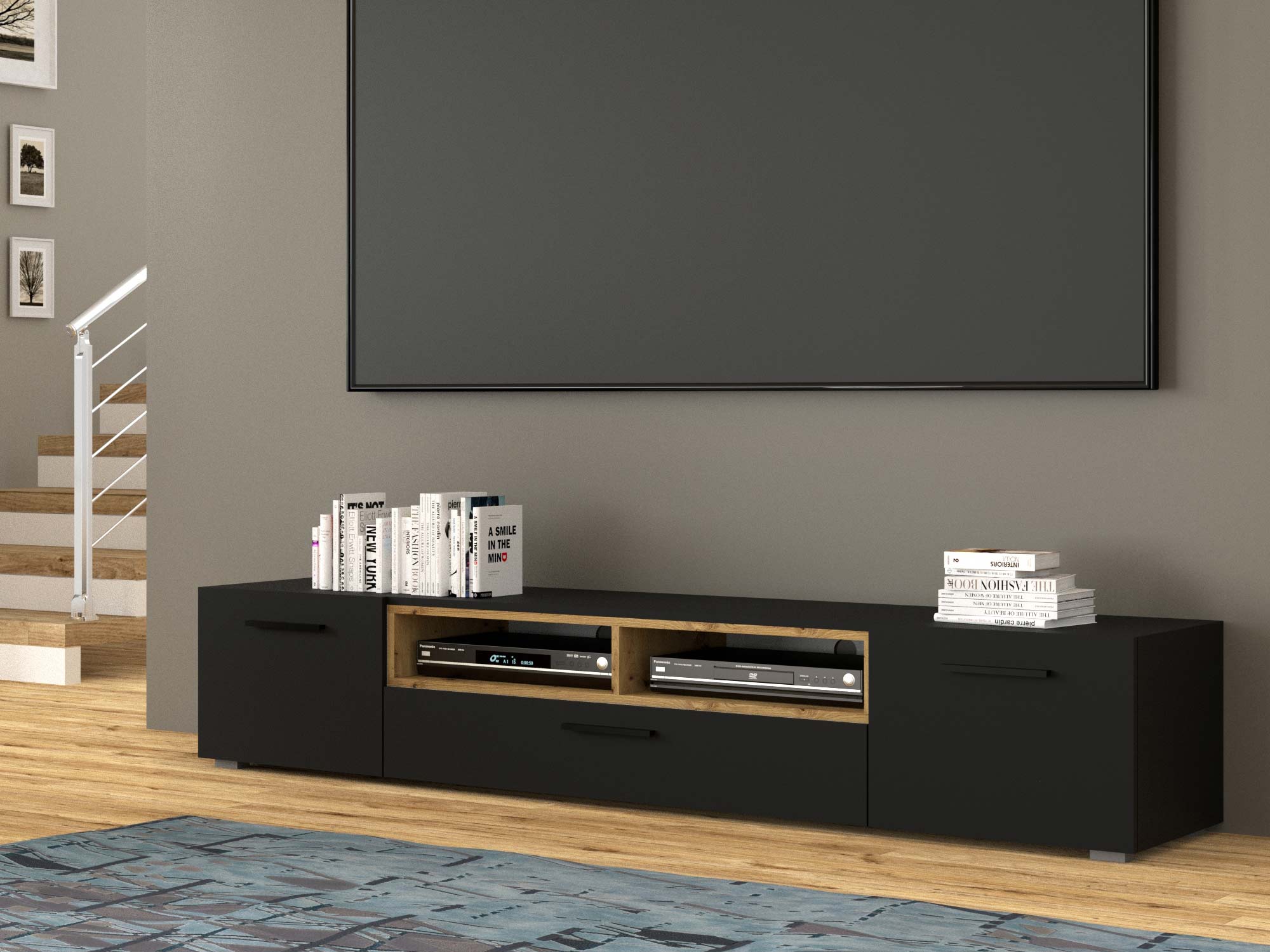 Przede wszystkim szafka RTV NIMET to mebel prezentujący się we wnętrzu wyjątkowo elegancko. Z pewnością spełni oczekiwania osób, które cenią prostą bryłę, matowe wykończenie i nowoczesne rozwiązania. Niewątpliwie produkt zachwyci niejeden wymagający gust. Dodatkowo niekonwencjonalne połączenie głębokiej czerni z odcieniem dąb artisan przykuwa wzrok i wyróżnia się.