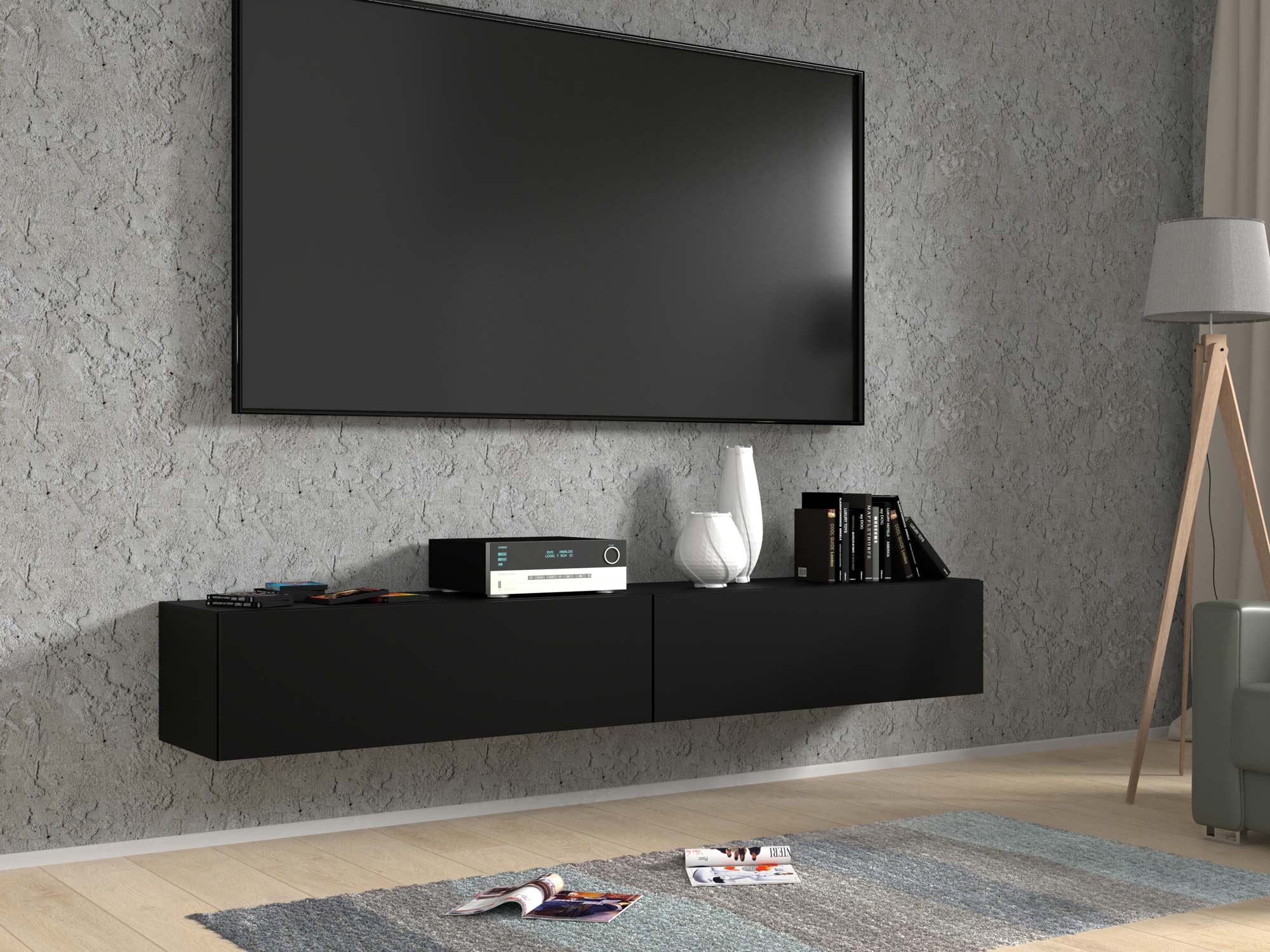 Szafka RTV czarny mat wisząca aranżacja ikonka AMIRA