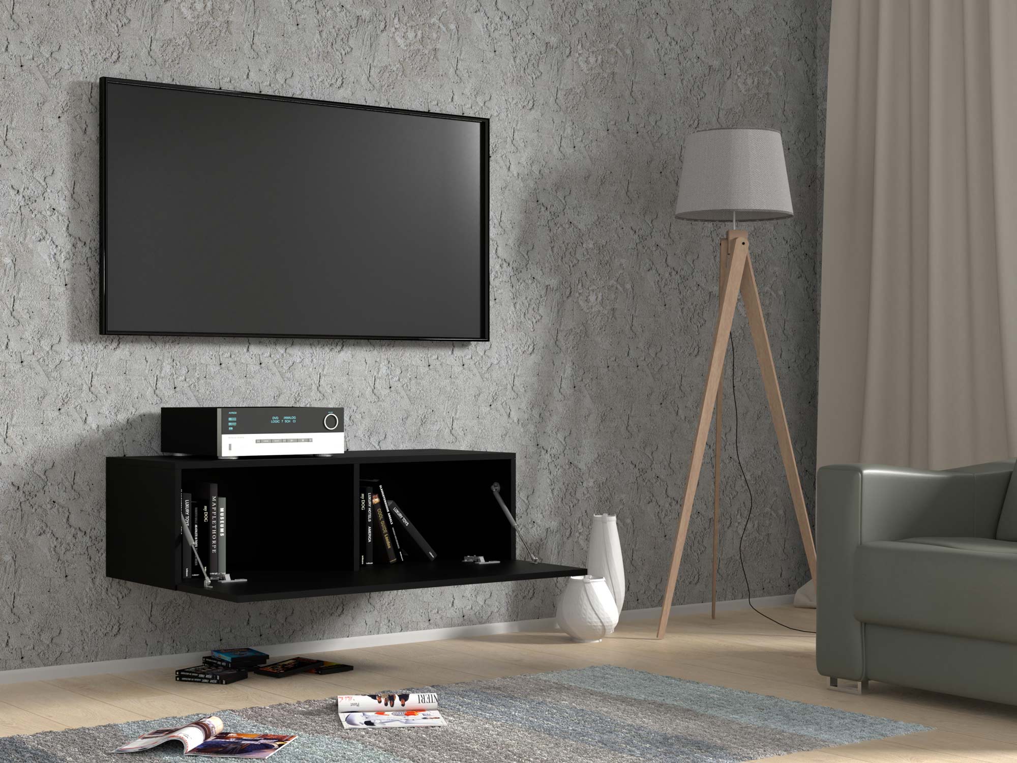 Szafka RTV czarny mat wisząca aranżacja otwarta AMIRA