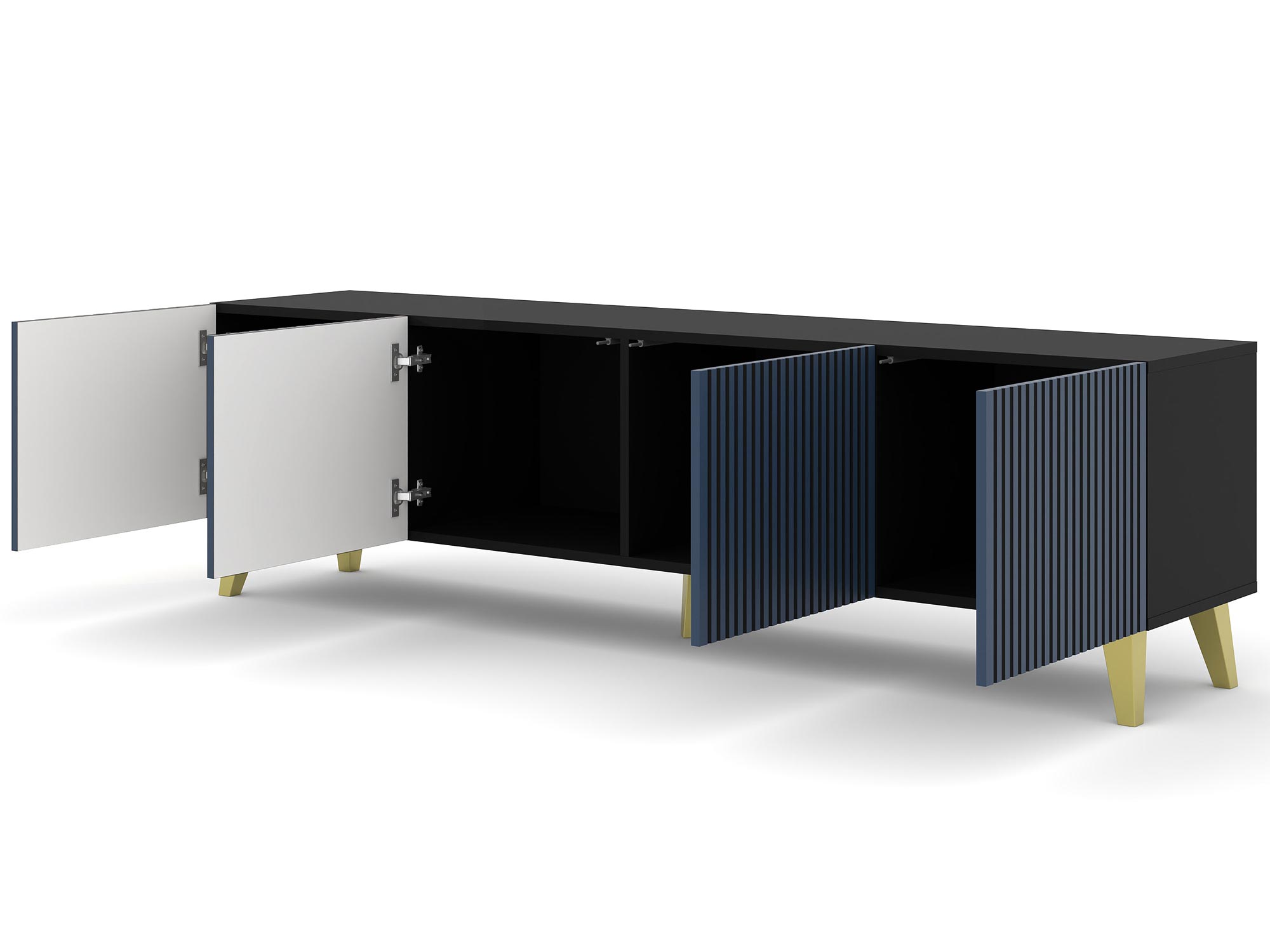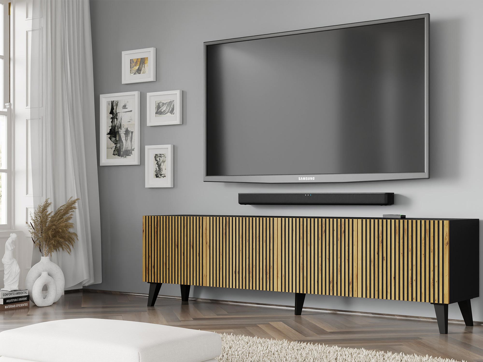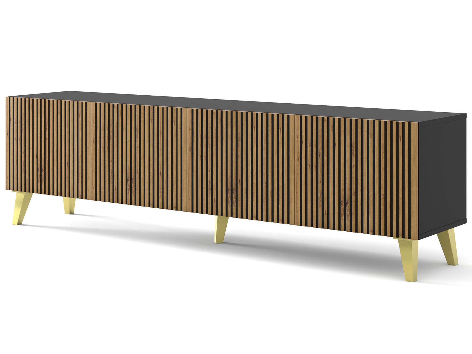 Szafka RTV Frezowane Fronty Navia to mebel, który wprowadzi do Twojego wnętrza nowoczesność i elegancję. Czarny matowy korpus i fronty w kolorze dąb artisan i czarnym malowanym dodają wnętrzu świeżości i wyrafinowania, a złote nóżki nadają mu luksusowego charakteru. Dzięki temu szafka Navia będzie doskonałym uzupełnieniem zarówno minimalistycznych, jak i bardziej klasycznych aranżacji, wnosząc do nich odrobinę nowoczesnego stylu.