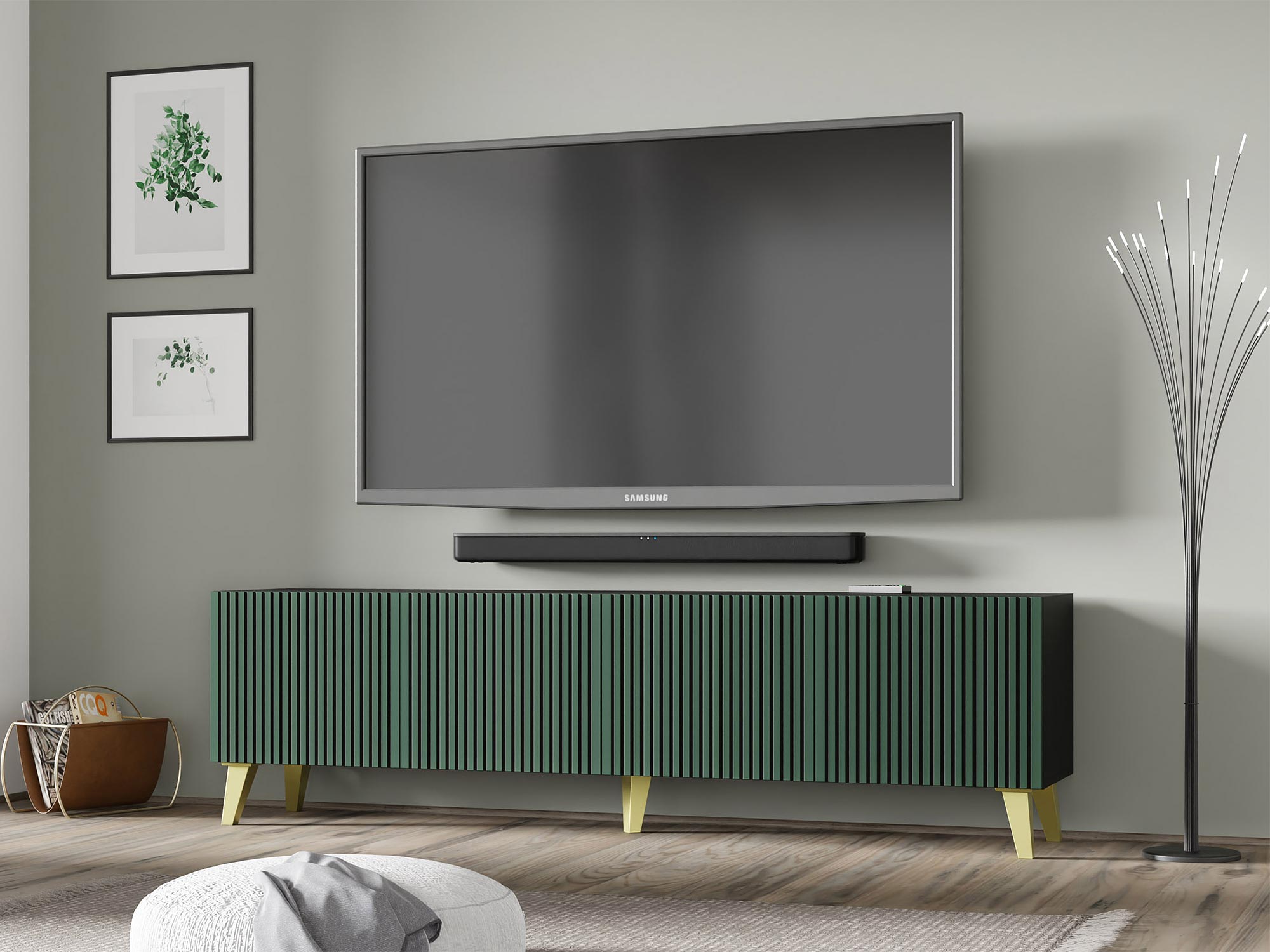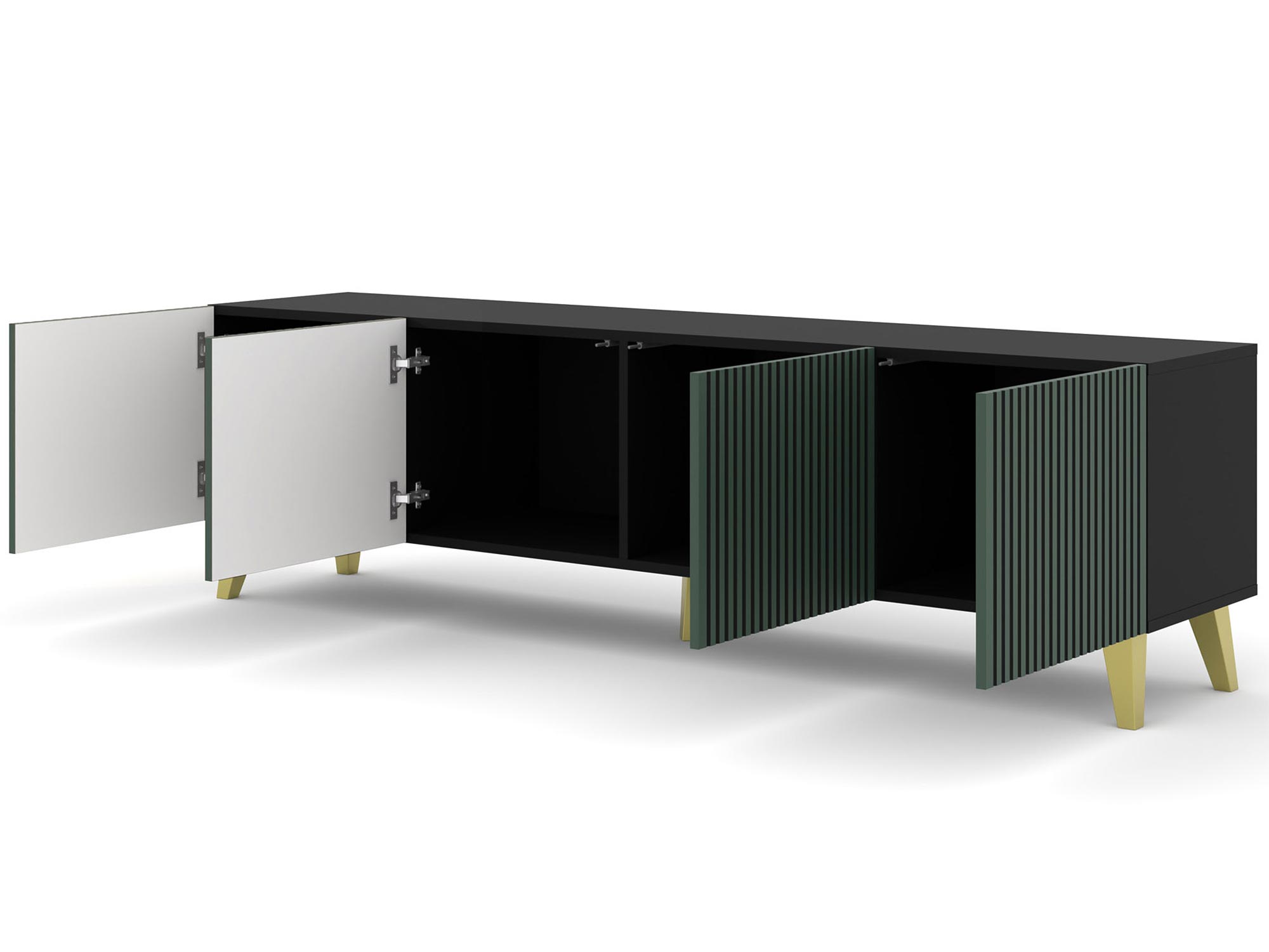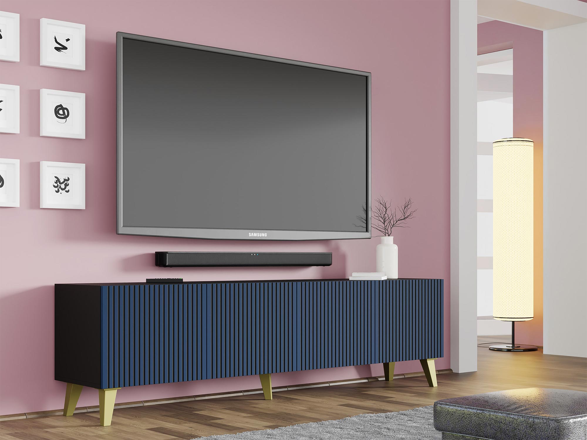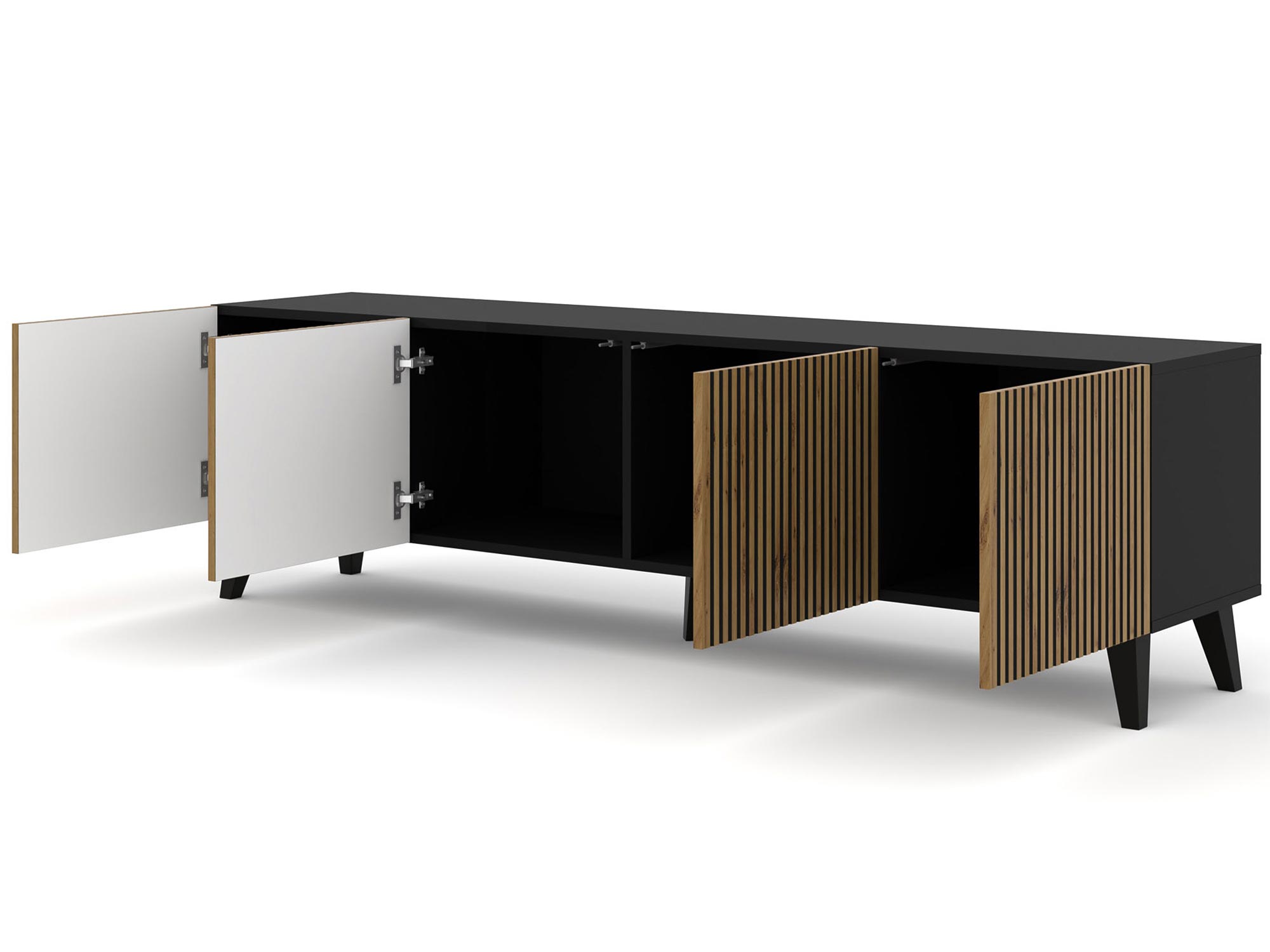 Szafka RTV Frezowane Fronty Navia to mebel, który wprowadzi do Twojego wnętrza nowoczesność i elegancję. Czarny matowy korpus i fronty w kolorze dąb artisan i czarnym malowanym dodają wnętrzu świeżości i wyrafinowania, a złote nóżki nadają mu luksusowego charakteru. Dzięki temu szafka Navia będzie doskonałym uzupełnieniem zarówno minimalistycznych, jak i bardziej klasycznych aranżacji, wnosząc do nich odrobinę nowoczesnego stylu.