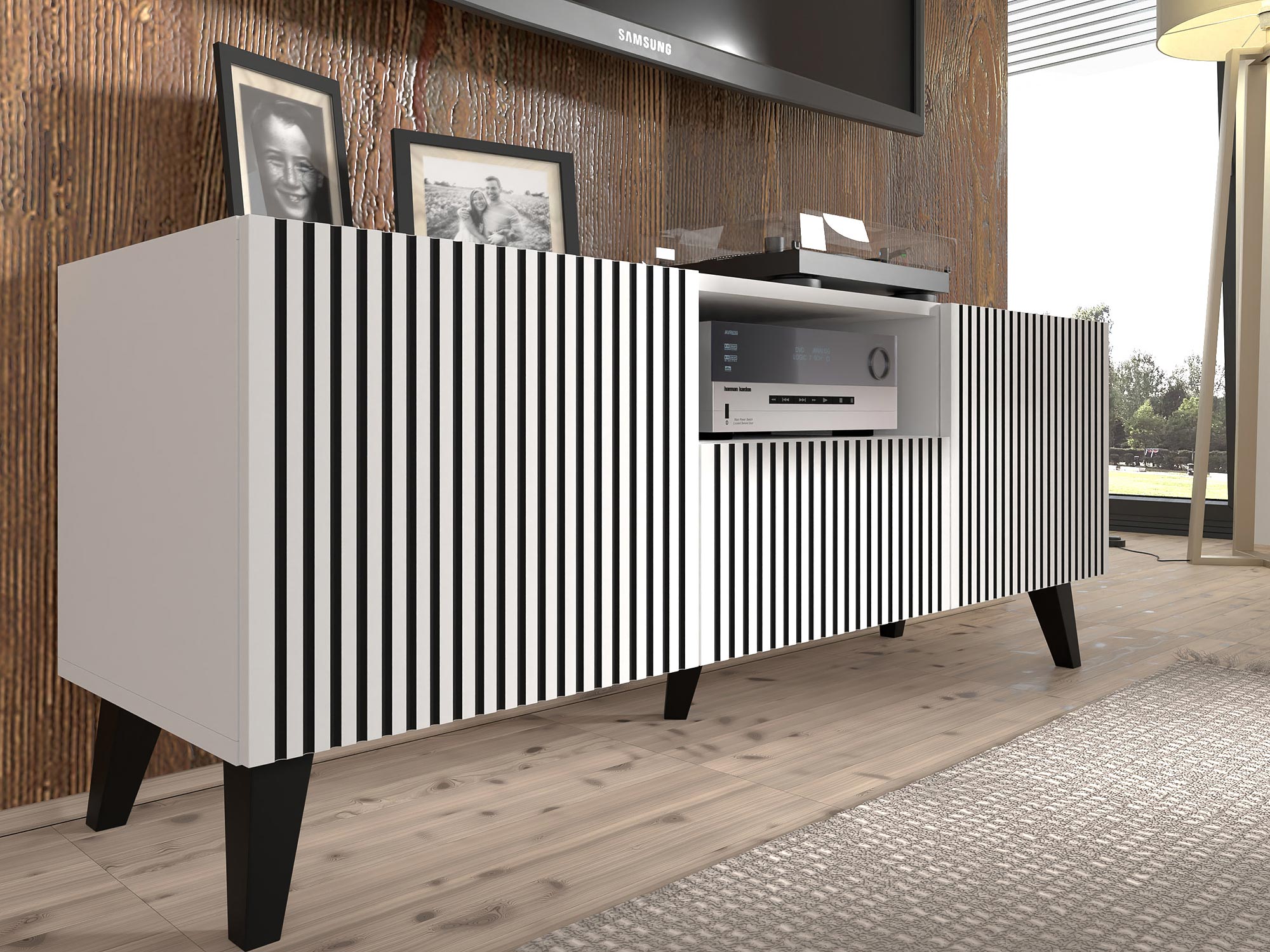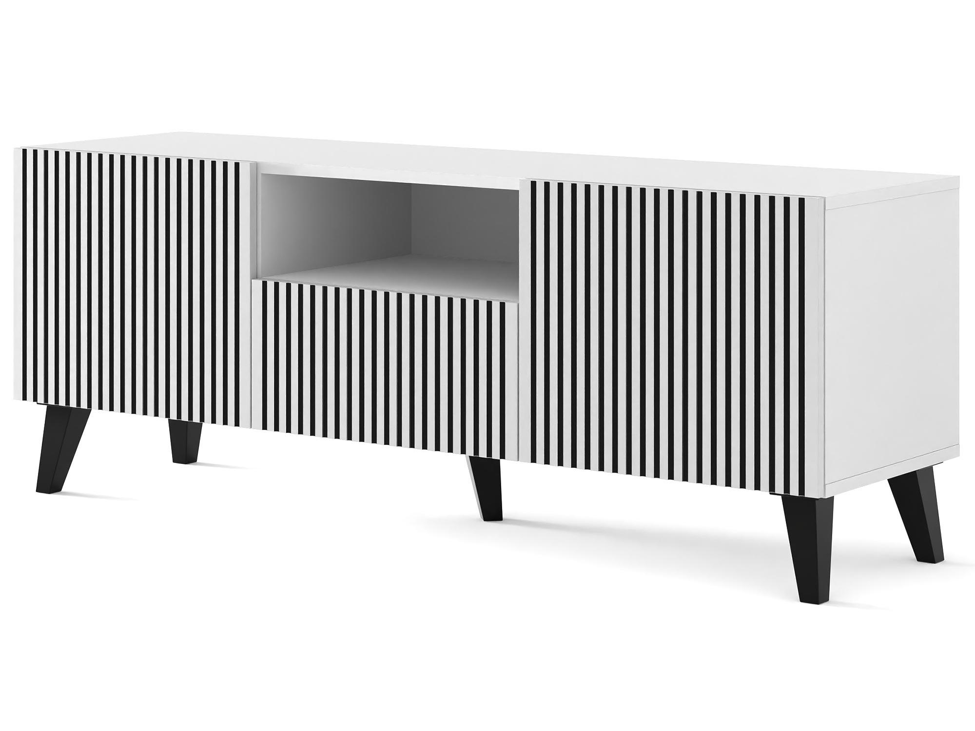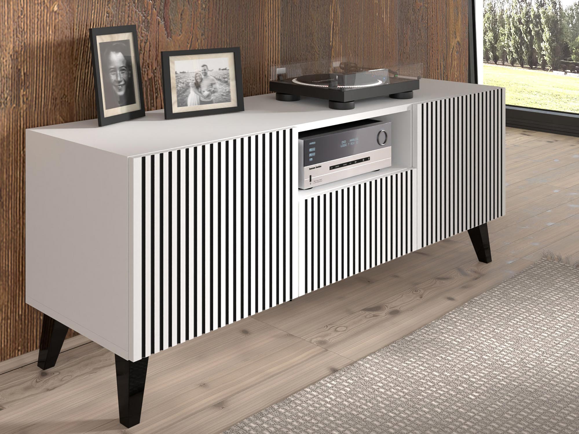 Biała komoda z pionowymi listwami, czarne nóżki, styl skandynawski