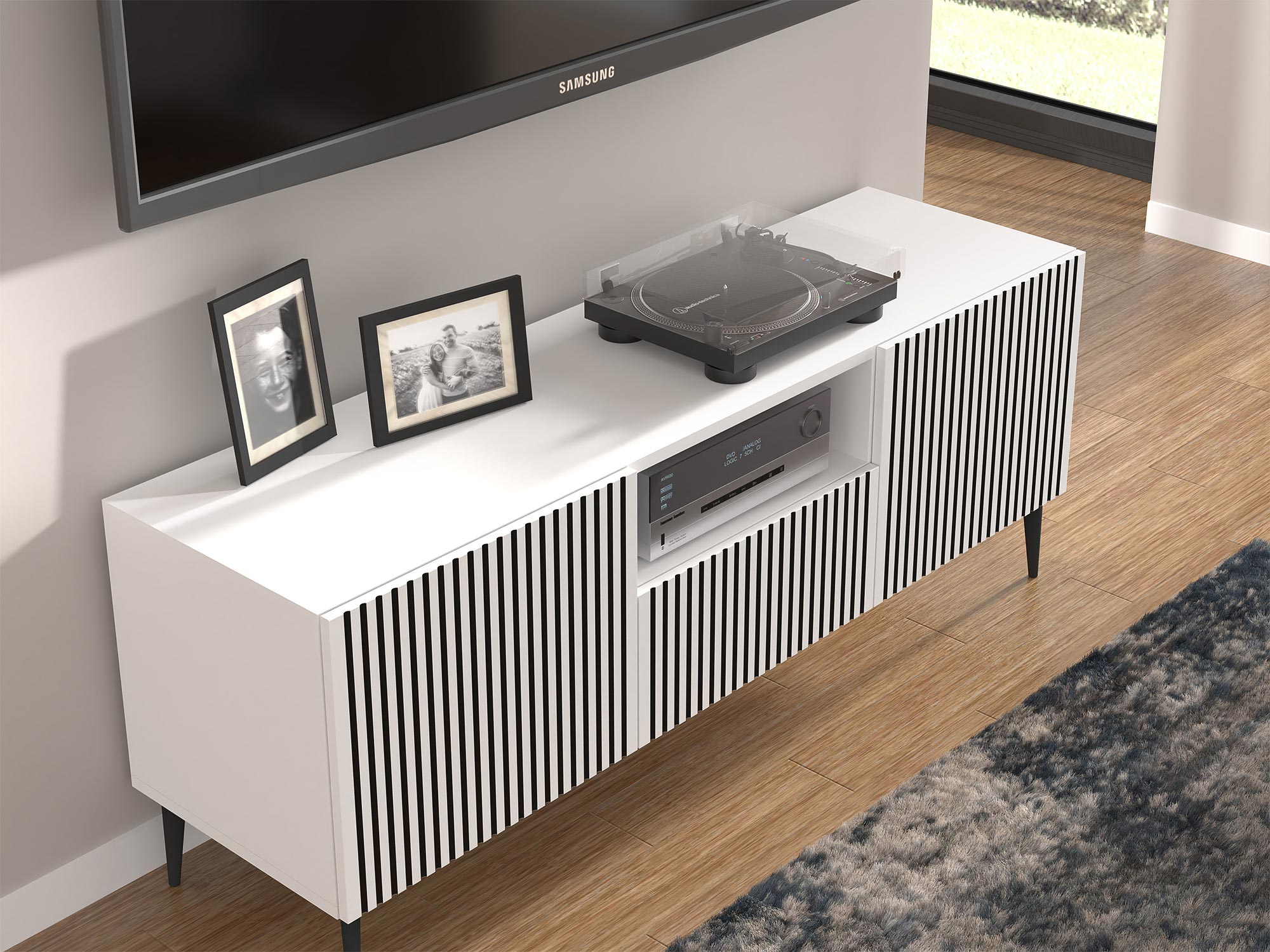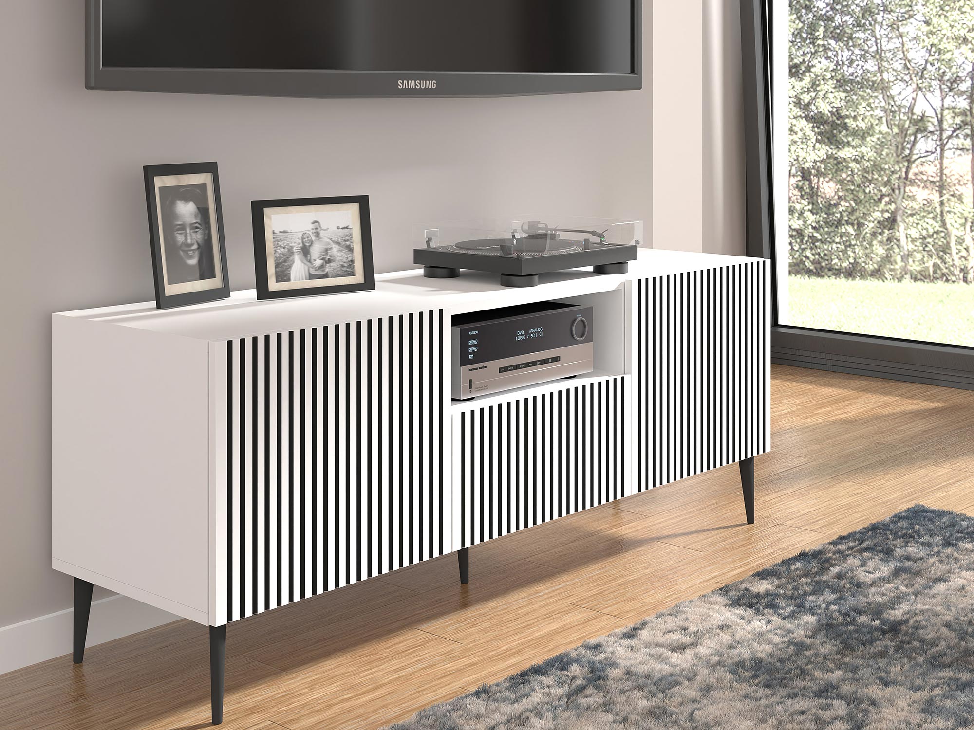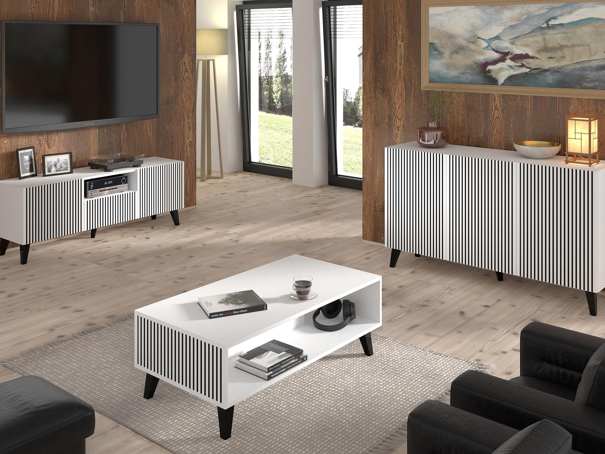 Biała komoda z pionowymi listwami, czarne nóżki, styl skandynawski