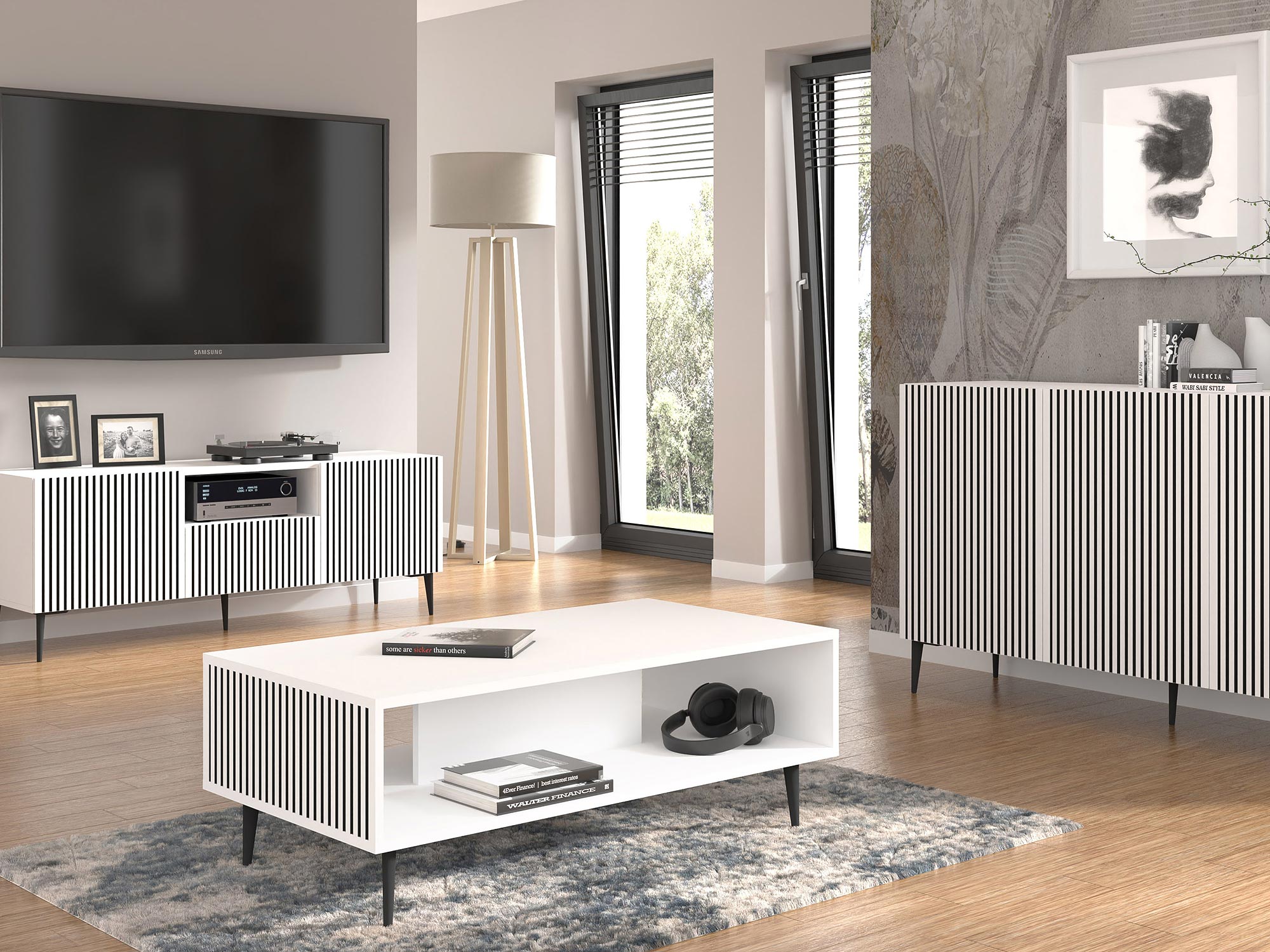 Nowoczesna biała komoda z pionowymi listwami, styl skandynawski