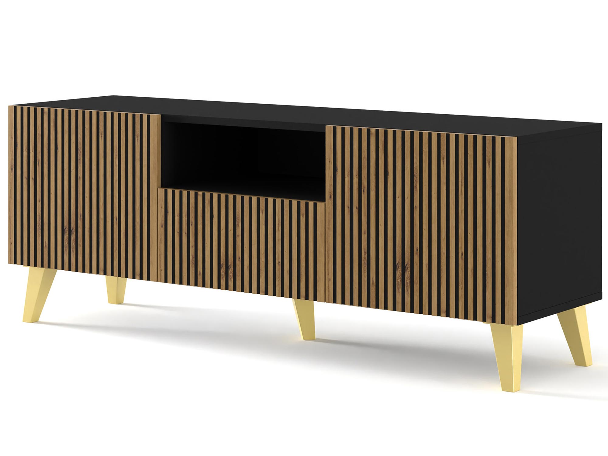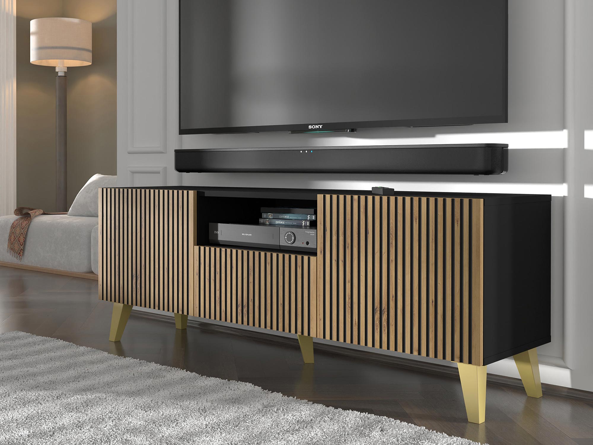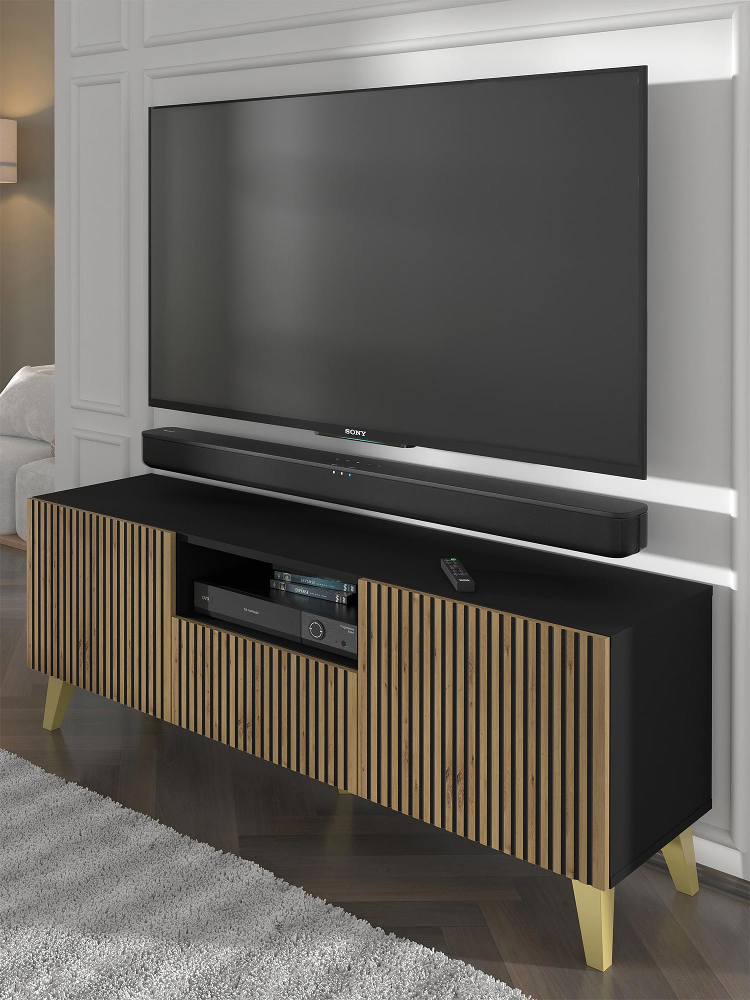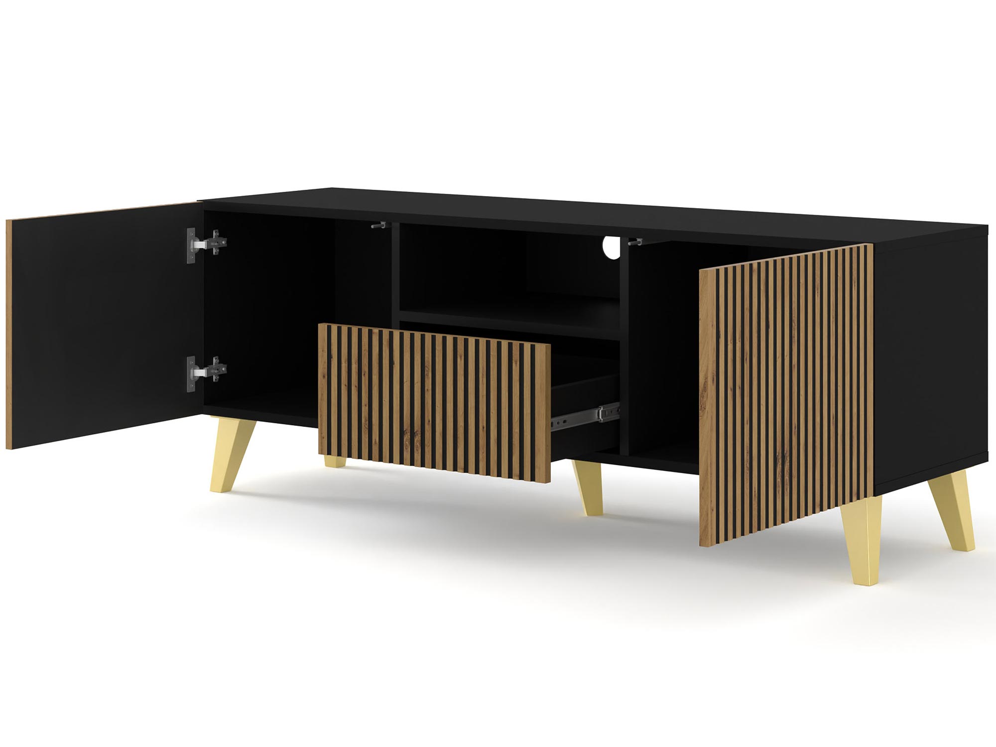 • Funkcjonalność: Szafka Navia oferuje dużo miejsca do przechowywania sprzętu elektronicznego, kabli i innych akcesoriów. Dzięki przemyślanemu rozkładowi półek i wnęk, łatwo utrzymasz porządek w swoim salonie.