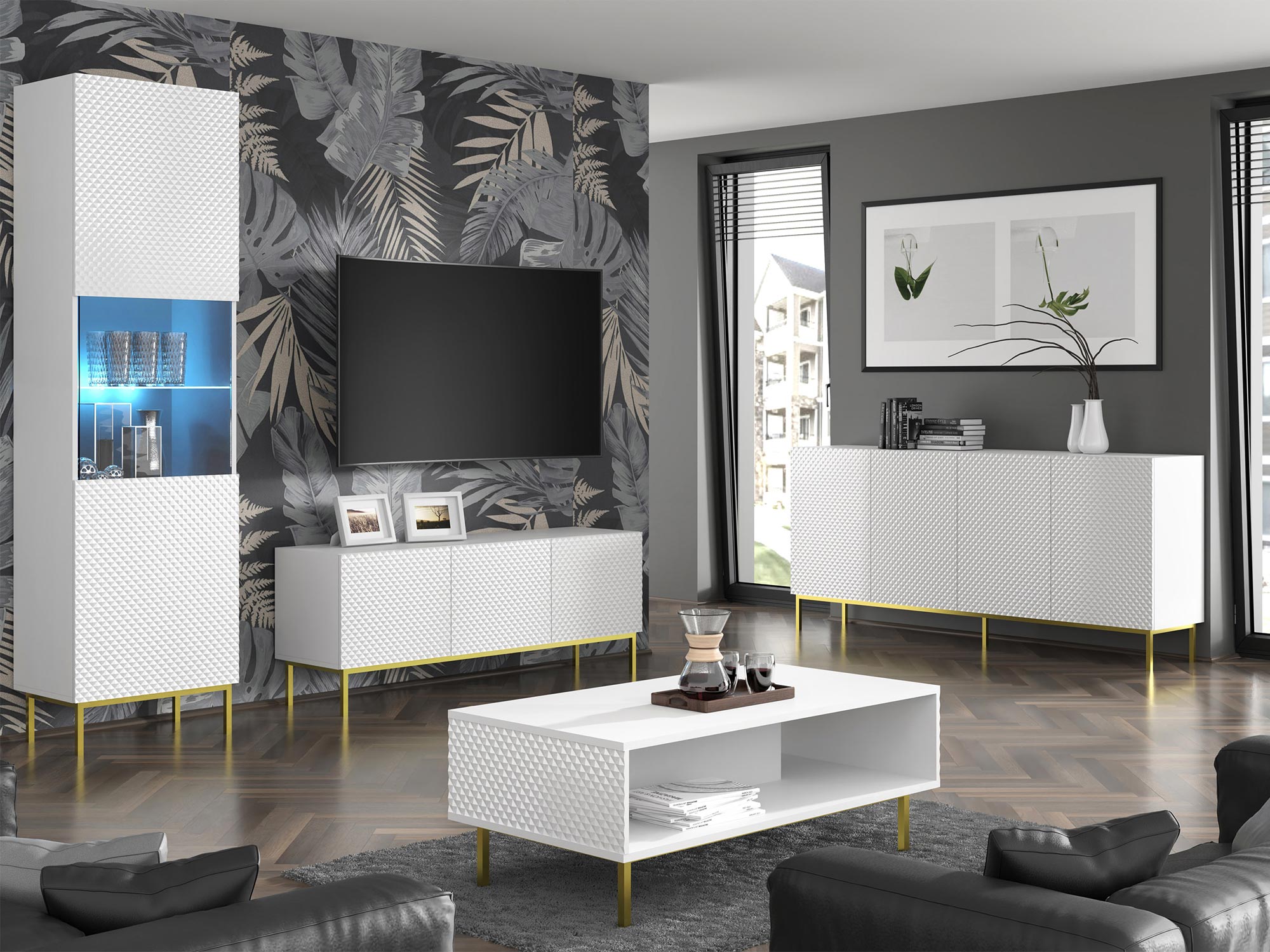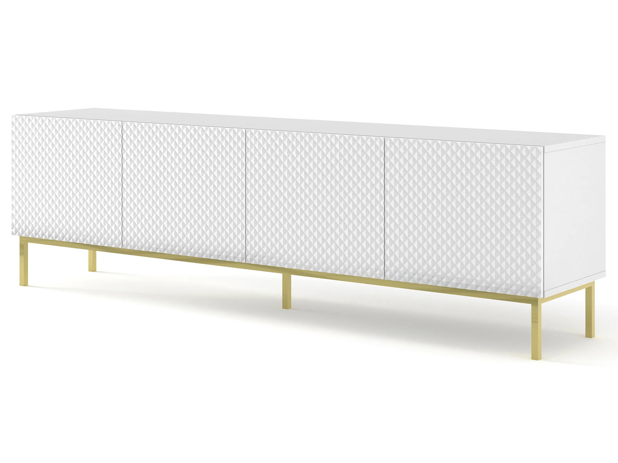 Szafka RTV Navia Wysoki Połysk to mebel, który wprowadzi do Twojego wnętrza nowoczesność i elegancję. Biały matowy korpus i fronty w wysokim połysku dodają wnętrzu świeżości i wyrafinowania, a złote nóżki nadają mu luksusowego charakteru. Dzięki temu szafka RTV Navia będzie doskonałym uzupełnieniem zarówno minimalistycznych, jak i bardziej klasycznych aranżacji, wnosząc do nich odrobinę nowoczesnego stylu.