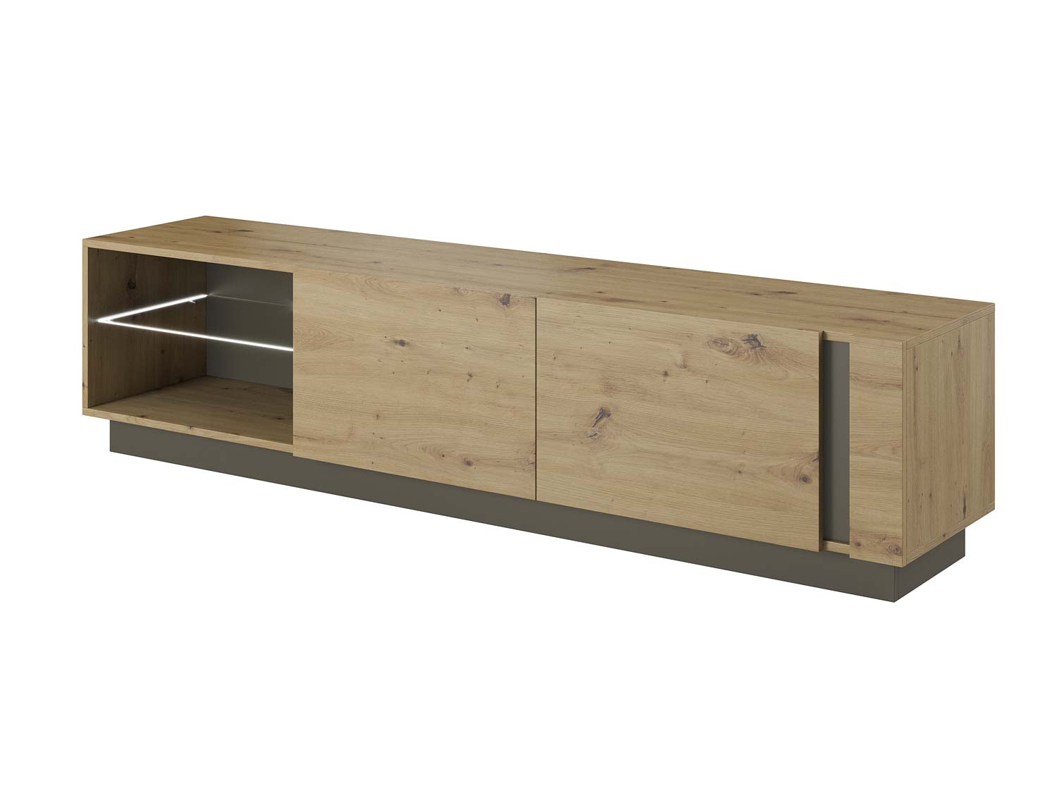 Wspaniała szafka RTV biała CLEOPATRA to stylowe i wysmakowane rozwiązanie do modernistycznego salonu lub pokoju dziennego. Ponadto dobrze będzie wyglądać też w innych pokojach. Jej nieprzeciętny i nieszablonowy wygląd zapewniają nietypowy design i salonowe wykończenie. Co ważne szczególną uwagę przykuwa innowacyjne połączenie matów i połysku, które jest proste, a jednocześnie wyszukane. Do tego przedstawiona szafka TV stylowa to fenomenalny mebel, nadający każdemu wnętrzu oryginalnego stylu i dobrego smaku. Co więcej materiały wysokiej jakości wykorzystano do produkcji szafki. Składa się ona z najlepszych płyt laminowanych i płyt HDF. Mebel dodatkowo zabezpieczono obrzeżem ABS, które sprawia, że jest ona odporna na zniszczenia, wzmacnia trwałość i zabezpiecza przed wilgocią, a także uszkodzeniami mechanicznymi. Ponadto szafka jest wyposażona w otwierane drzwi, za którymi mieści się przestrzeń do przechowywania sprzętu RTV niewielkich rozmiarów czy drobiazgów. W dodatku szklana półka z opcjonalnym podświetleniem LED efektownie podkreśla jej wygląd i w ciekawy sposób zastępuje świece czy lampy.