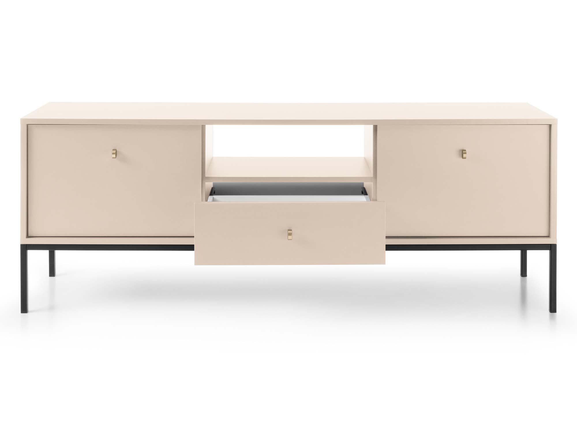 Zbliżenie na wysuwaną szufladę z beżowej szafki RTV z prowadnicą