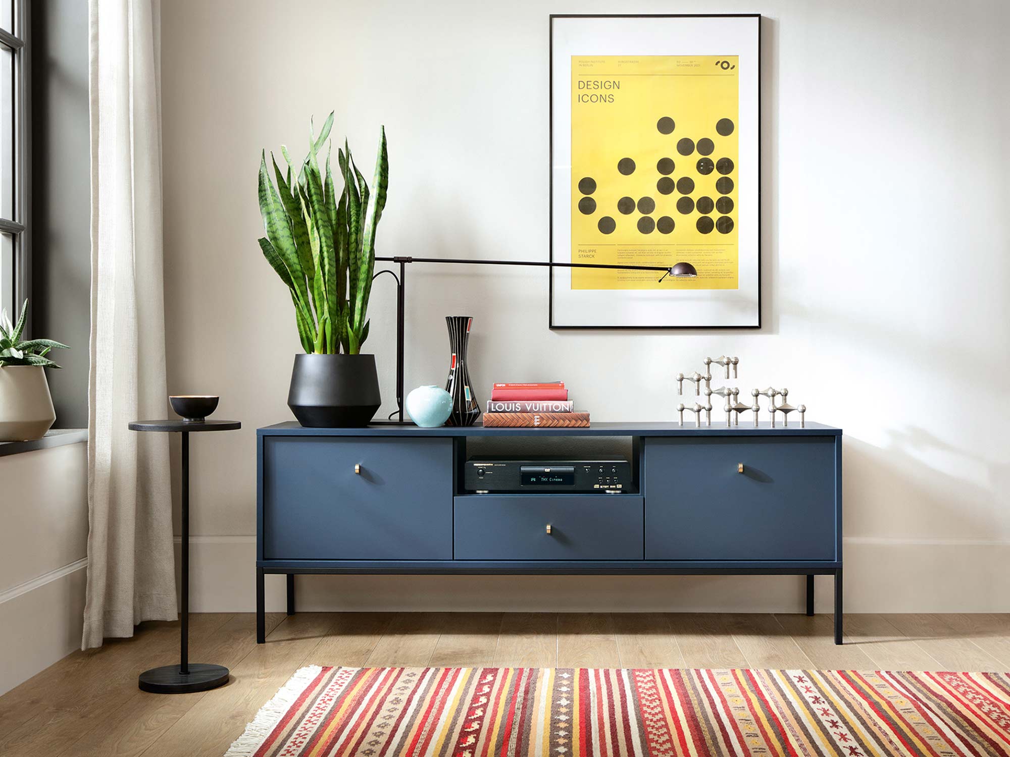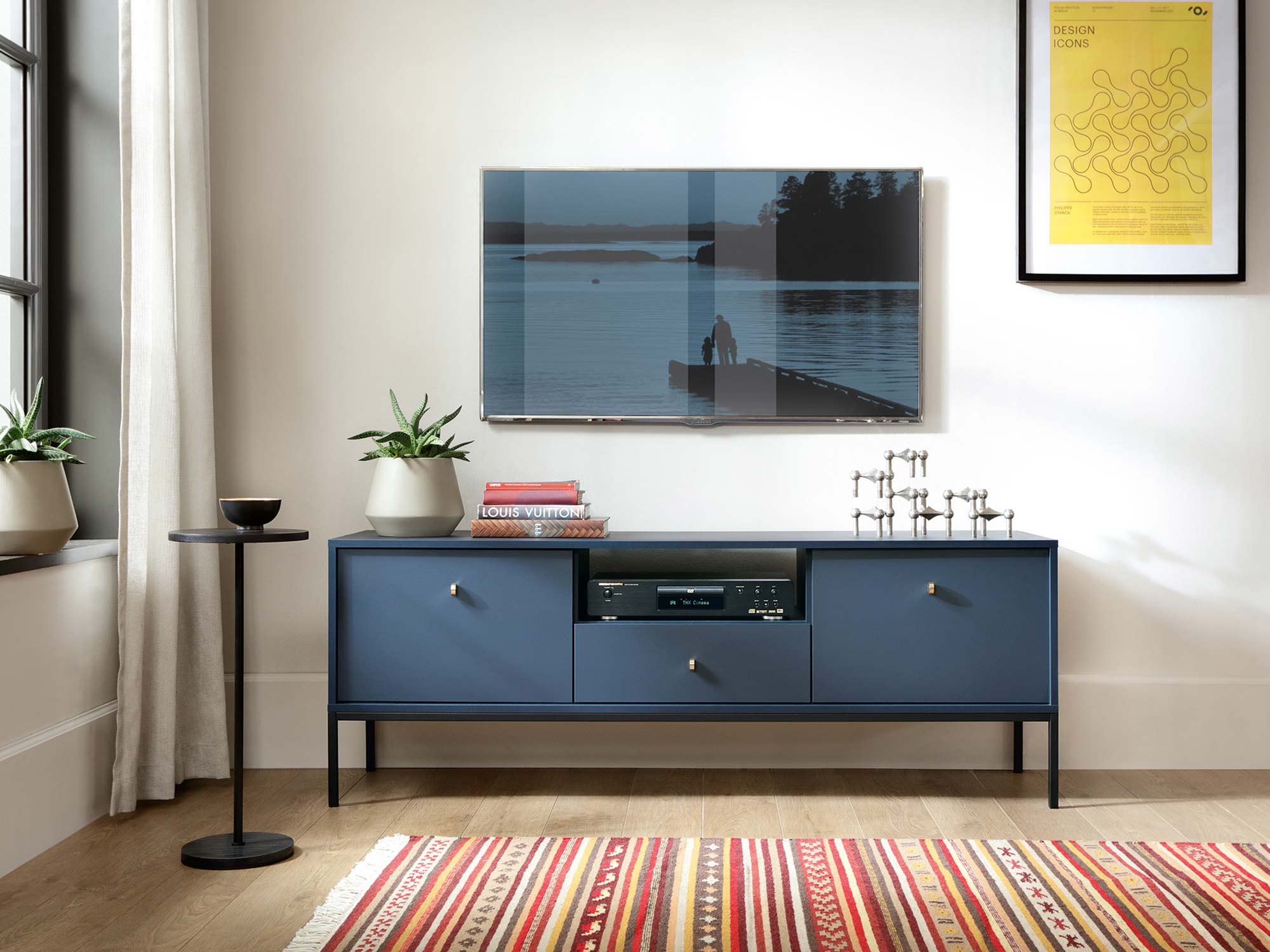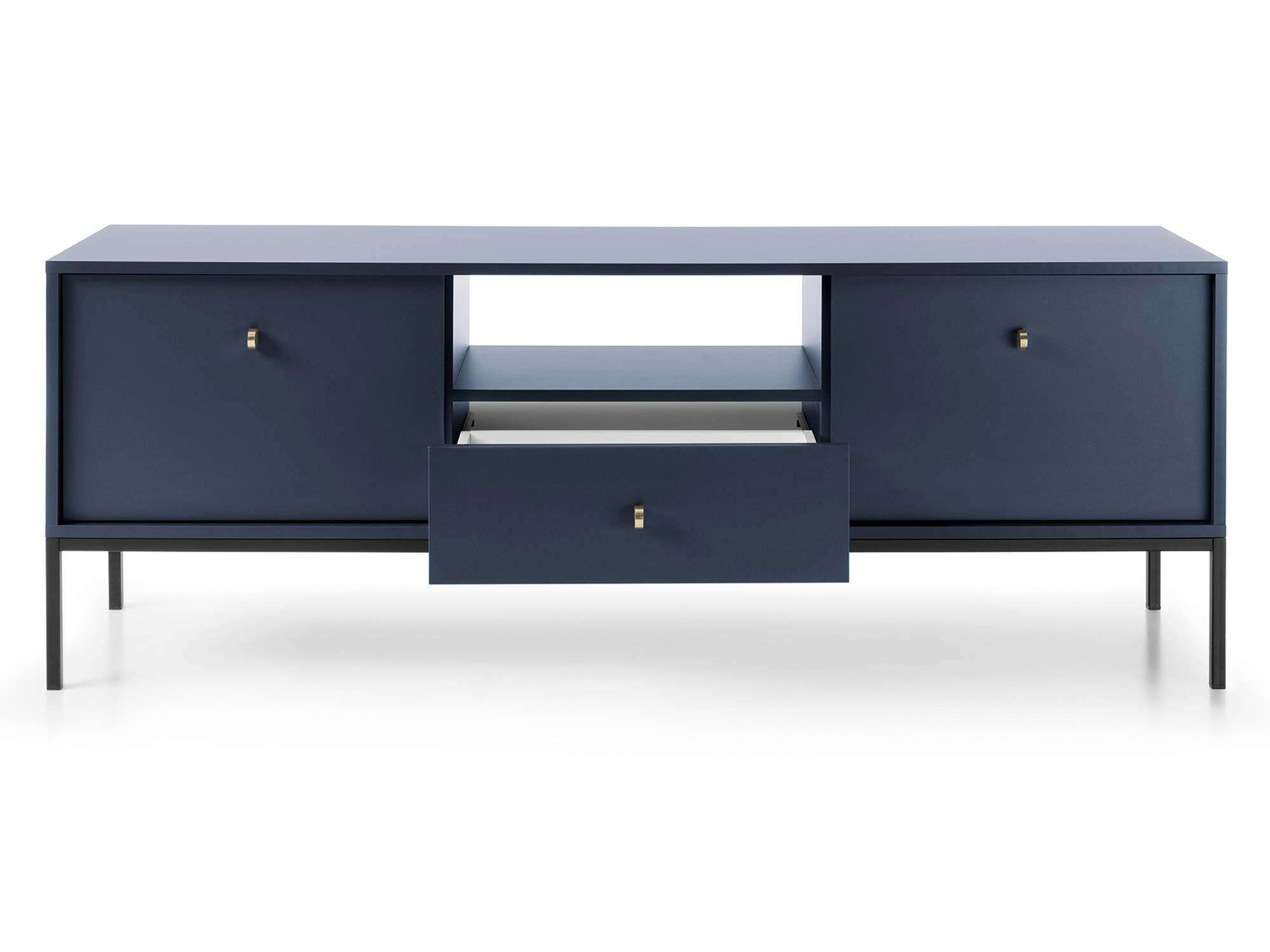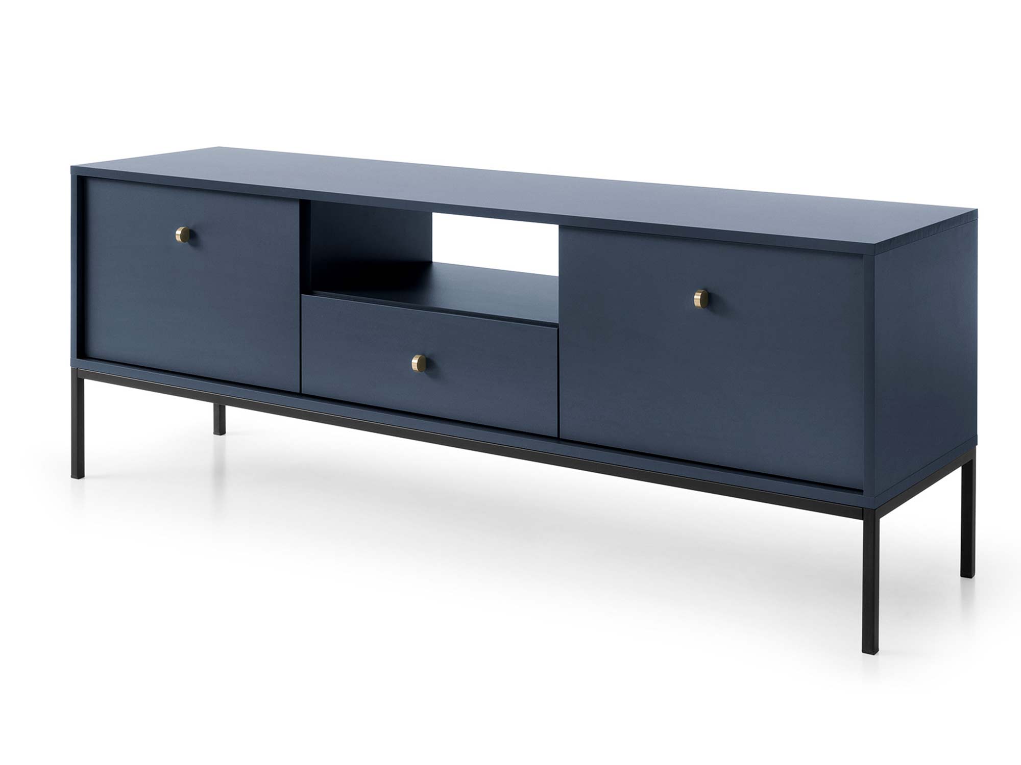 Granatowa szafka RTV z szufladą i i czarną ramą