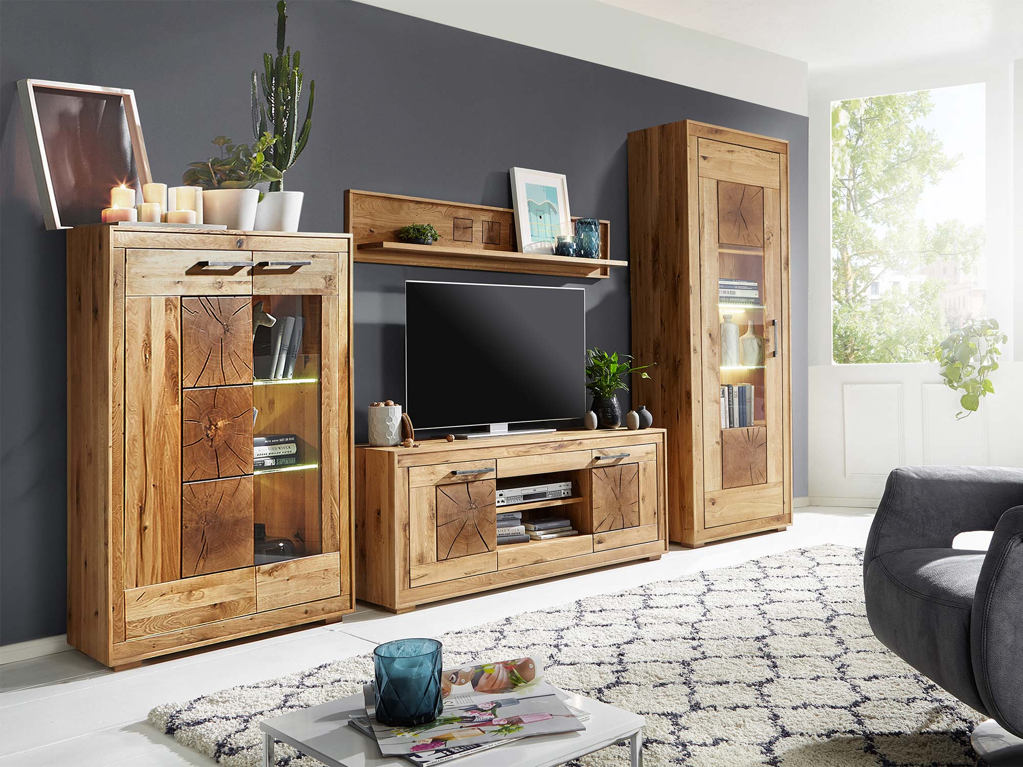 Szeroka Szafka pod Telewizor LUX łączy w sobie funkcjonalność z niepowtarzalnym stylem. Dębowe fronty, w których wykorzystano naturalny wycięcia z końca belek, to element, który z pewnością przyciąga wzrok i nadaje wnętrzu oryginalnego charakteru. Szafka ta to nie tylko mebel – to deklaracja twojego dobrego gustu.