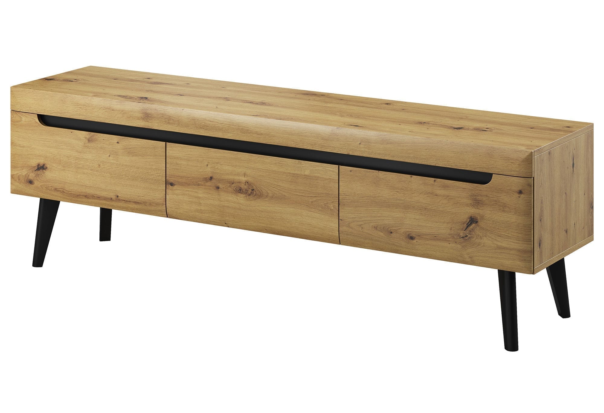 Propozycja widniejąca na stronie to niepowtarzalny wdzięk i klasyczna elegancja. Produkt o ciepłej barwie idealnie wpasowuje się w nowoczesne wnętrza salonu, jadalni czy pokoju młodzieżowego. Co więcej mebel posiada frezowane we frontach uchwyty oraz lekko zaokrąglone kształty. Cechą charakterystyczną kolekcji jest obecność wysokich nóżek, które nie tylko nadają całości lekkości, ale również umożliwiają utrzymanie przestrzeni w czystości. Ciekawe wstawki dodają wyrazistości, a wygodne szuflady na prowadnicach kulkowych zapewniają swobodę przechowywania licznych przedmiotów. Reasumując szeroka szafka RTV z pewnością zachwyci osoby, które uwielbiają skandynawskie klimaty.