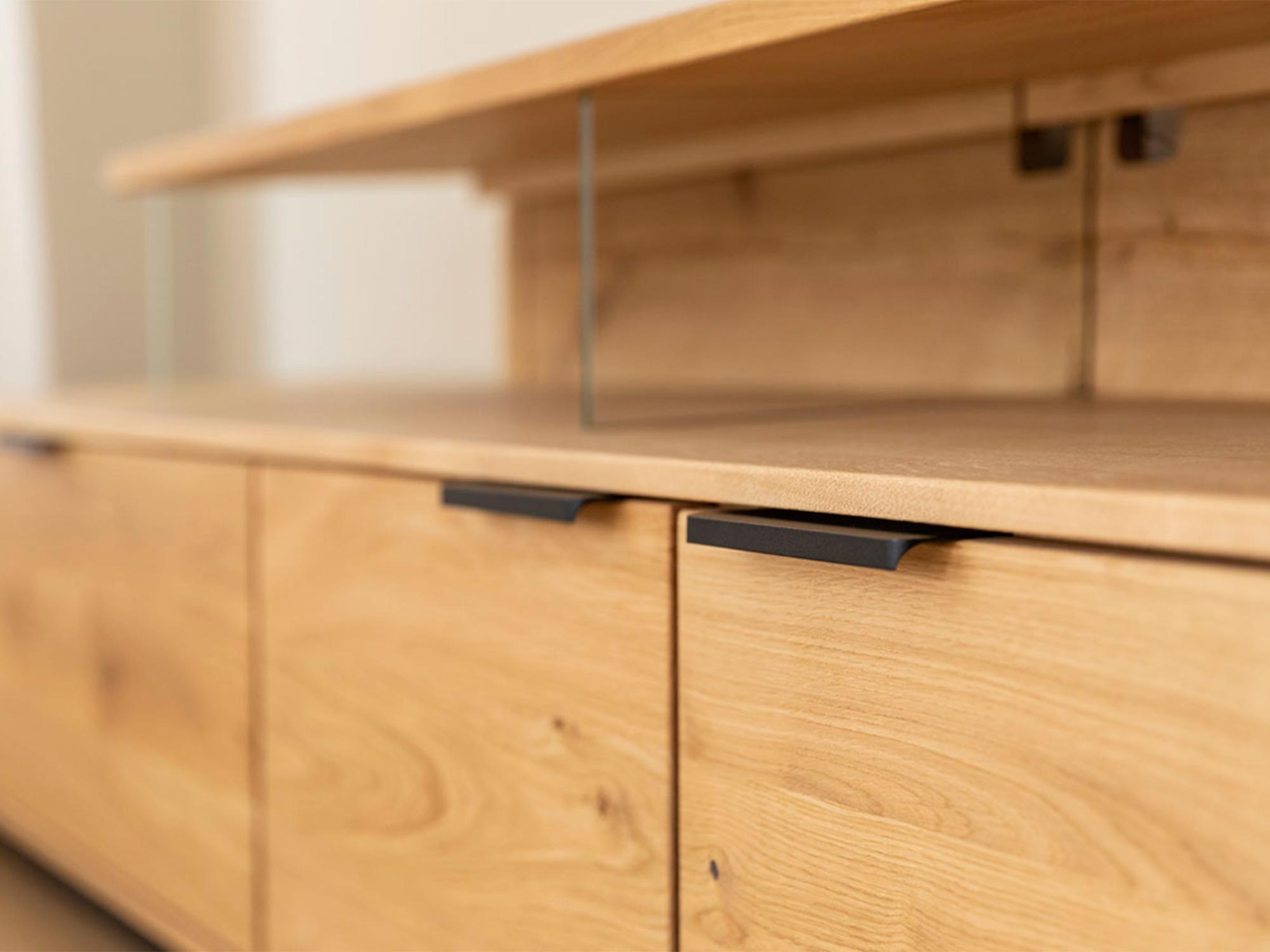 Jej minimalistyczny, lecz wyrazisty wygląd doskonale wpasuje się w każde nowoczesne wnętrze. Czarna metalowa oprawa uchwytów dodaje meblowi industrialnego akcentu, idealnie kontrastując z ciepłem dębowego drewna. Dzięki takiemu połączeniu, szafka ta sprawdzi się zarówno w nowoczesnych, jak i bardziej klasycznych aranżacjach.