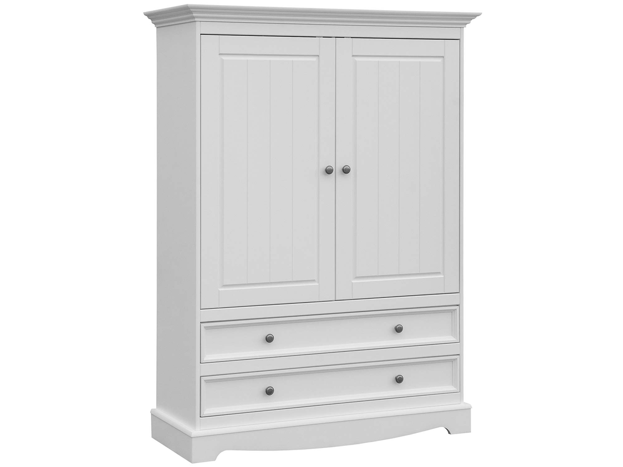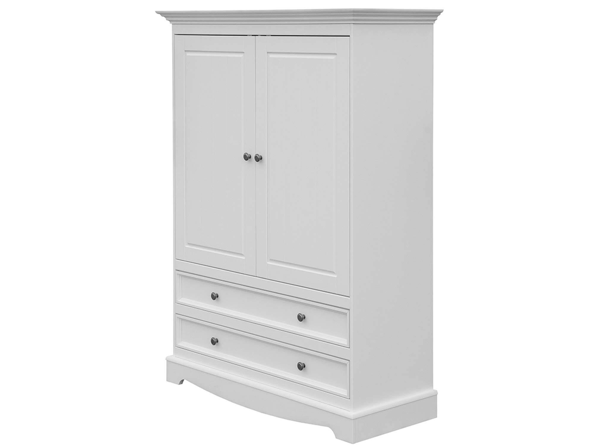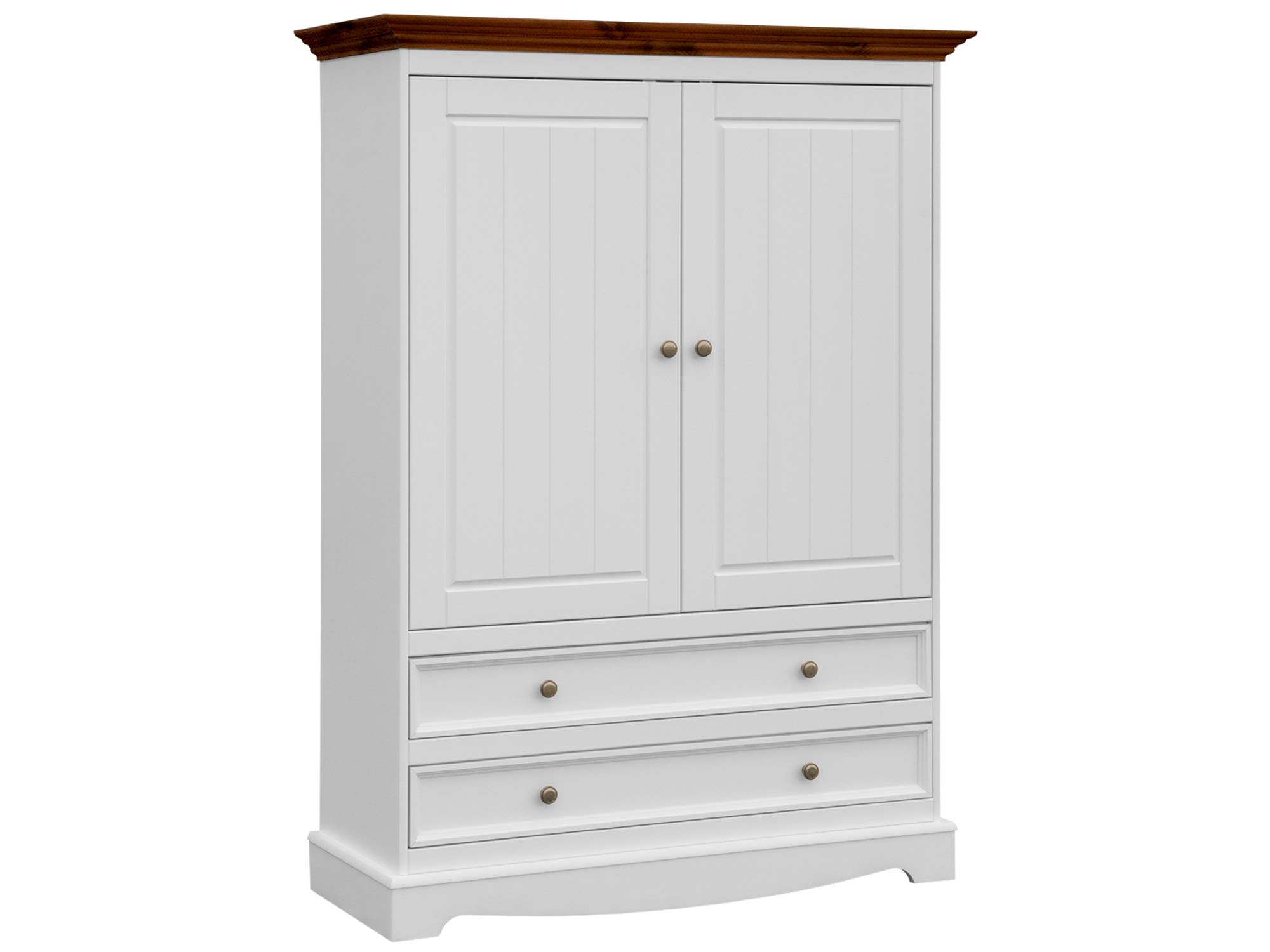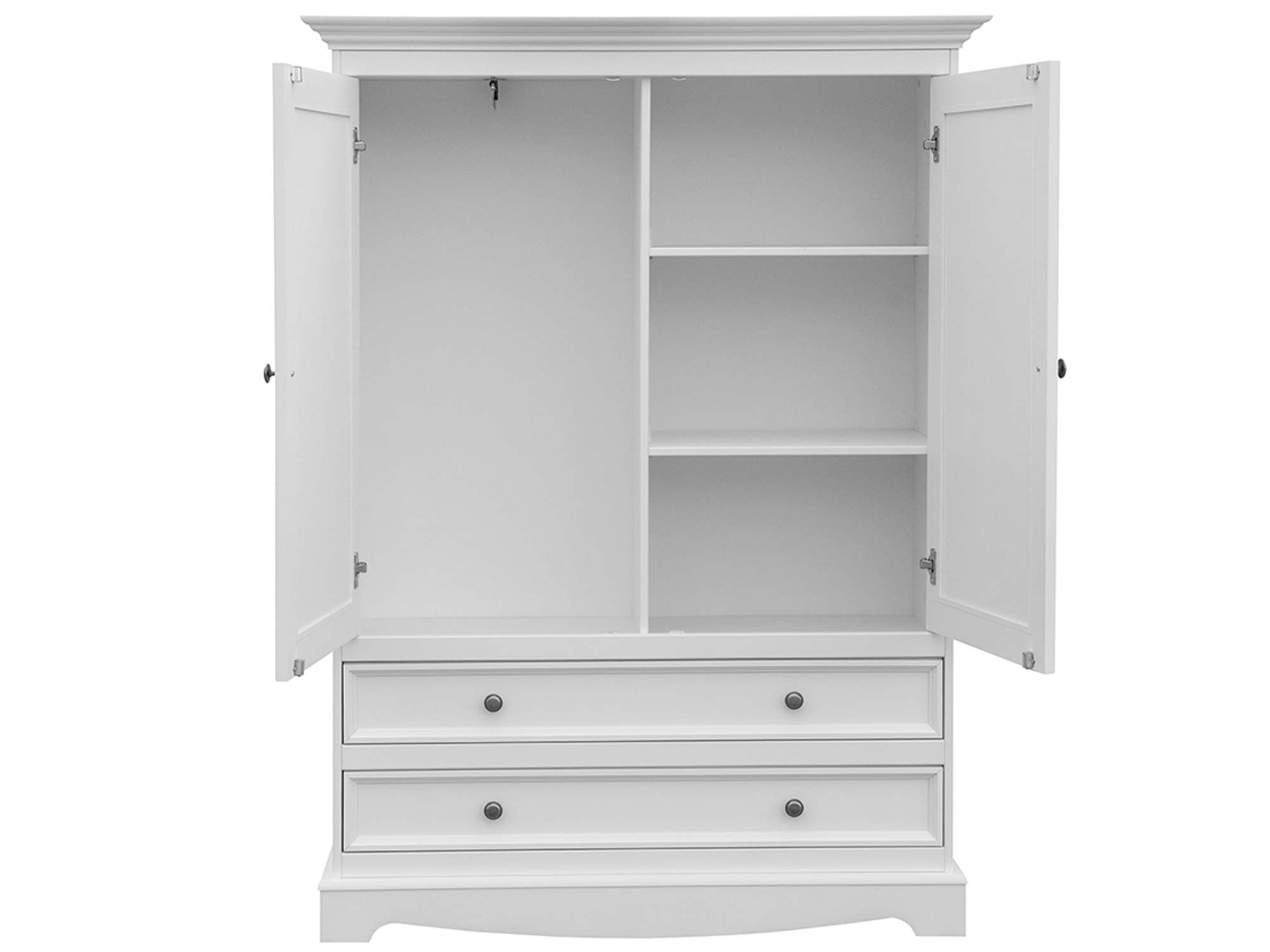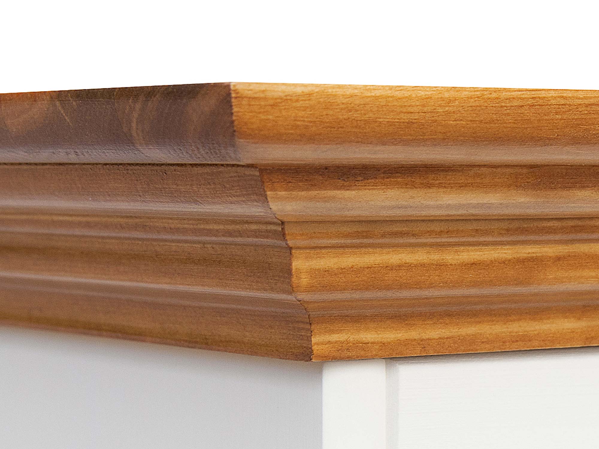 Sosnowa bieliźniarka INGRID to mała szafa, która wyróżnia się funkcjonalnością oraz niezwykle gustownym wyglądem. Co istotne, posiada dwie szafki zamykane, z czego jedna kryje przestrzeń z wysuwanym wieszakiem, co bez wątpienia ułatwia użytkowanie. Ponadto, z prawej strony znajdują się pojemne półki, które można wykorzystać do przechowywania odzieży jak i dokumentów czy innych dodatków. Dodatkowo dwie duże szuflady to kolejne miejsce na organizację np. bielizny, biżuterii czy innych akcesoriów. Co więcej praktyczne uchwyty stylizowane są na stare złoto, co dodaje meblu charakteru oraz klimatu vintage. Ponadto, szuflady oparte są na prowadnicach z systemem cichego domyku, co znacznie umila użytkowanie oraz chroni przed zniszczeniami. Szafka posiada kilka kolorów wieńca do wyboru, dzięki czemu można stworzyć jedyny w swoim rodzaju mebel Korpus mebla został pokryty ekologiczną farbą wodną (krycie 85%) o odcieniu ciepłej bieli. Zarówno korpus jak i wieniec zdobią efektowne frezy, które nadają mu klasy i charakteru.