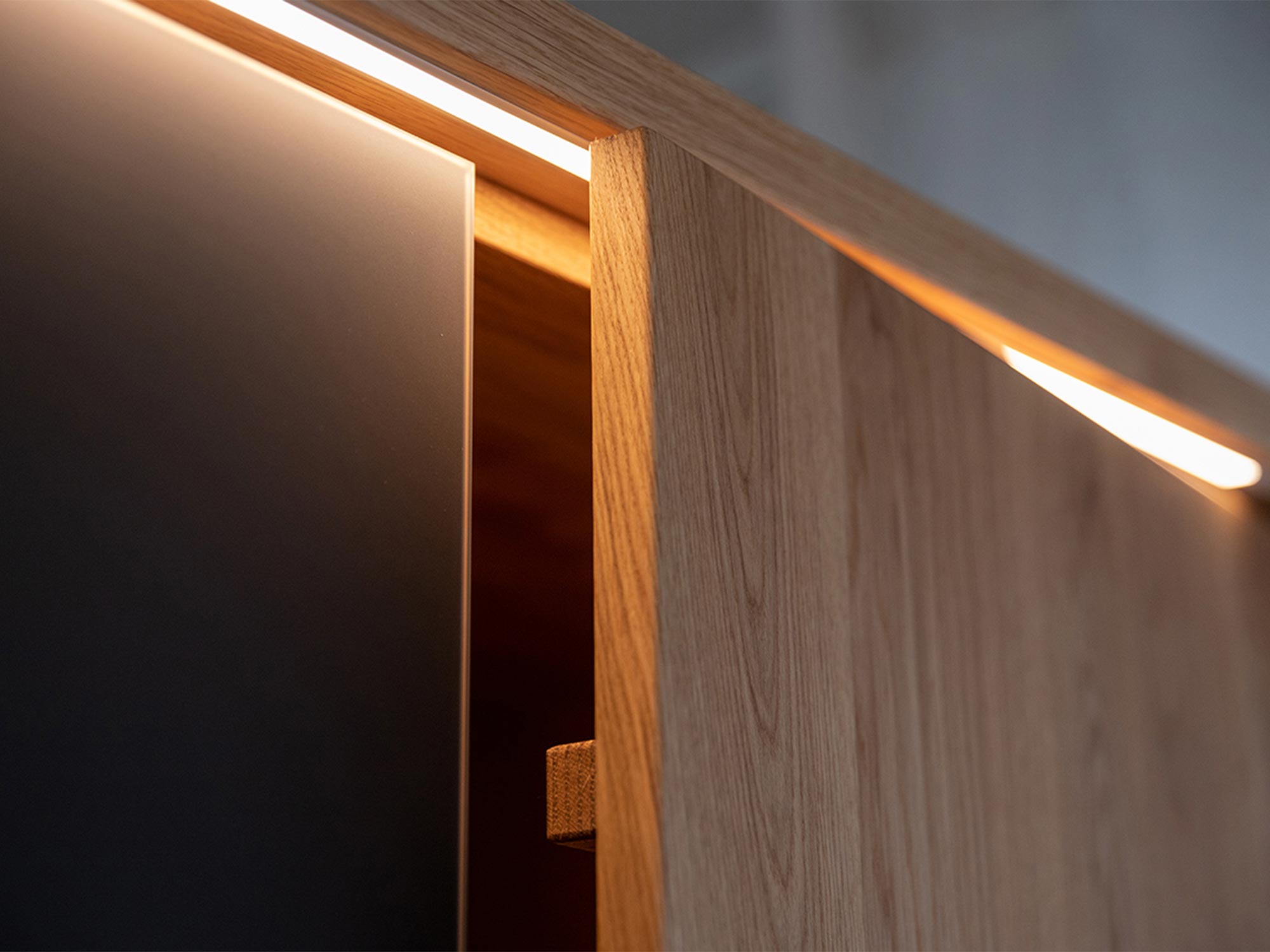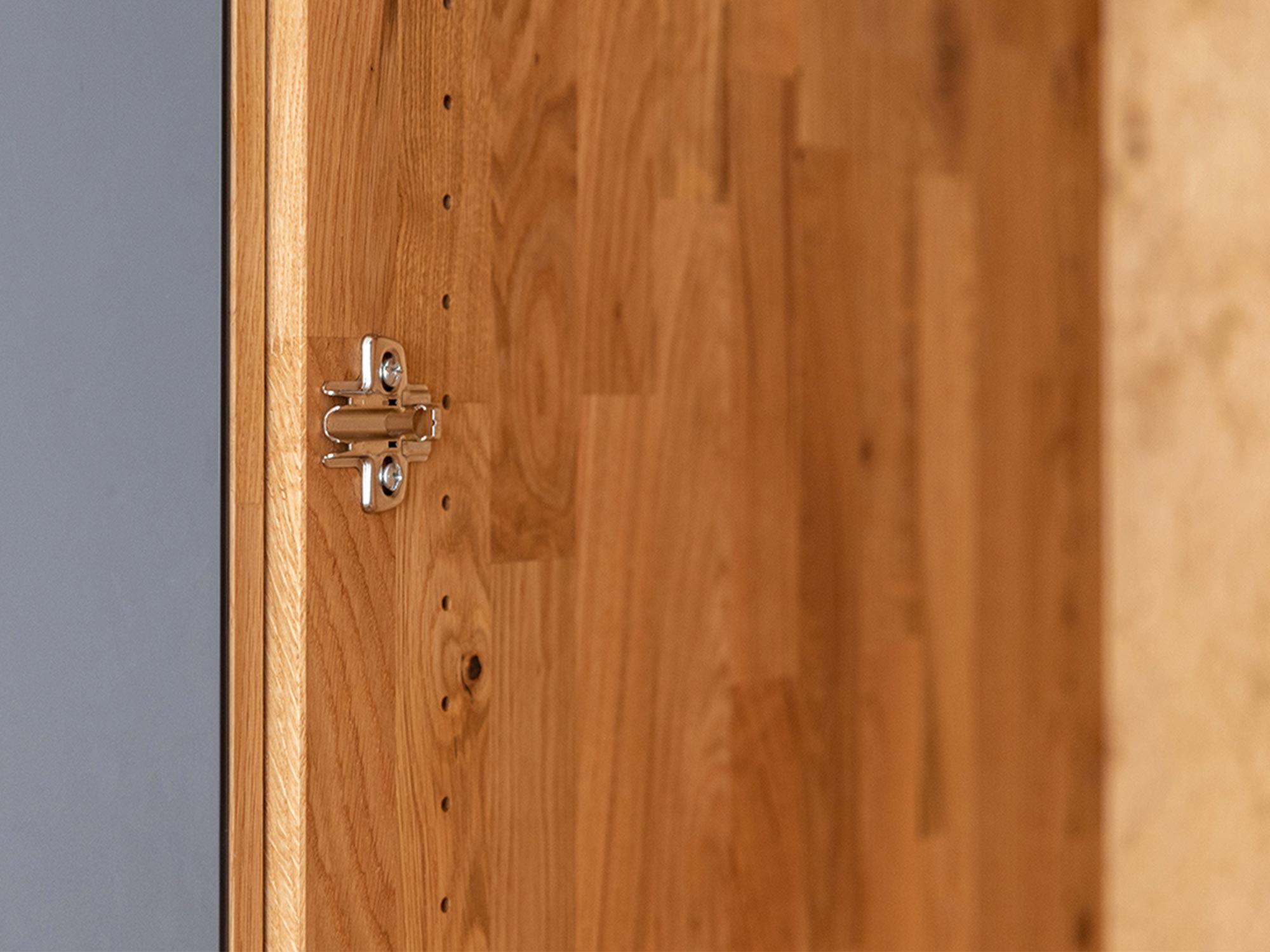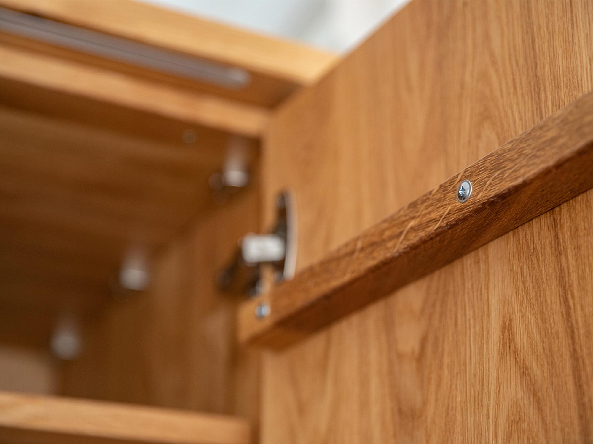 - Wysoka jakość wykonania: Szafa wykonana z naturalnego drewna dębowego, poddanego procesowi olejowania, co zapewnia trwałość i odporność na uszkodzenia.