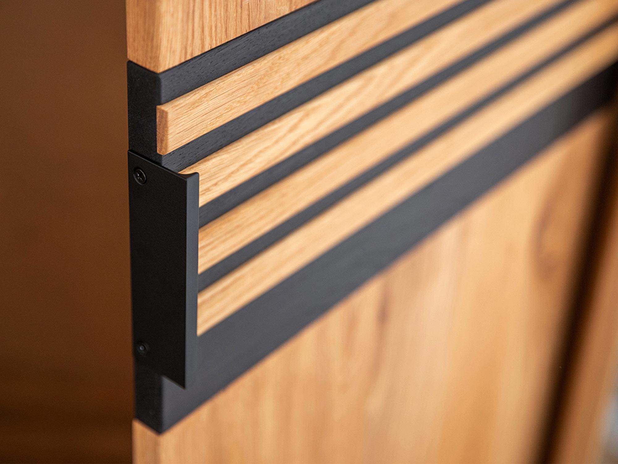 - Nowoczesny design: Połączenie ciepłej barwy drewna dębowego z czarnymi lamelami tworzy wyjątkowy i stylowy mebel.