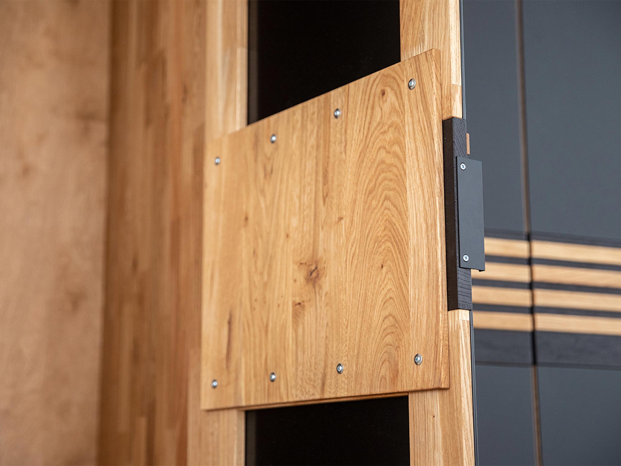 - Wysoka jakość wykonania: Szafa wykonana z drewna dębowego, poddanego procesowi olejowania, co gwarantuje odporność na uszkodzenia i trwałość.