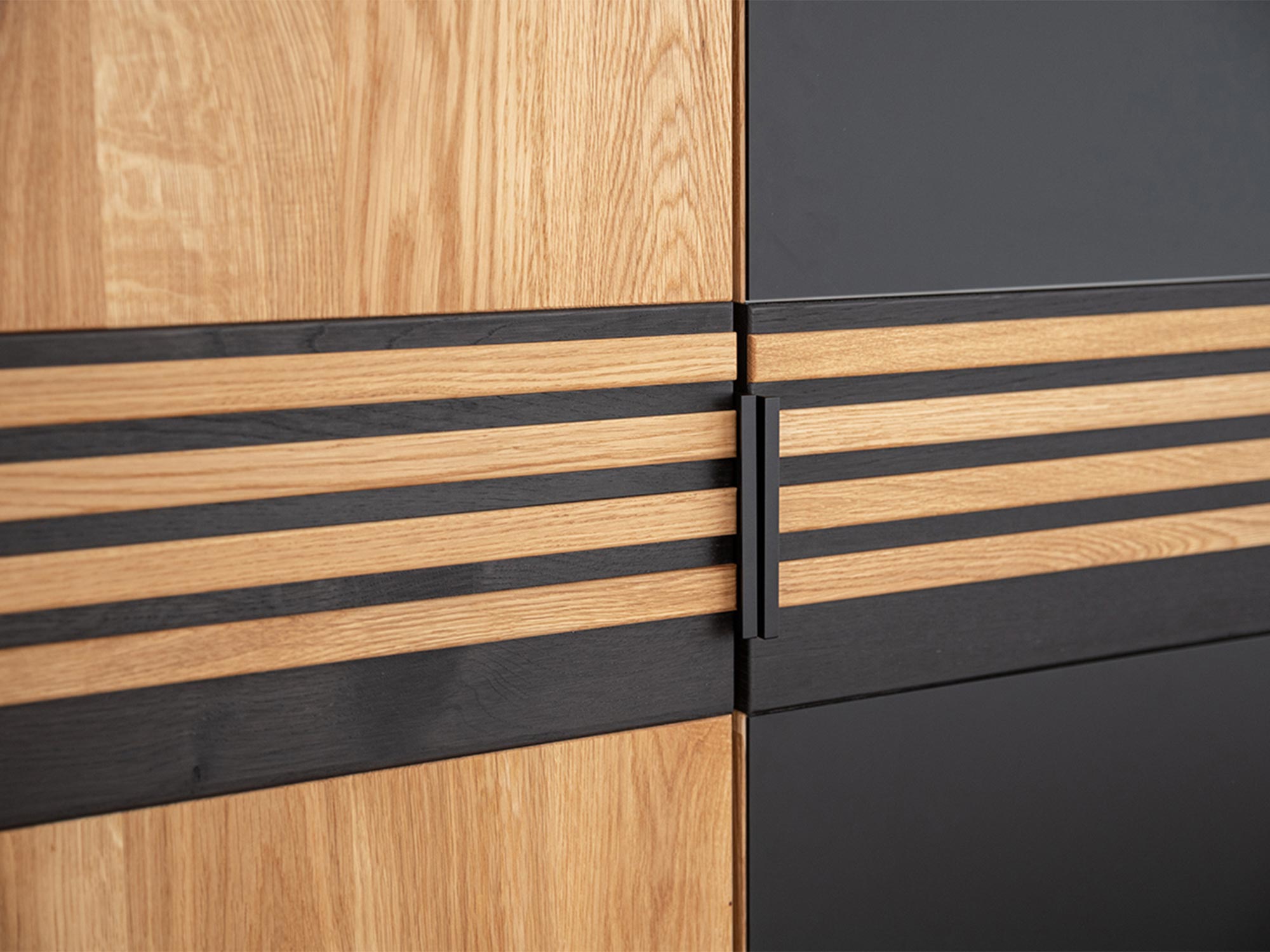 - Unikalny design: Oryginalne połączenie drewna z czarnym szkłem i lamelami nadaje szafie wyjątkowego charakteru.