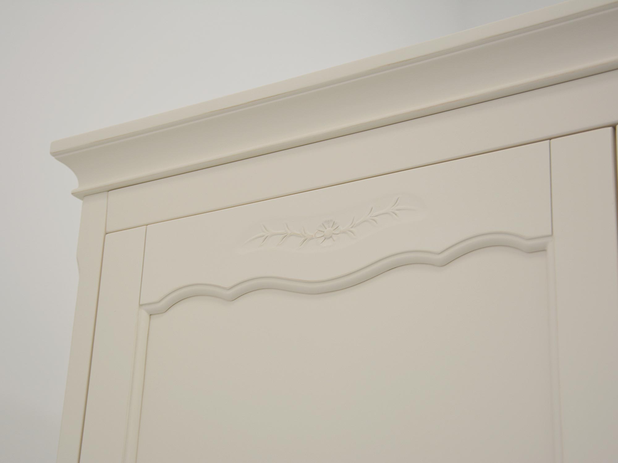 Klasyczna biała szafa z ozdobnymi frezami i wysokimi nóżkami