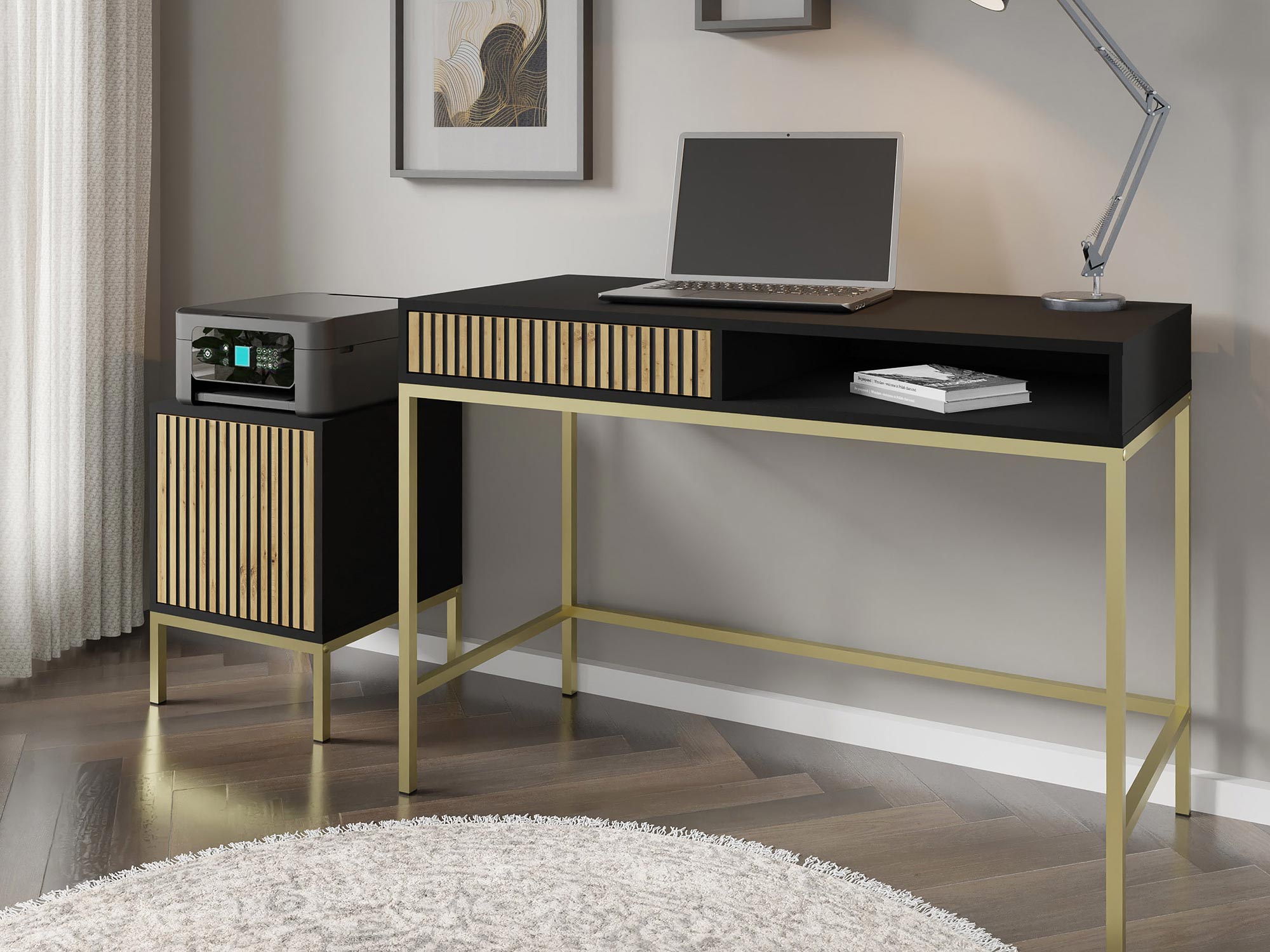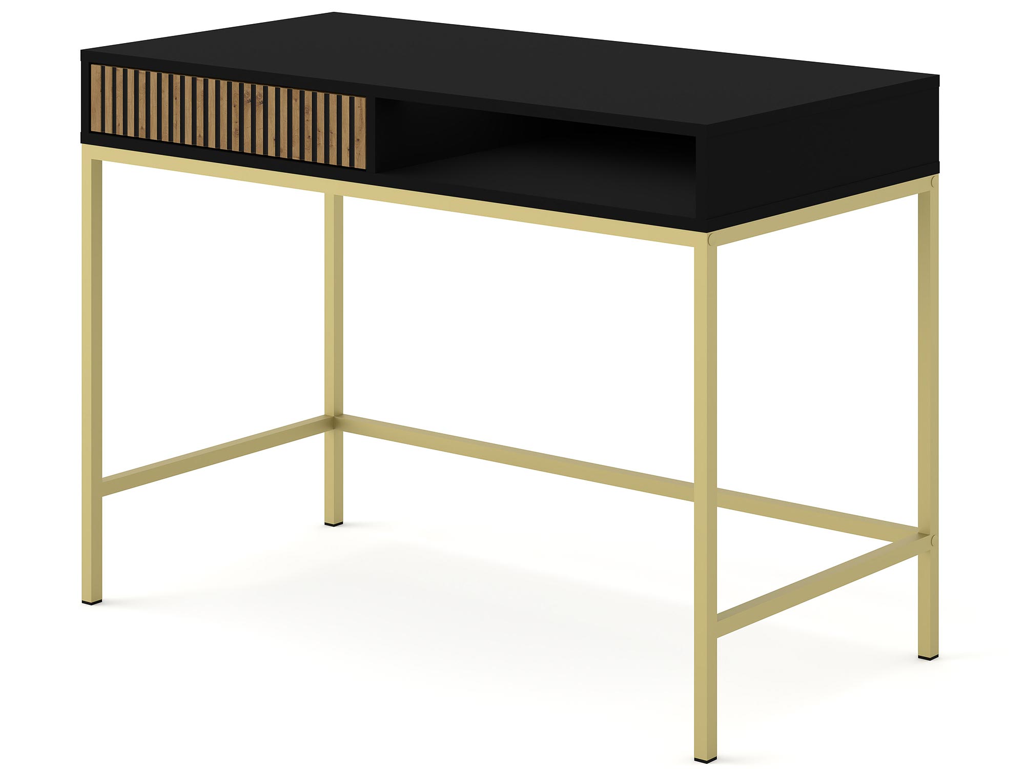 Stylowa Toaletka Navia z Praktyczną Półką wyróżnia się nowoczesnym wyglądem oraz solidnością wykonania. Korpus wykonany jest z płyty laminowanej, co zapewnia trwałość i odporność na codzienne użytkowanie. Fronty z frezowanej płyty MDF, malowane na elegancki kolor dębu artisan i czerni, dodają toaletce nowoczesności i klasy. Metalowe nogi w kolorze złotym podkreślają wyrafinowany charakter mebla i dodają mu lekkości.