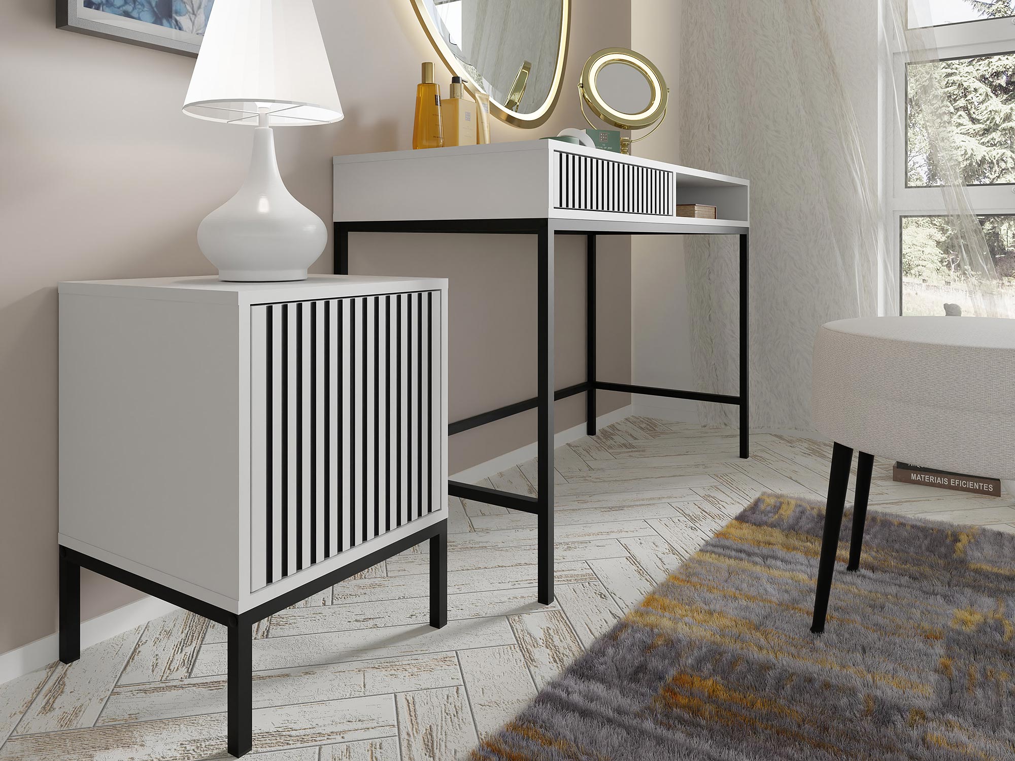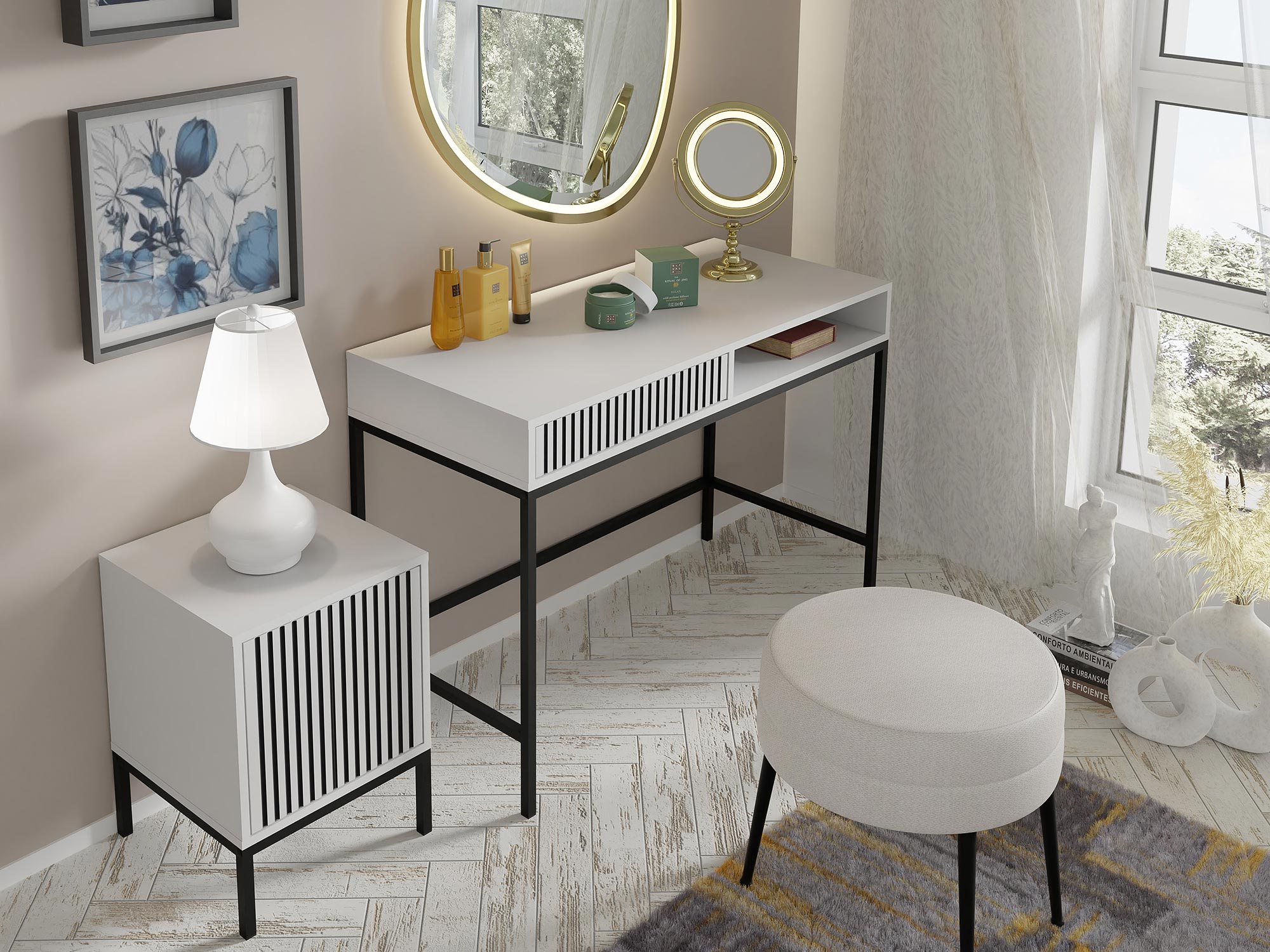Stylowa Toaletka Navia z Praktyczną Półką to wyjątkowy mebel, który łączy elegancję z funkcjonalnością. Dzięki swojemu nowoczesnemu designowi i przemyślanej konstrukcji, ta toaletka stanie się niezastąpionym elementem Twojej sypialni, wprowadzając do niej nutę luksusu i wygody. Zaprojektowana z myślą o codziennym użytkowaniu, jest idealnym rozwiązaniem dla osób ceniących sobie zarówno styl, jak i praktyczność.