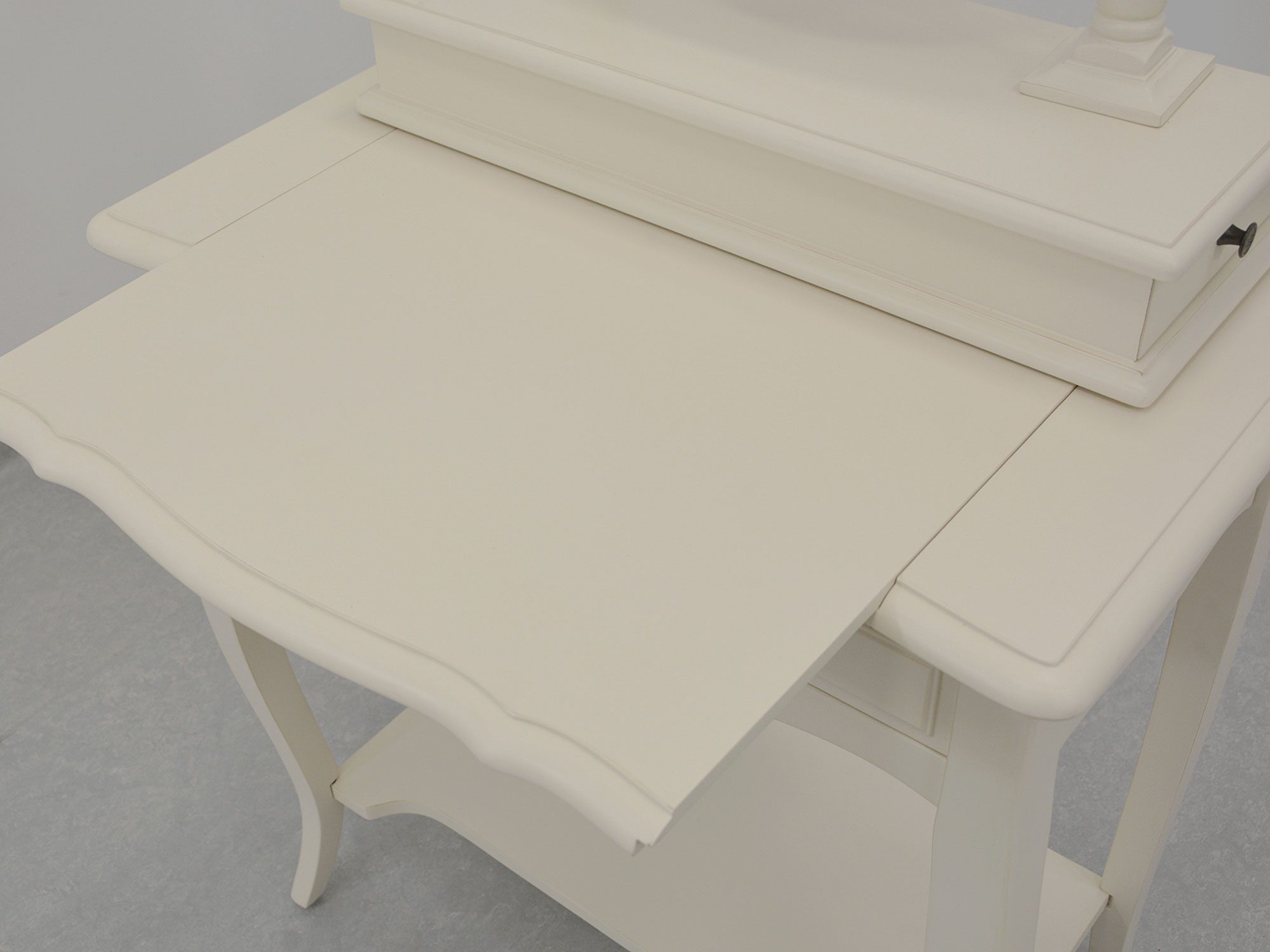 Szuflady w białej toaletce w stylu prowansalskim z dekoracyjnym frezowaniem