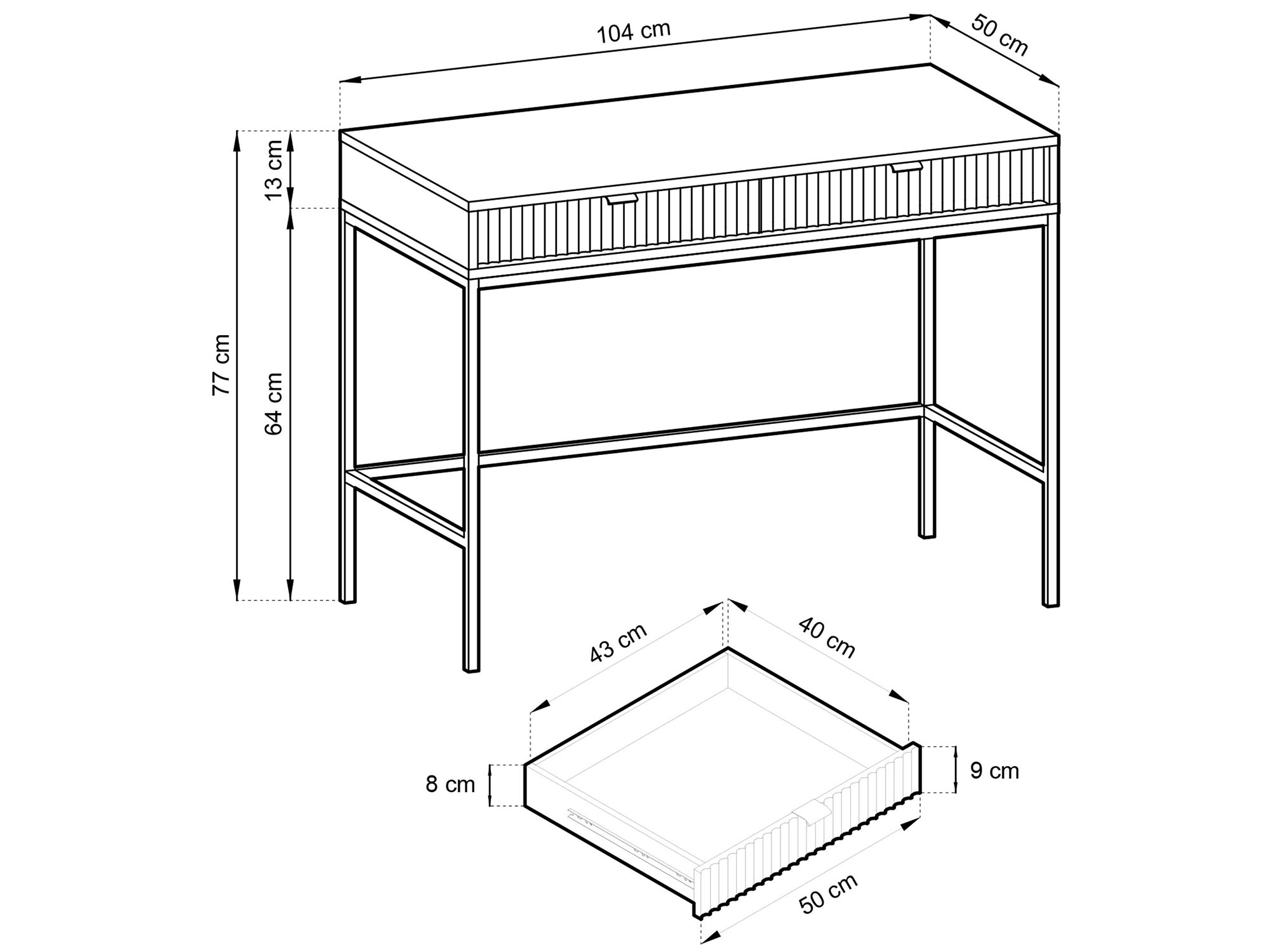 Głębokość: 50 cm / Szerokość: 104 cm / Wysokość: 77 cm