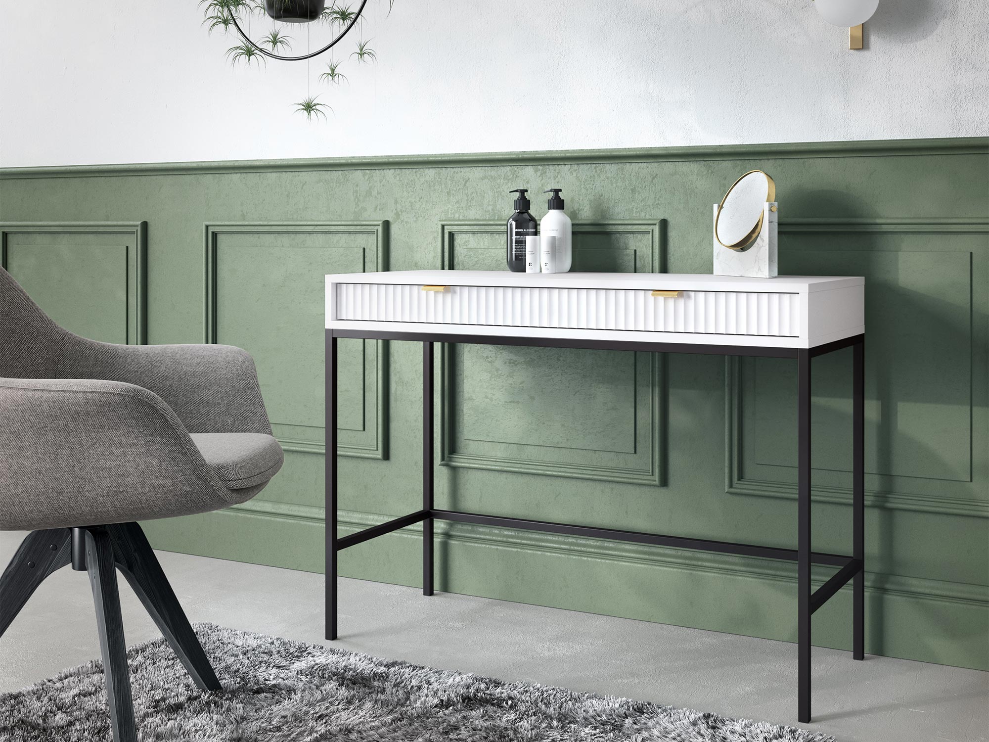 Elegancka i subtelnym designem, toaletka Sivas jest perfekcyjnym uzupełnieniem nowoczesnych wnętrz. Złote uchwyty na krawędziach ryflowanych frontów dodają luksusu i klasy, podkreślając jednocześnie indywidualny charakter każdej wersji kolorystycznej. Delikatna podstawa, dostępna w czarnej lub złotej wersji, zapewnia stabilność i dodaje lekkości konstrukcji.