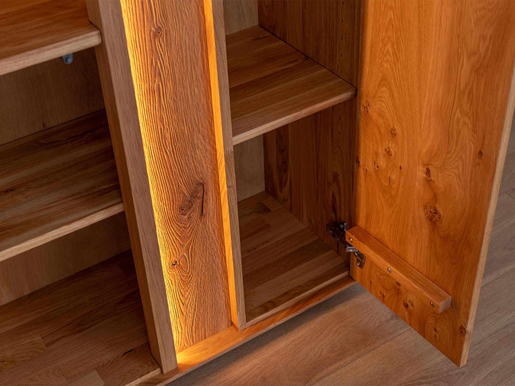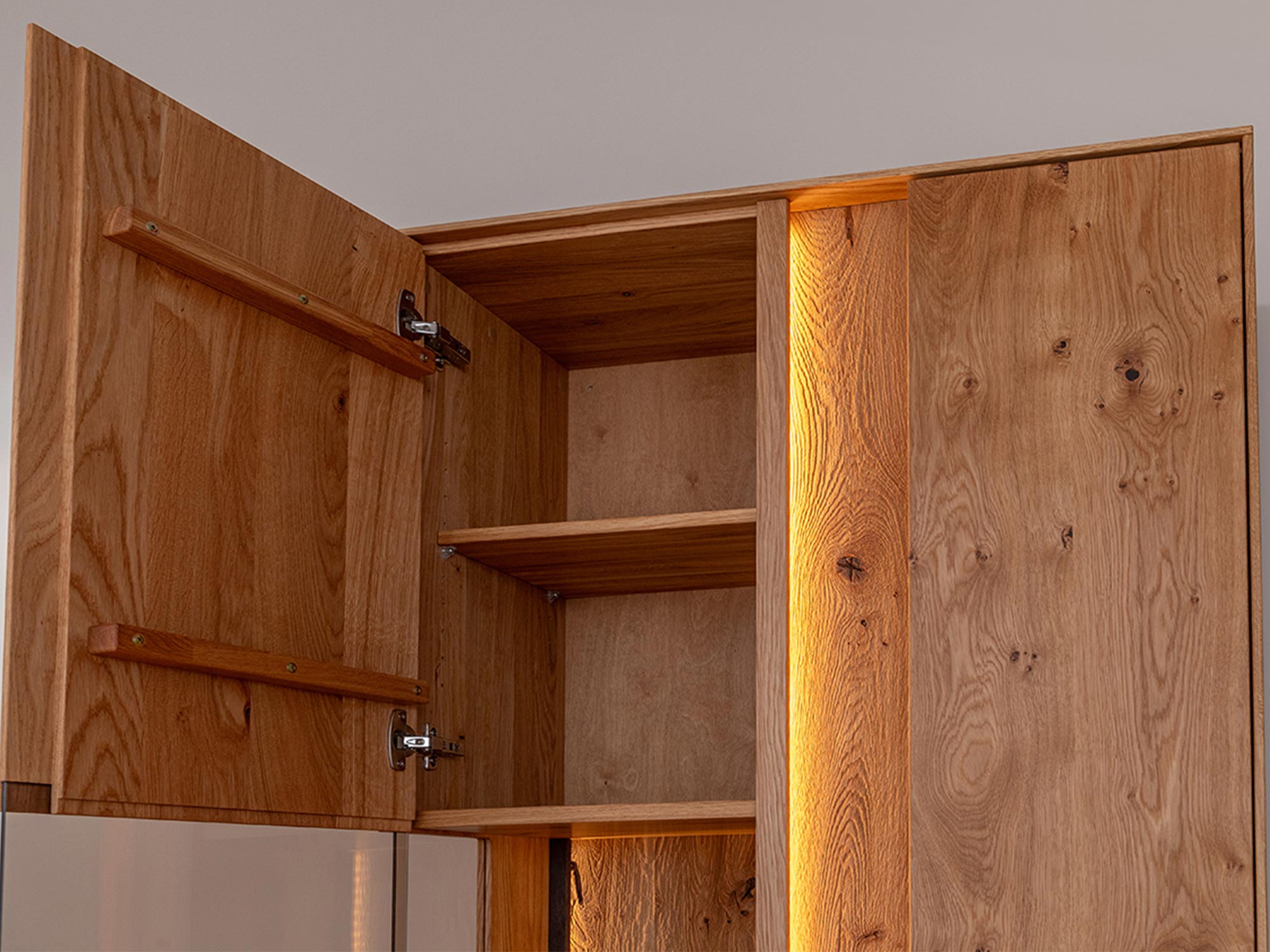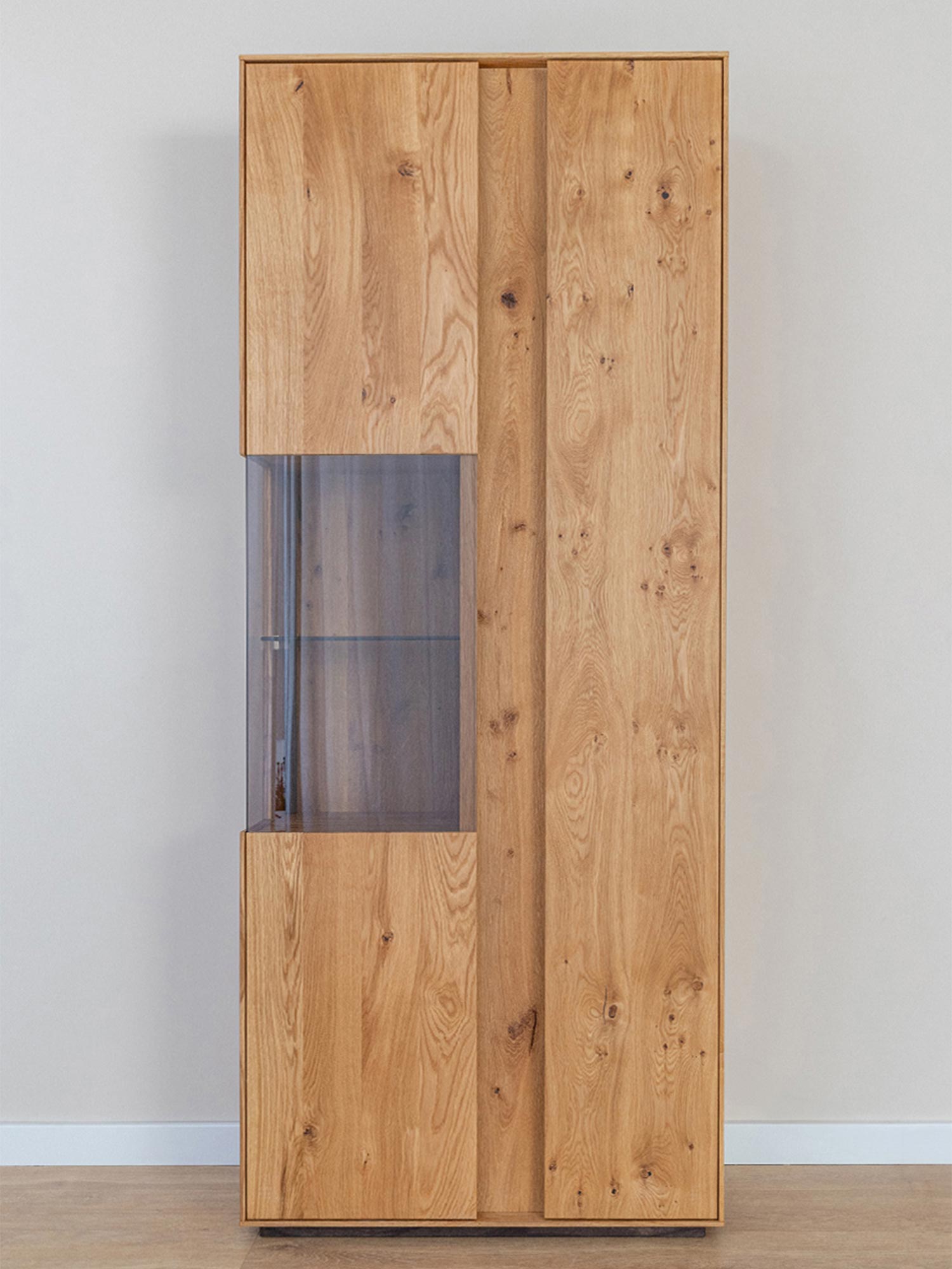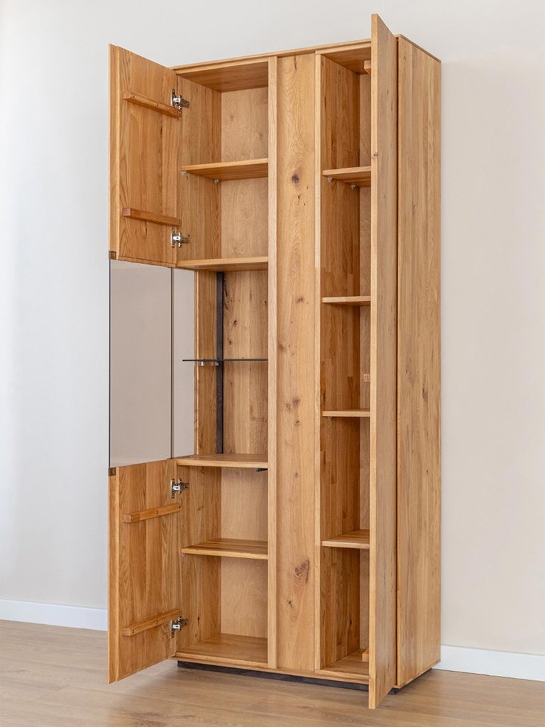 Dębowa Podwójna Witryna Essentia została zaprojektowana z myślą o maksymalnej funkcjonalności i estetyce. Z jednej strony posiada subtelne przeszklenie z umieszczoną szklaną półką, idealną do eksponowania wybranych przedmiotów. Z drugiej strony, pełny front zapewnia niezbędną intymność i dyskrecję, oferując miejsce na przechowywanie rzeczy, które mają pozostać poza zasięgiem wzroku gości. Taki przemyślany design sprawia, że witryna jest nie tylko praktyczna, ale również niezwykle estetyczna.