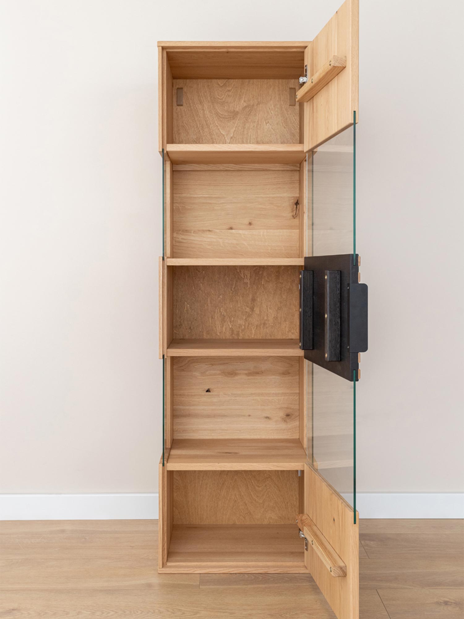 - Funkcjonalność– 4 półki i 1 drzwi zapewniają przestrzeń do przechowywania, a jednocześnie umożliwiają elegancką ekspozycję przedmiotów.