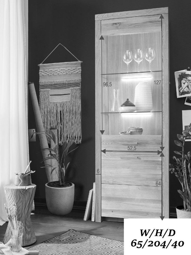 Witryna I do Salonu lub Jadalni Solis to elegancki mebel, który wprowadza do Twojego domu ciepło i przytulność naturalnego drewna dębowego. Oferuje ona również dużo miejsca na wyeksponowanie Twoich ulubionych przedmiotów dekoracyjnych, dzięki czemu Twój dom będzie mógł świecić indywidualnym charakterem.