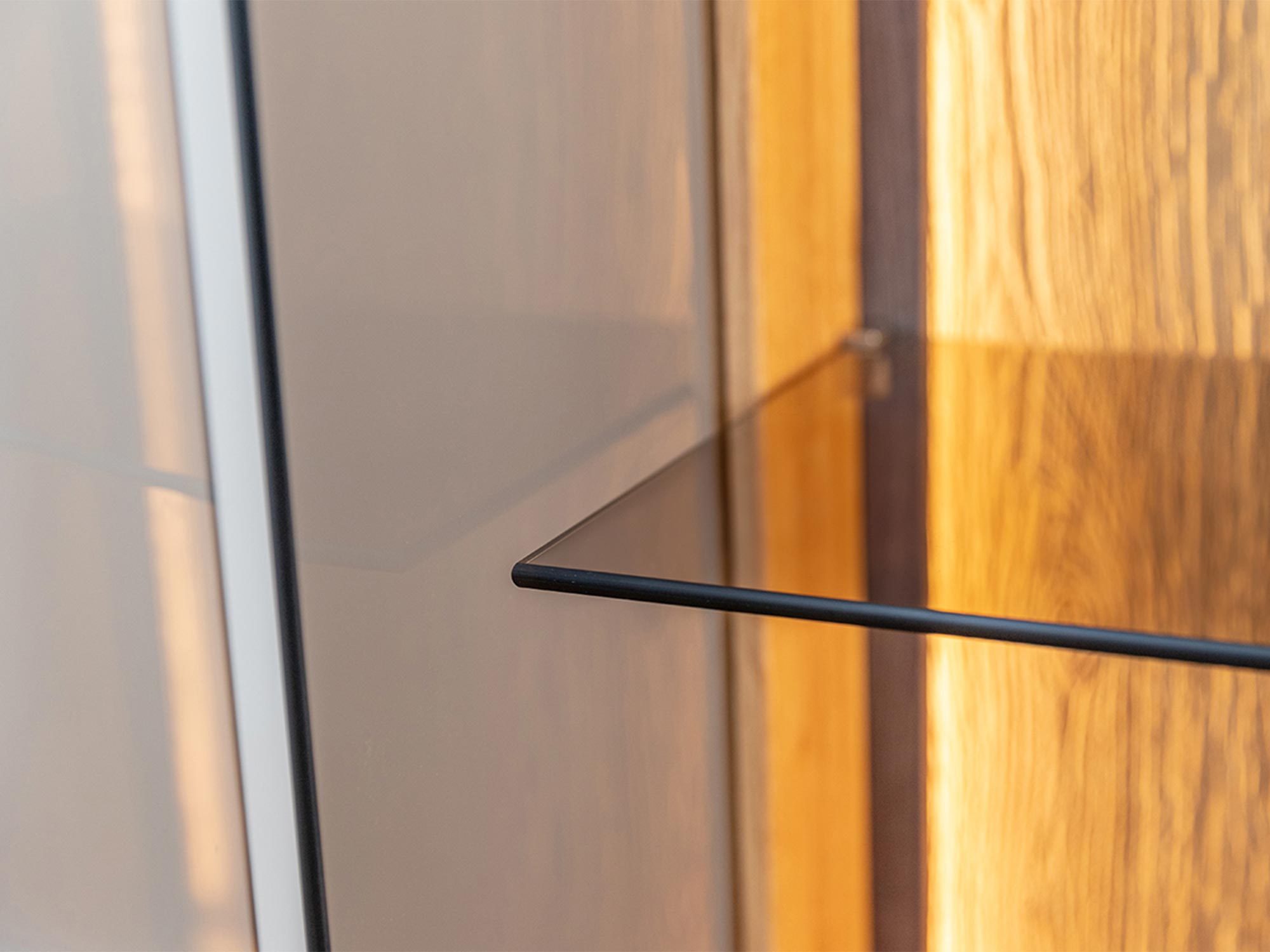 Zbliżenie na półkę z dębowym wykończeniem i szkłem