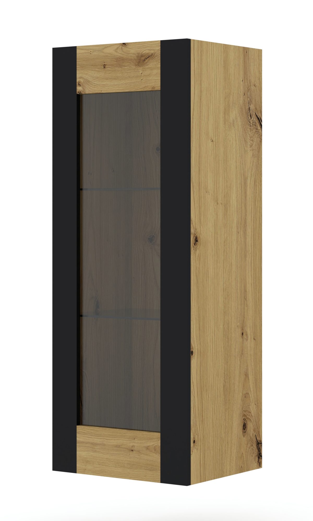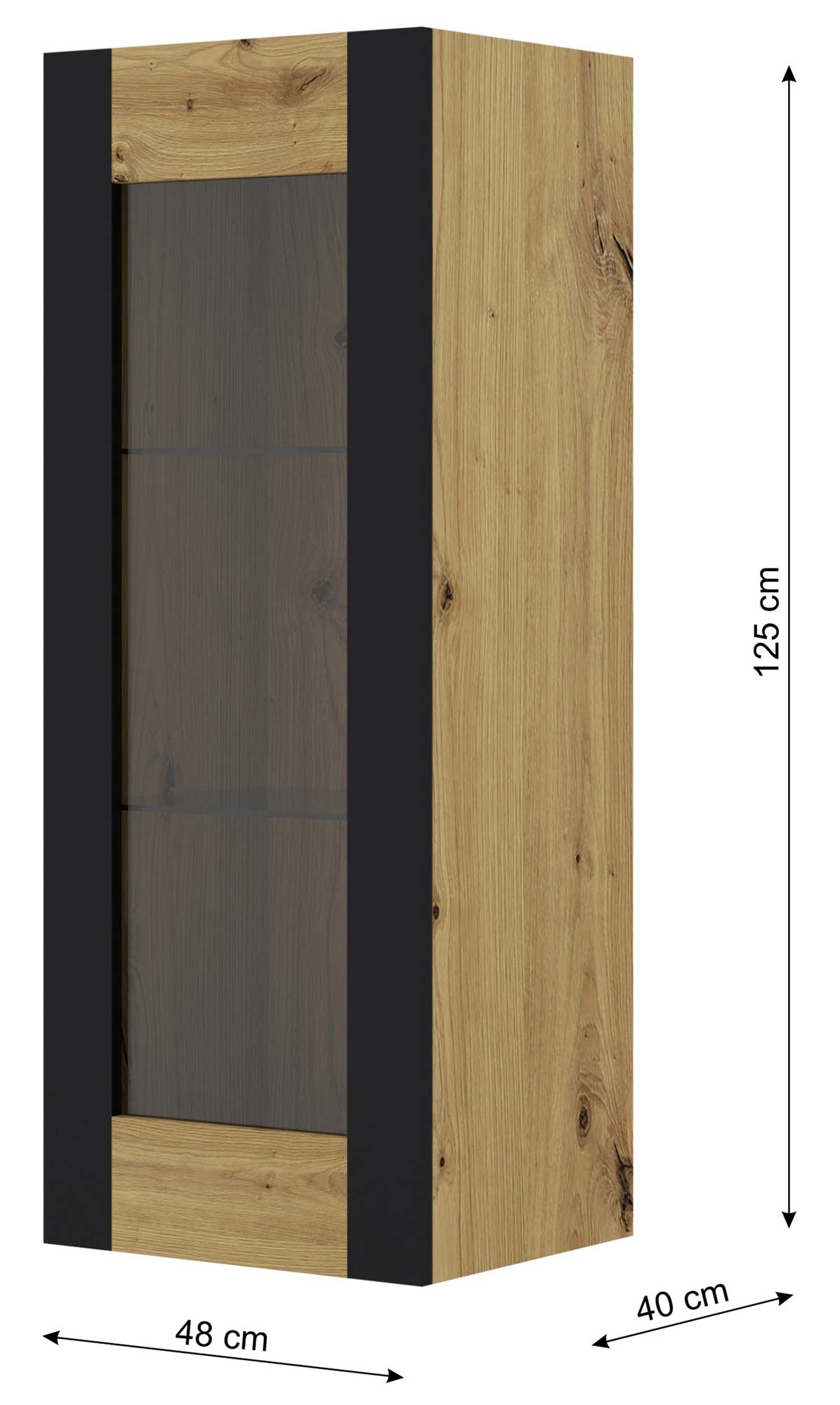 Co najważniejsze oferowana przeszklona witryna wisząca TAKOZ to znakomity element wystroju niejednego nowoczesnego salonu. Bez wątpienia nieszablonowe połączenie dwóch odcieni: czerni oraz dąb artisan przykuwa wzrok zachwycając nawet najbardziej wysublimowany gust. Co więcej jest to znakomity mebel do wyeksponowania domowej kolekcji szkła, pamiątek rodzinnych czy innych dekoracji. Dodatkowej elegancji dodają dwie szklane półki. Mebel zdecydowanie najlepiej odnajdzie się w aranżacjach w stylu industrialnym, rustykalnym oraz loftowym. Ponadto, witryna w połączeniu z innymi meblami z serii TAKOZ to świetne rozwiązanie dla stworzenia przytulnej, praktycznej i szykownej przestrzeni salonowej.