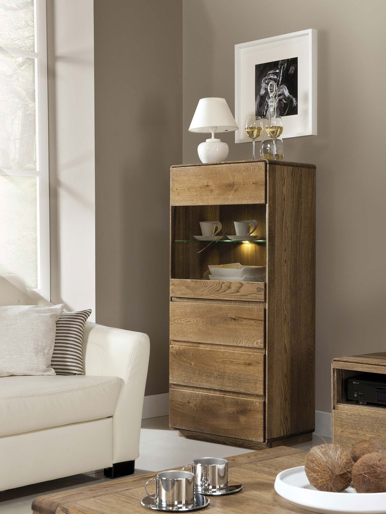 Nowoczesna witryna z szufladą i półkami LED, wykończenie dębowe