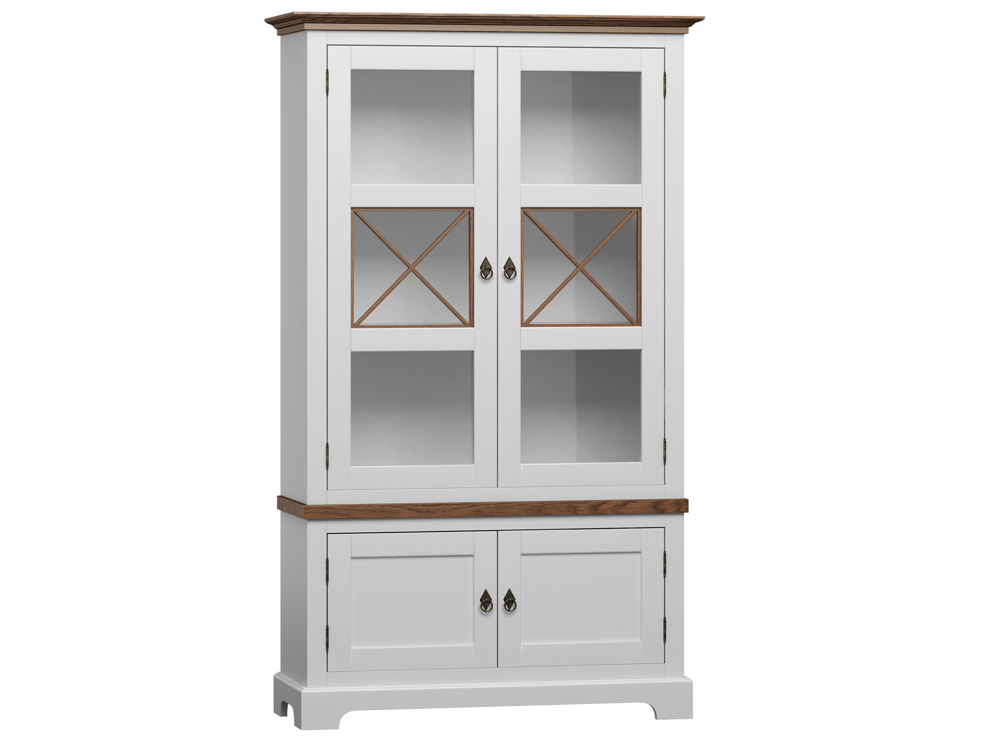 Biała witryna z przeszklonymi drzwiami i szufladami, styl prowansalski