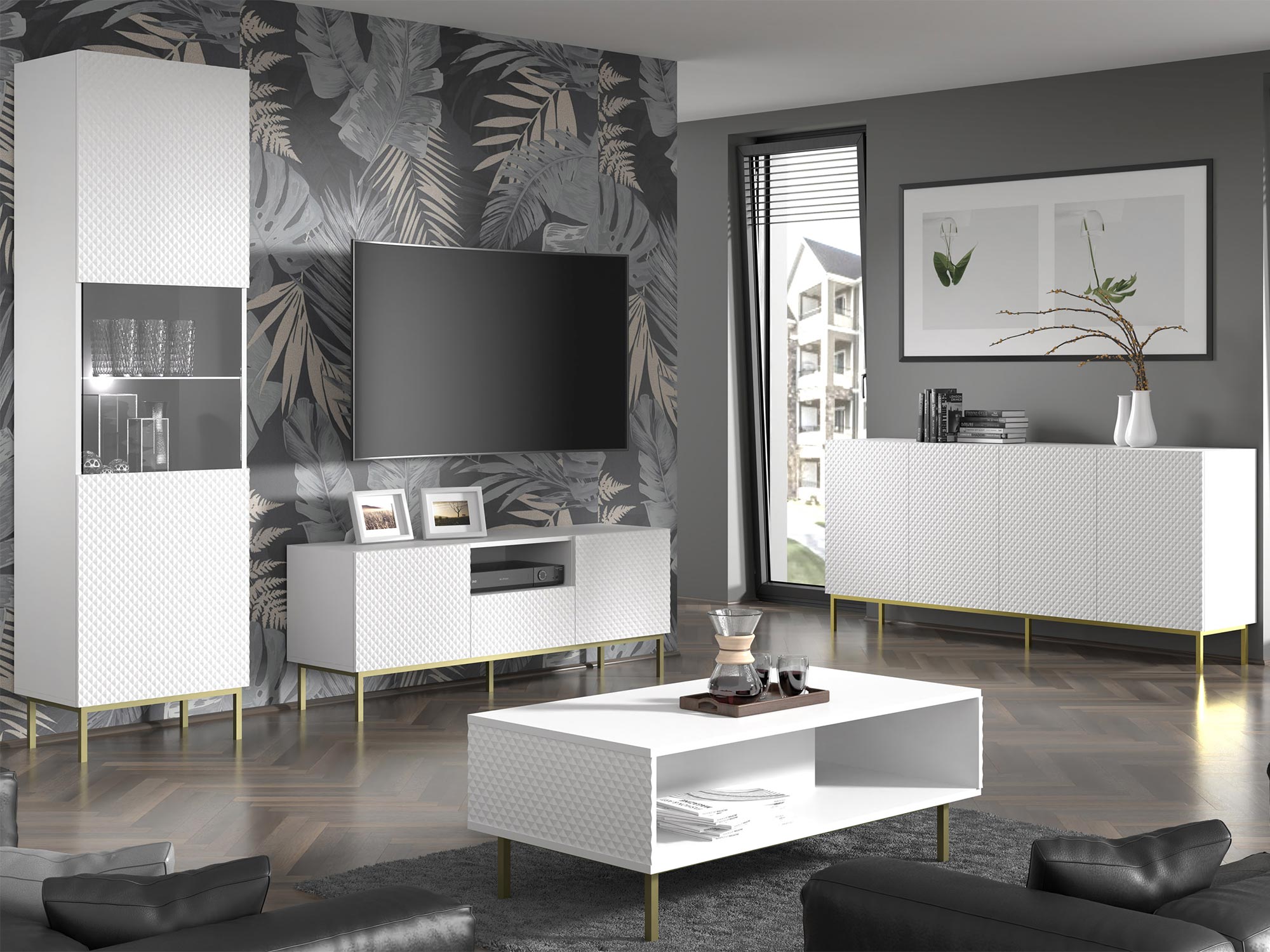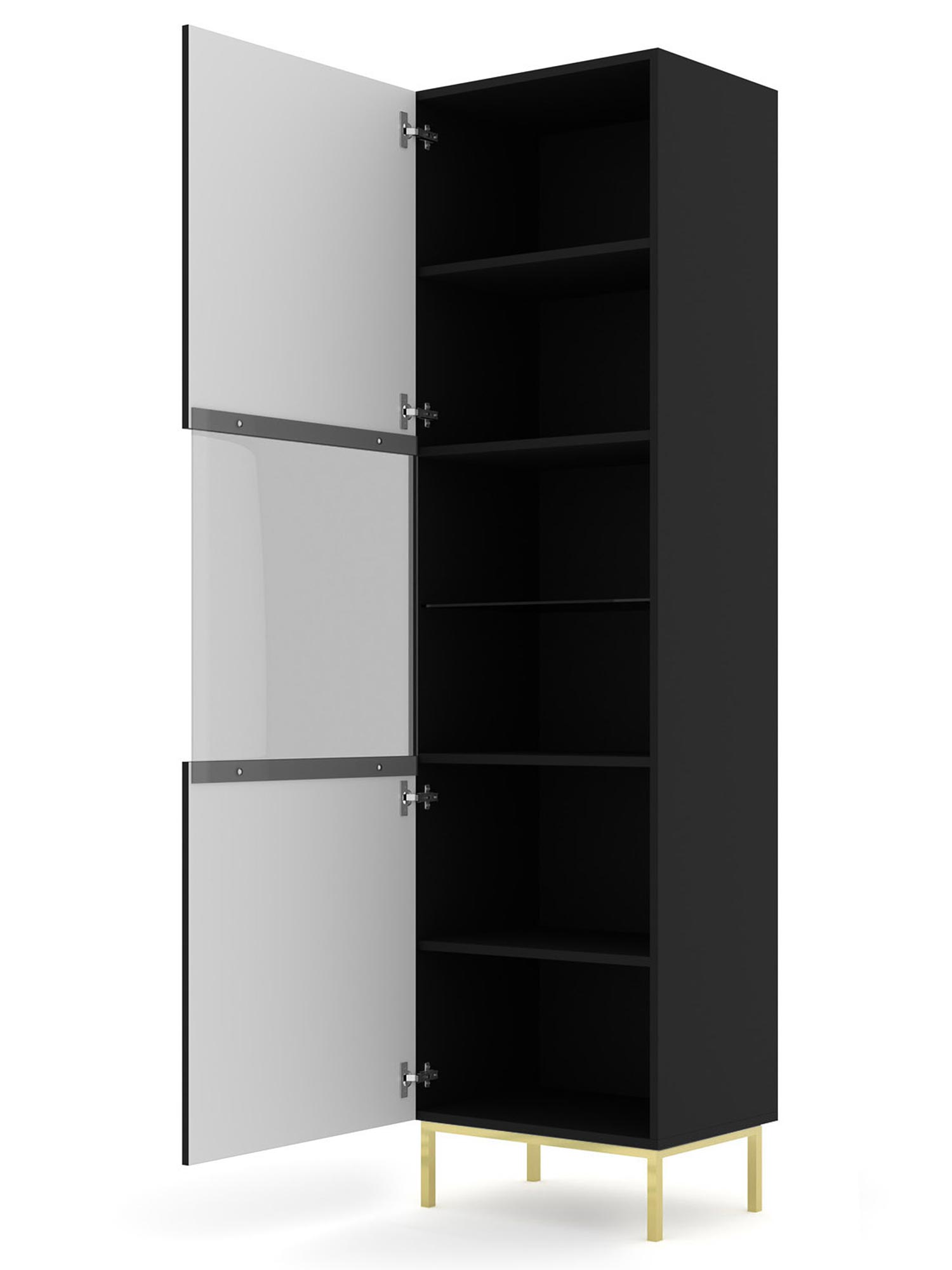 Witryna Navia z Frontami w Wysokim Połysku to mebel, który wprowadzi do Twojego wnętrza nowoczesność i elegancję. Biały matowy korpus i fronty w wysokim połysku dodają wnętrzu świeżości i wyrafinowania, a złote nóżki nadają mu luksusowego charakteru. Dzięki temu witryna Navia będzie doskonałym uzupełnieniem zarówno minimalistycznych, jak i bardziej klasycznych aranżacji, wnosząc do nich odrobinę nowoczesnego stylu. Dodatkowo, Każdy element Witryny Navia z Frontami w Wysokim Połysku został zaprojektowany z myślą o funkcjonalności. Półki zapewniają dużo miejsca do przechowywania, co pozwala na utrzymanie porządku i organizacji w Twoim wnętrzu.