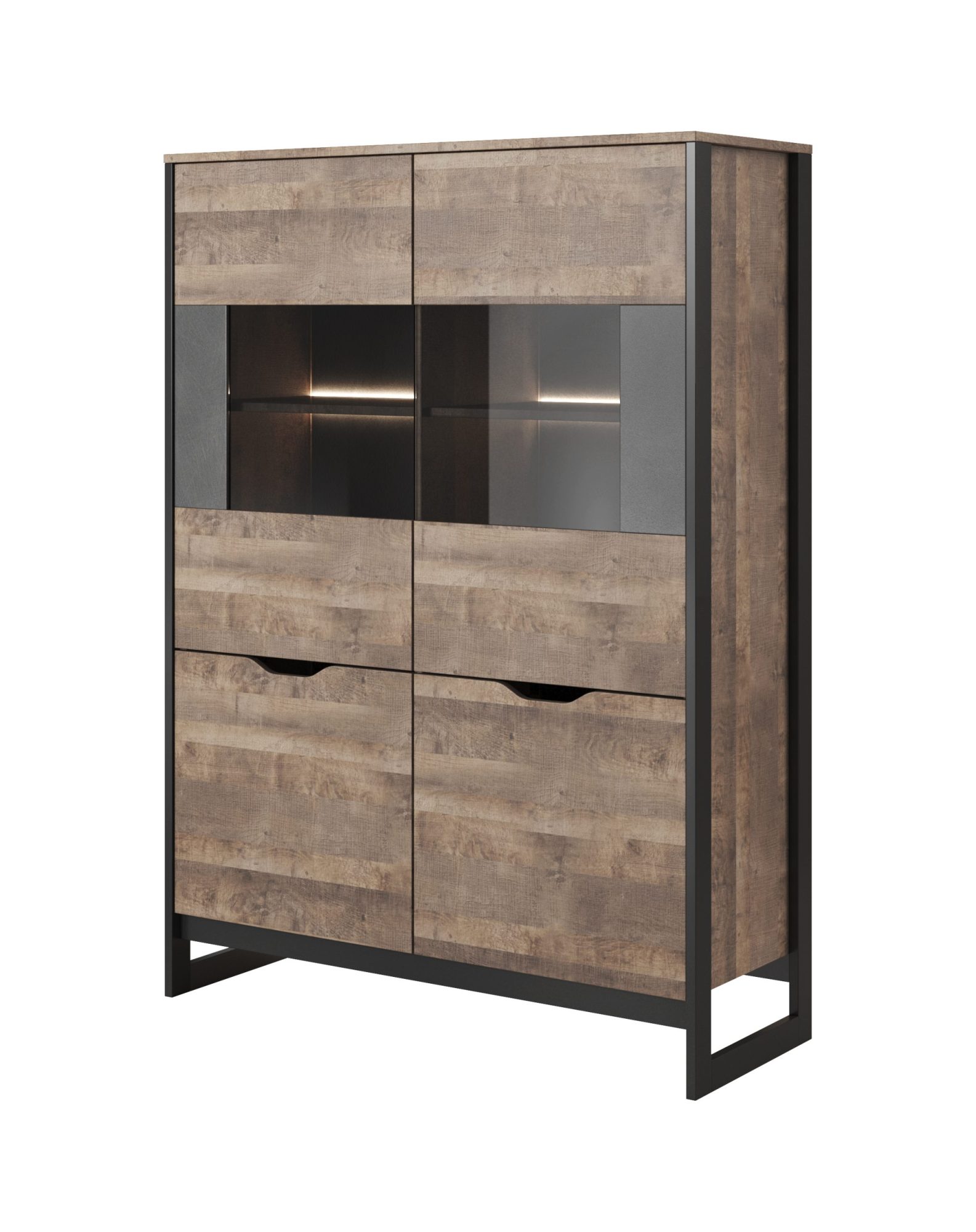 Komoda w stylu loft z przeszklonym frontem i czarną ramą