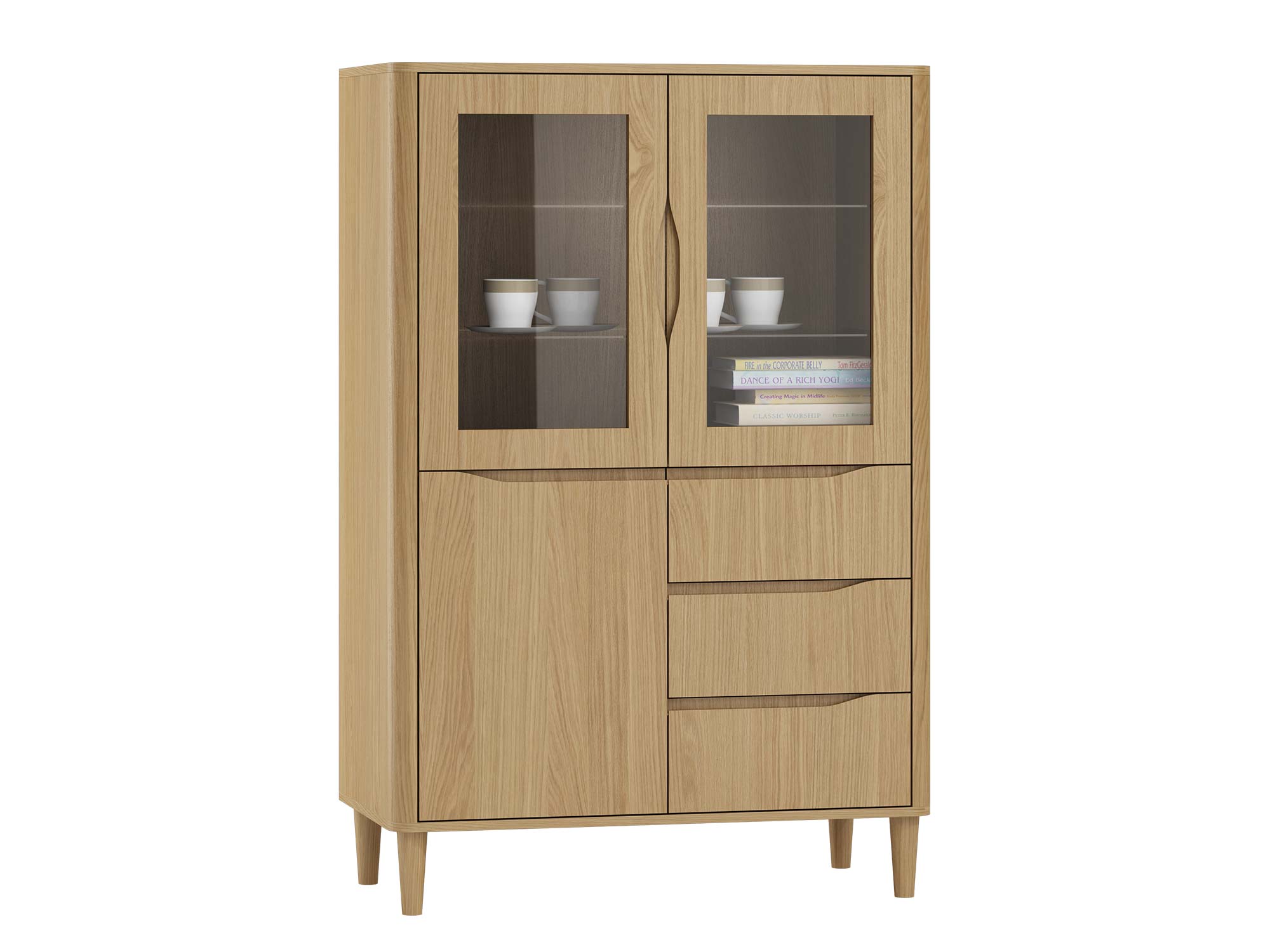 Zaokrąglone krawędzie bryły sprawiają, że mebel wygląda subtelniej i bardziej lekko, co doskonale wpisuje się w obecne trendy minimalistycznego designu. Funkcjonalne szuflady wyposażone w mechanizm soft close gwarantują wygodę i trwałość, a możliwość cichego domyku to dodatkowy atut, który doceni każdy użytkownik. Przemyślana konstrukcja zapewnia wygodne przechowywanie i eksponowanie tego, co najważniejsze – od książek, przez szkło, po dekoracyjne dodatki.