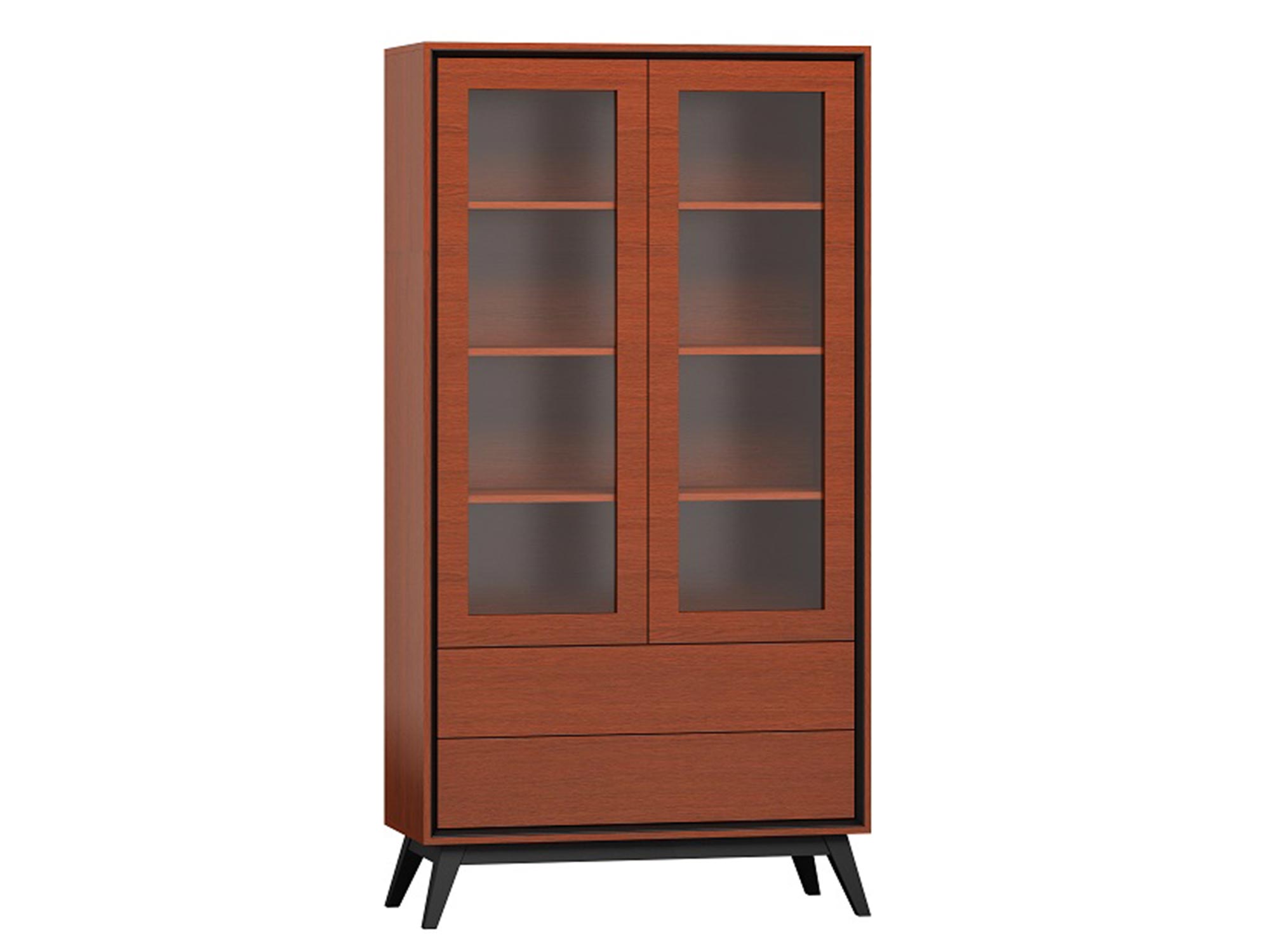 Nowoczesna witryna z przeszklonymi drzwiami, drewnianym korpusem i czarnymi metalowymi nogami do stylowego wnętrza